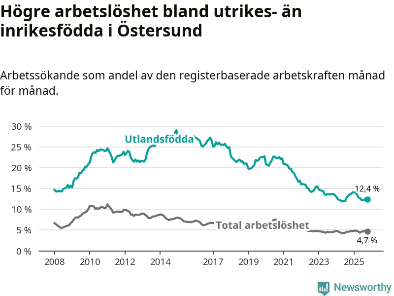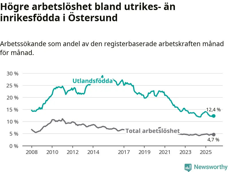 Arbetslösheten bland utlandsfödda var 12,4 procent i Östersund under oktober månad, motsvarande 563 av 4 540 personer. Det är 1,2 procentenheter färre än vid samma tidpunkt i fjol (−33 om man räknar personer).