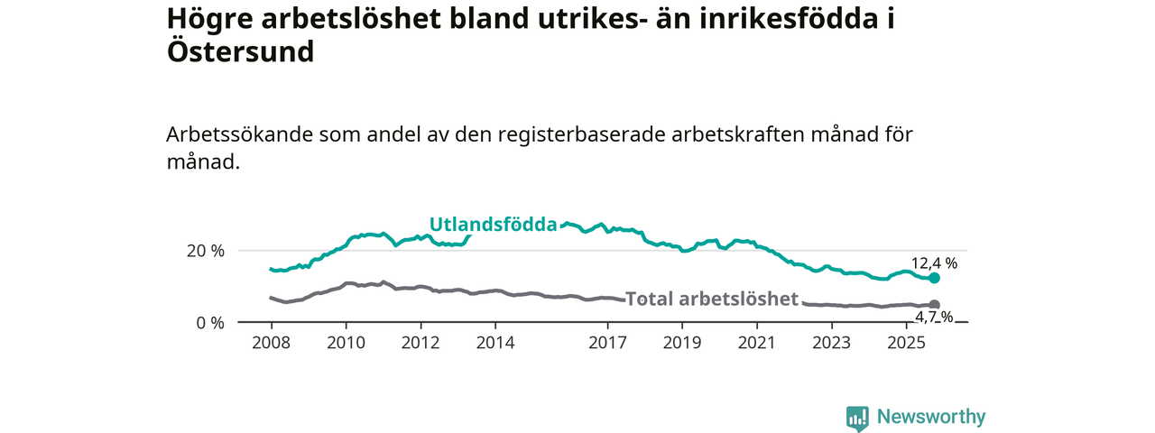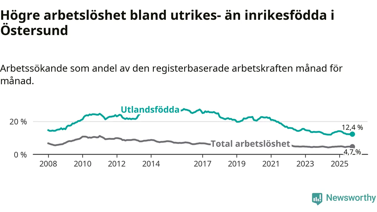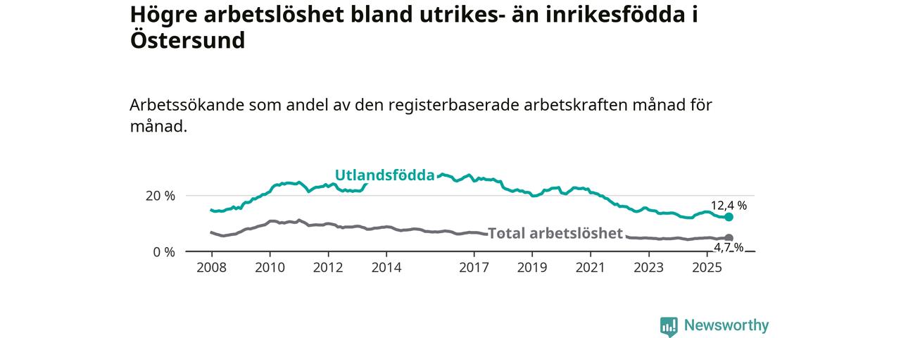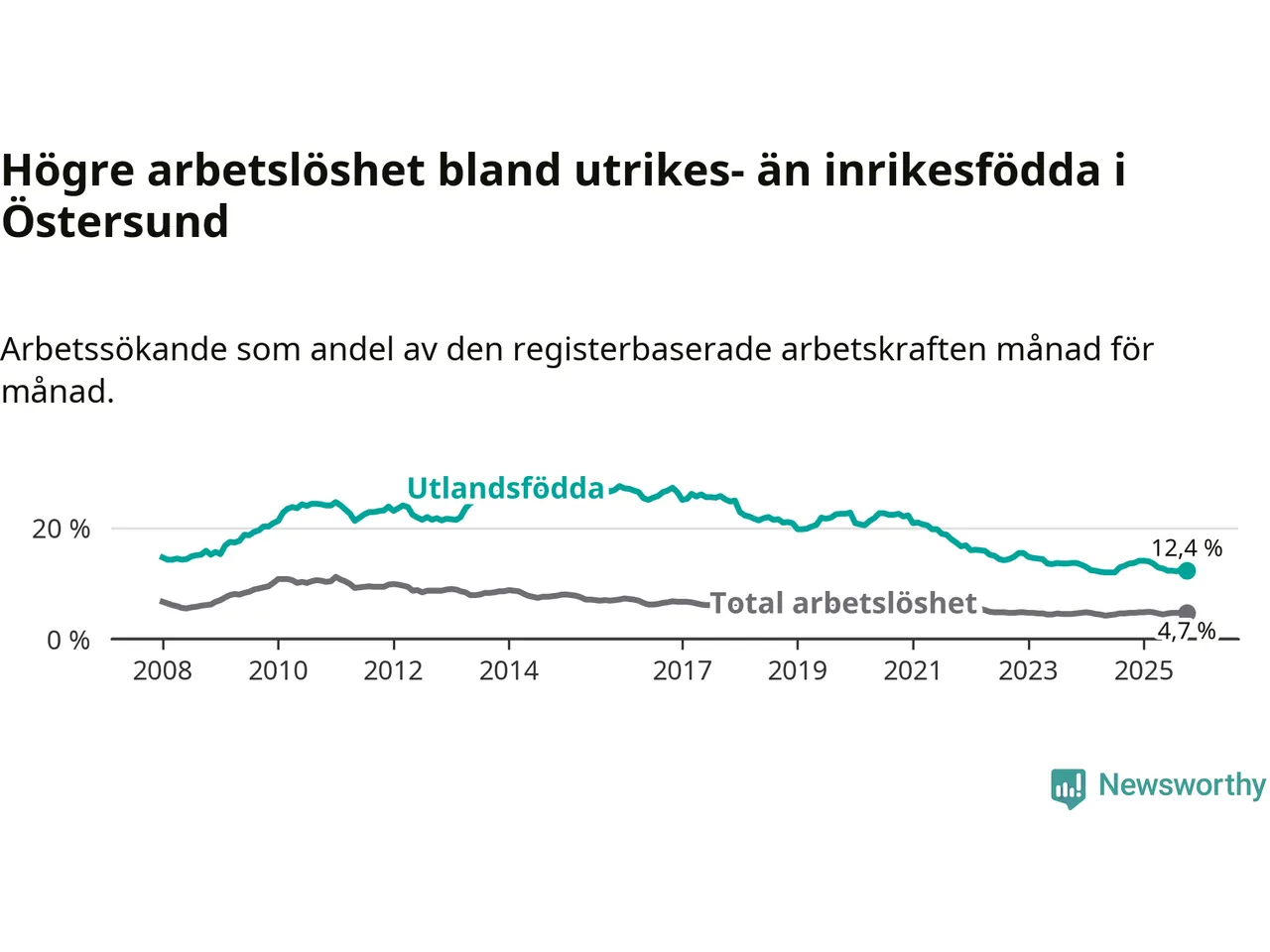 Skillnaden i arbetslöshet mellan utrikesfödda och hela befolkningen är 7,7 procentenheter i Östersund. Det är en mindre skillnad än för ett år sedan (−1,2 procentenheter).