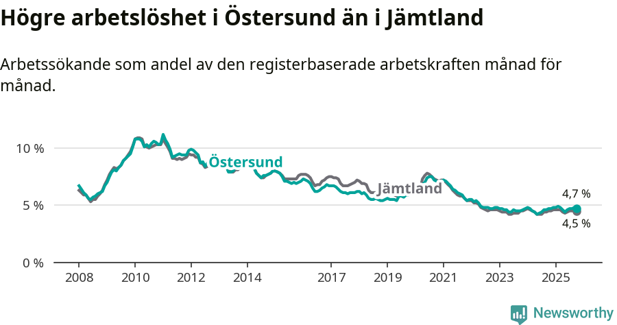 Arbetslösheten i Östersund ligger över nivån i hela Jämtlands län (4,7 procent i kommunen, jämfört med 4,5 procent i hela länet). Krokom har den lägsta arbetslösheten i länet (2,9 procent), medan Strömsund har den högsta (6,0 procent). För att Östersund skulle komma ner i samma arbetslöshetsnivå som Krokom skulle 585 personer behöva sysselsättas.