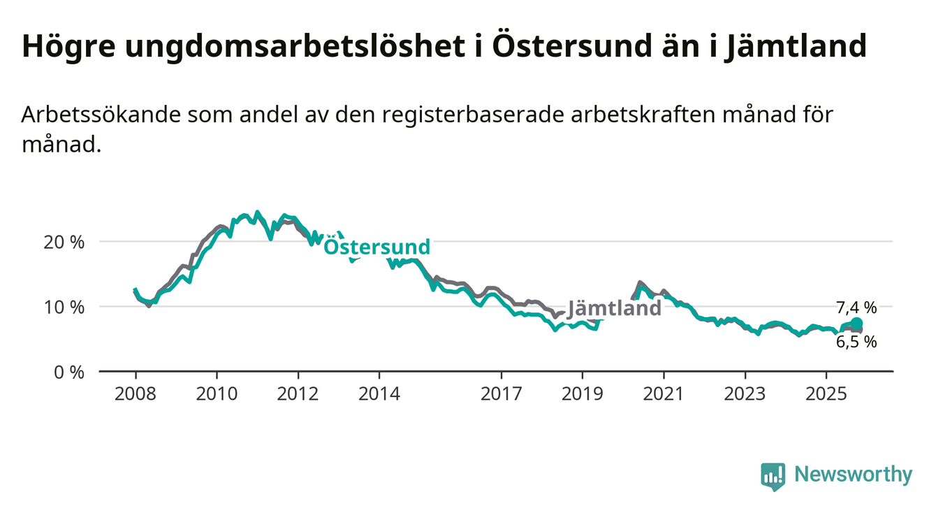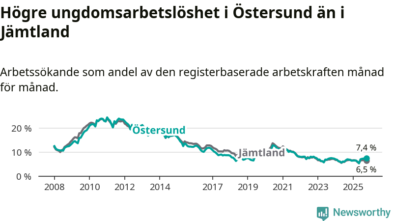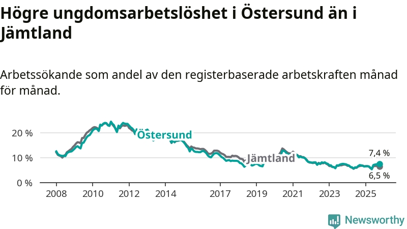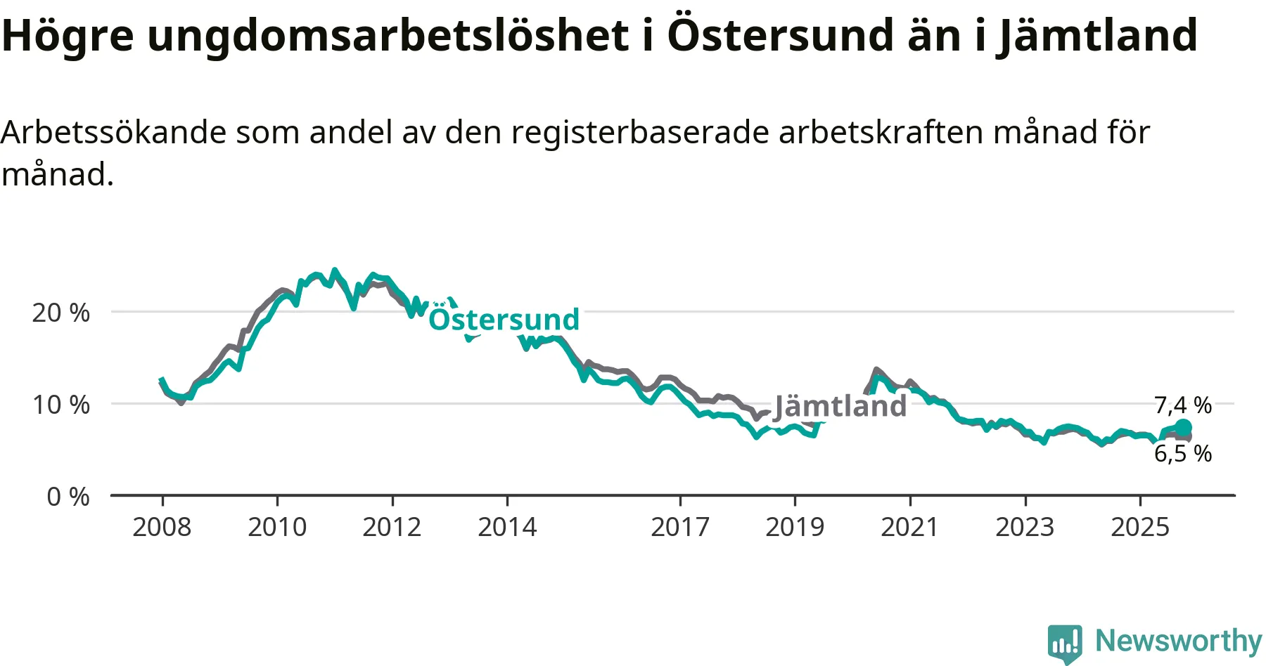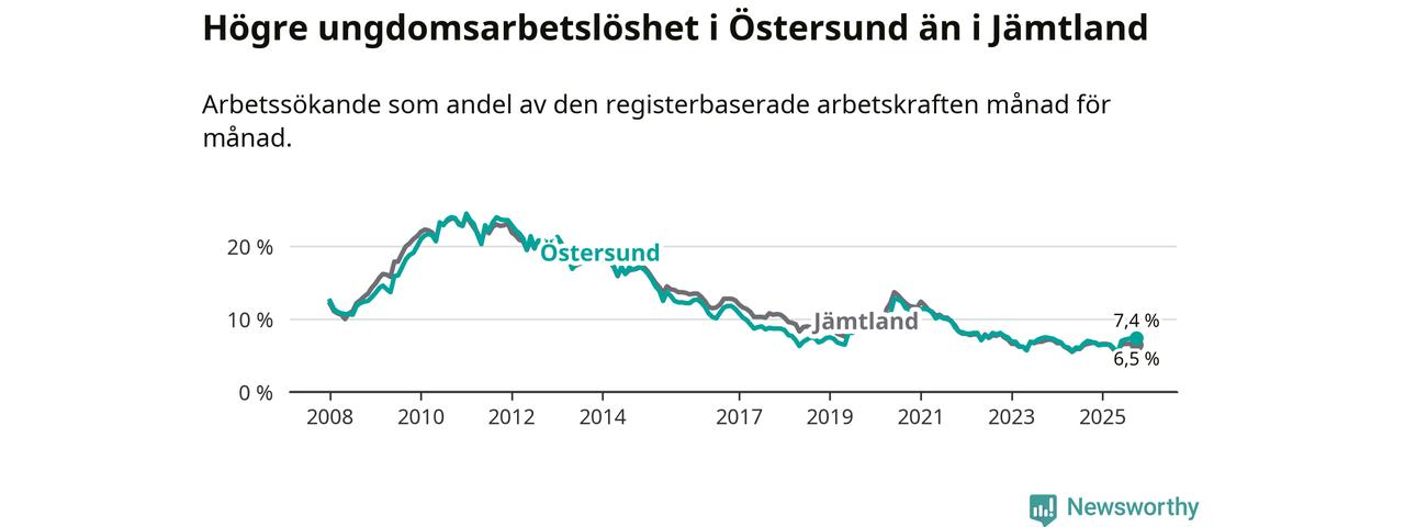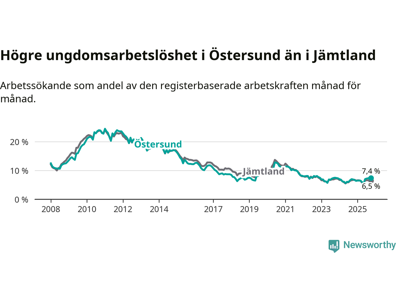 Precis som den totala arbetslösheten ligger ungdomsarbetslösheten i Östersund högre än i Jämtland som helhet. Skillnaden mellan kommunen och länet är 0,9 procentenheter.