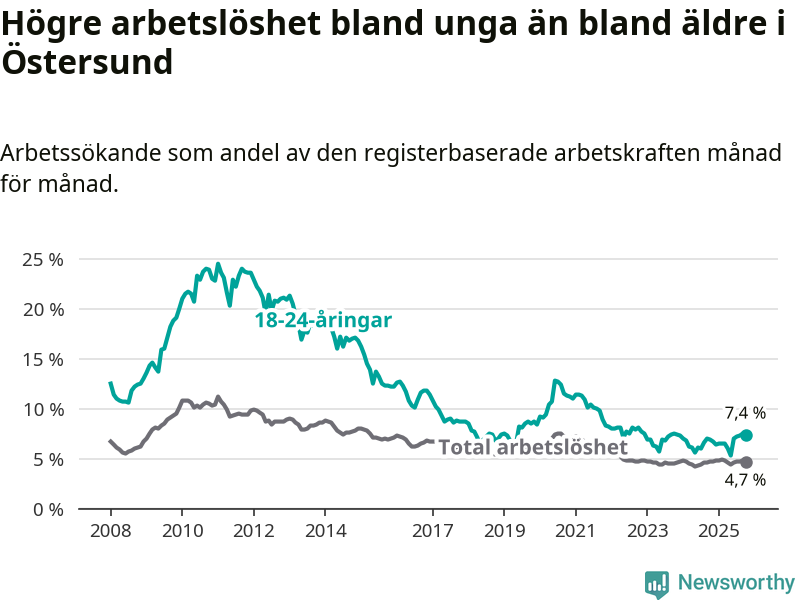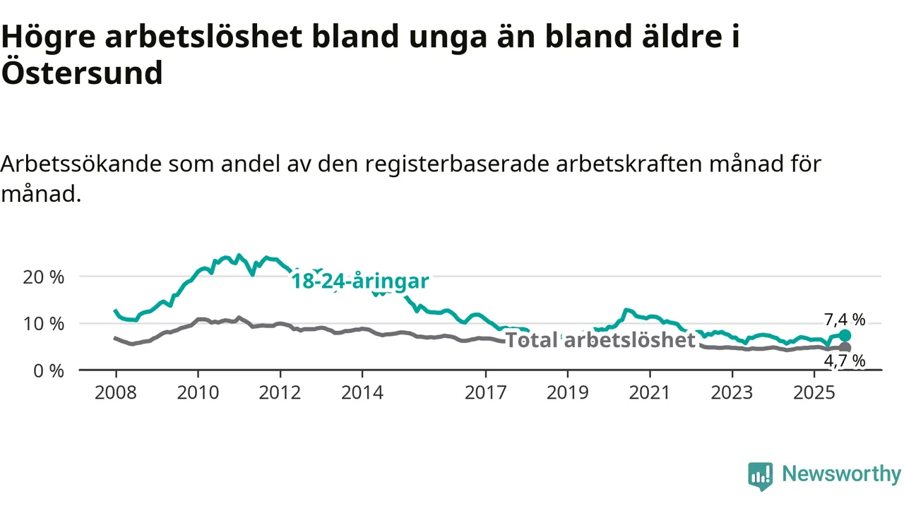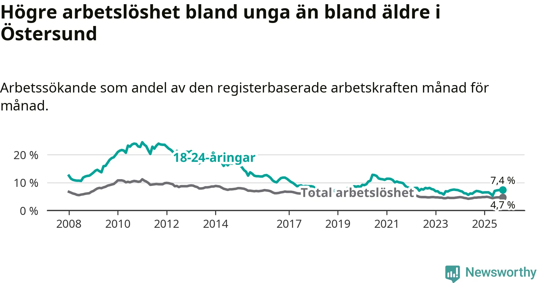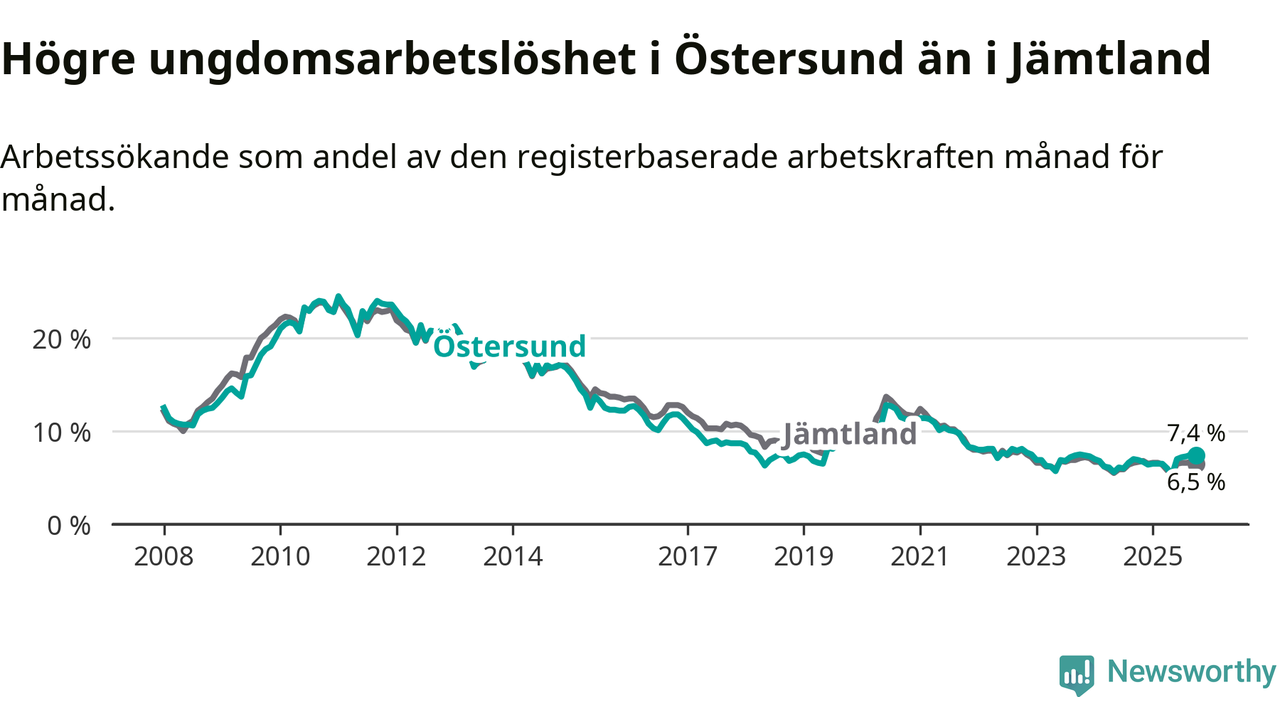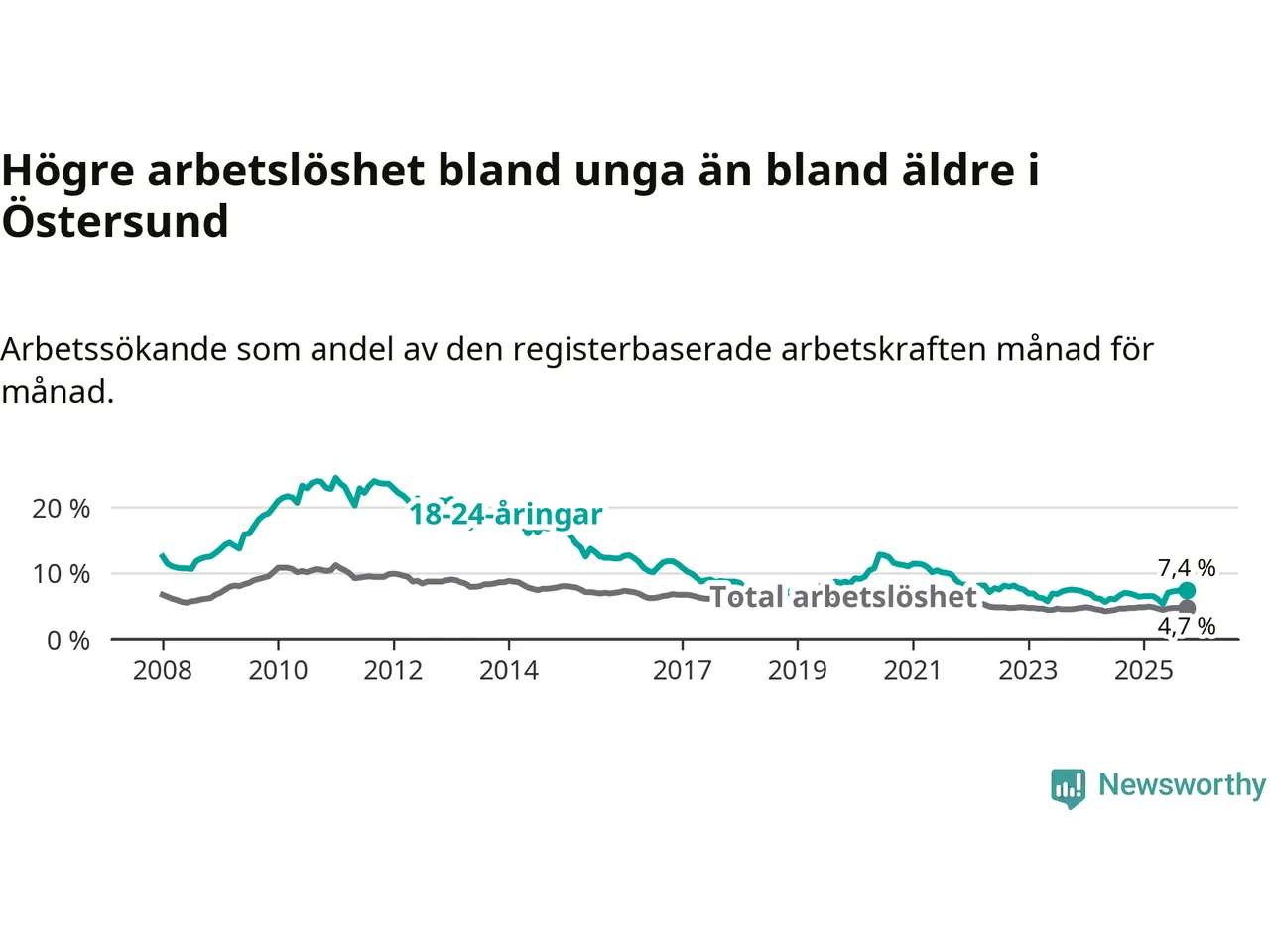 Precis som den totala arbetslösheten ligger ungdomsarbetslösheten i Östersund högre än i Jämtland som helhet. Skillnaden mellan kommunen och länet är 0,9 procentenheter.