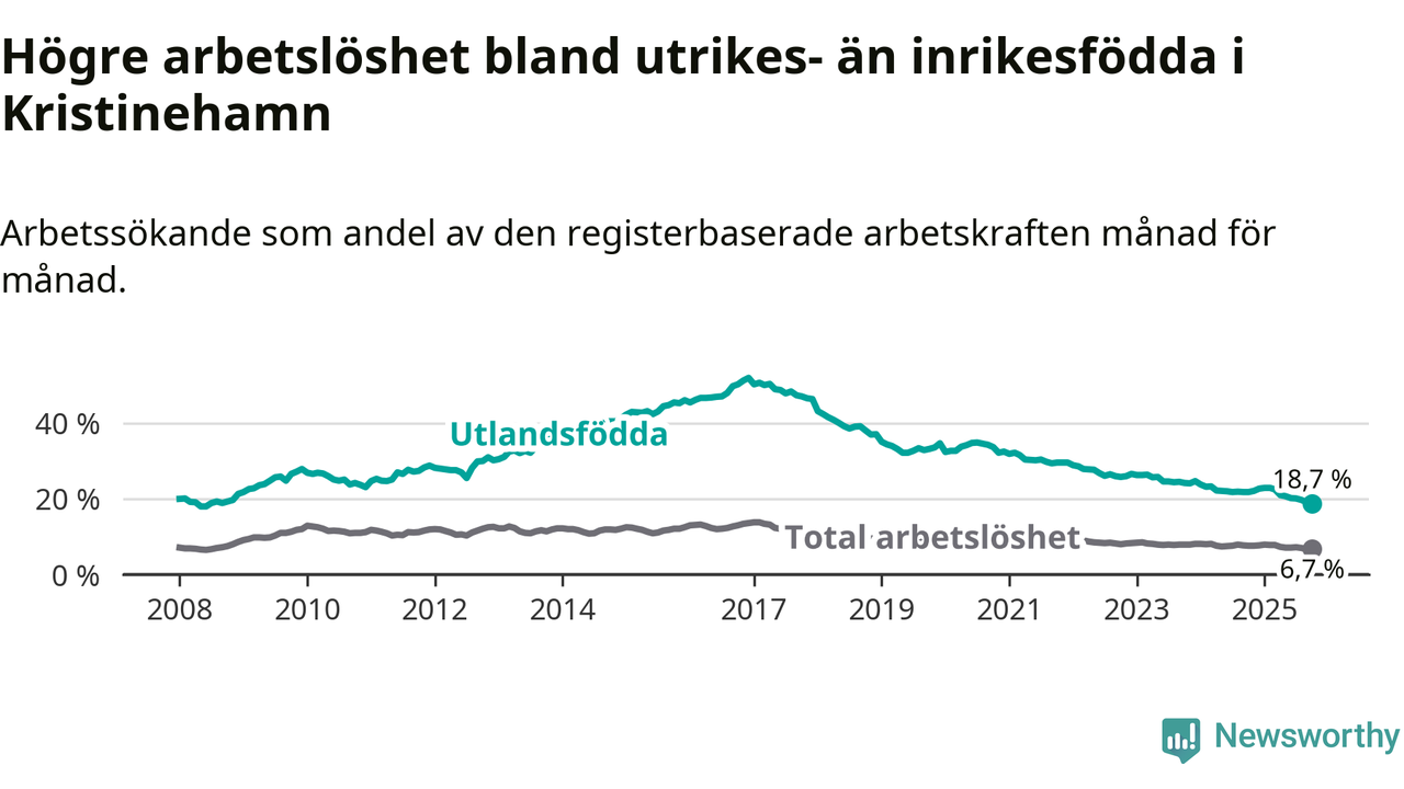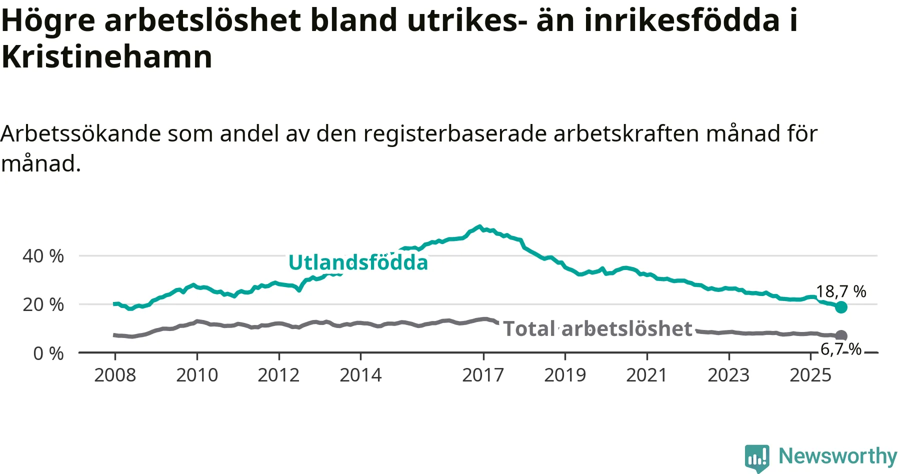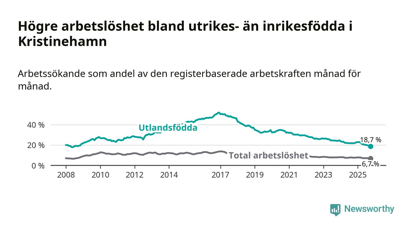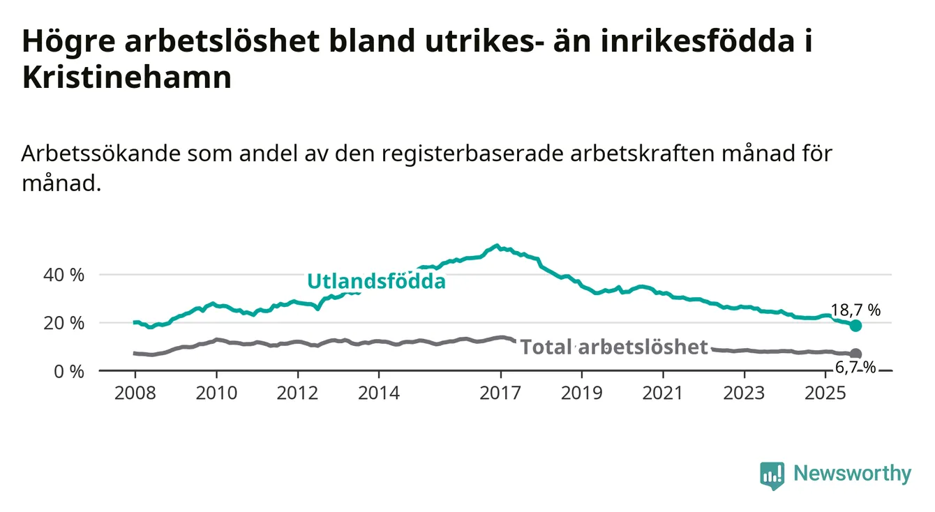 Arbetslösheten bland utlandsfödda var 18,7 procent i Kristinehamn under oktober månad, motsvarande 329 av 1 759 personer. Det är 3,1 procentenheter färre än vid samma tidpunkt i fjol (−55 om man räknar personer). Därmed har de utlandsföddas arbetslöshet varit lägre än vid samma tidpunkt i fjol i över fem år i sträck. Sedan oktober 2020 har arbetslösheten bland utlandsfödda minskat från 33,7 till 18,7 procent. Den nuvarande arbetslöshetsnivån är den lägsta sedan juni 2008.