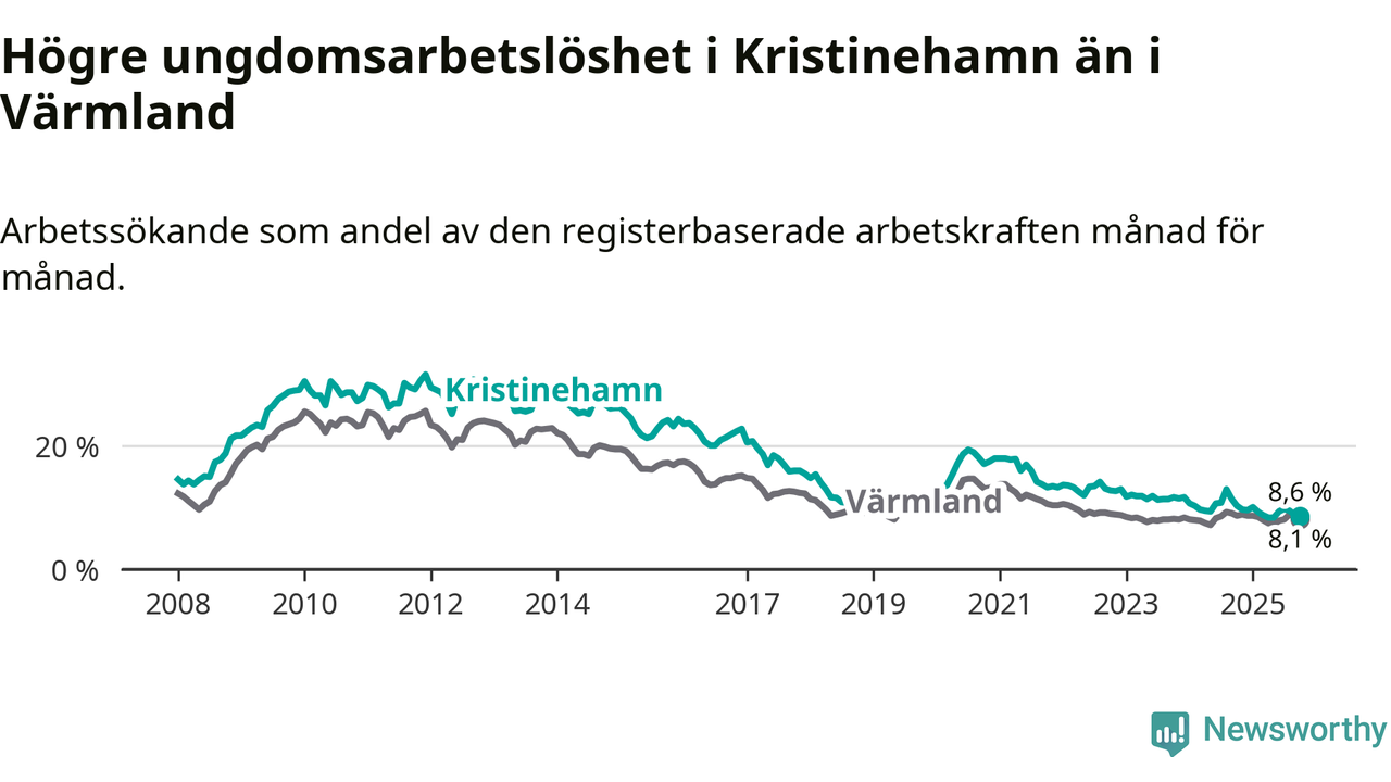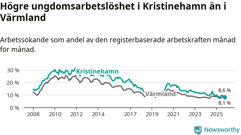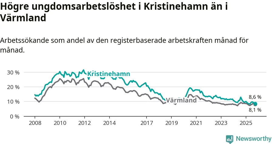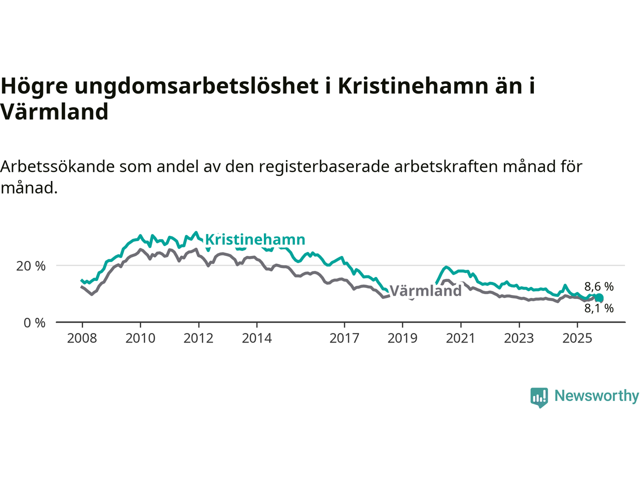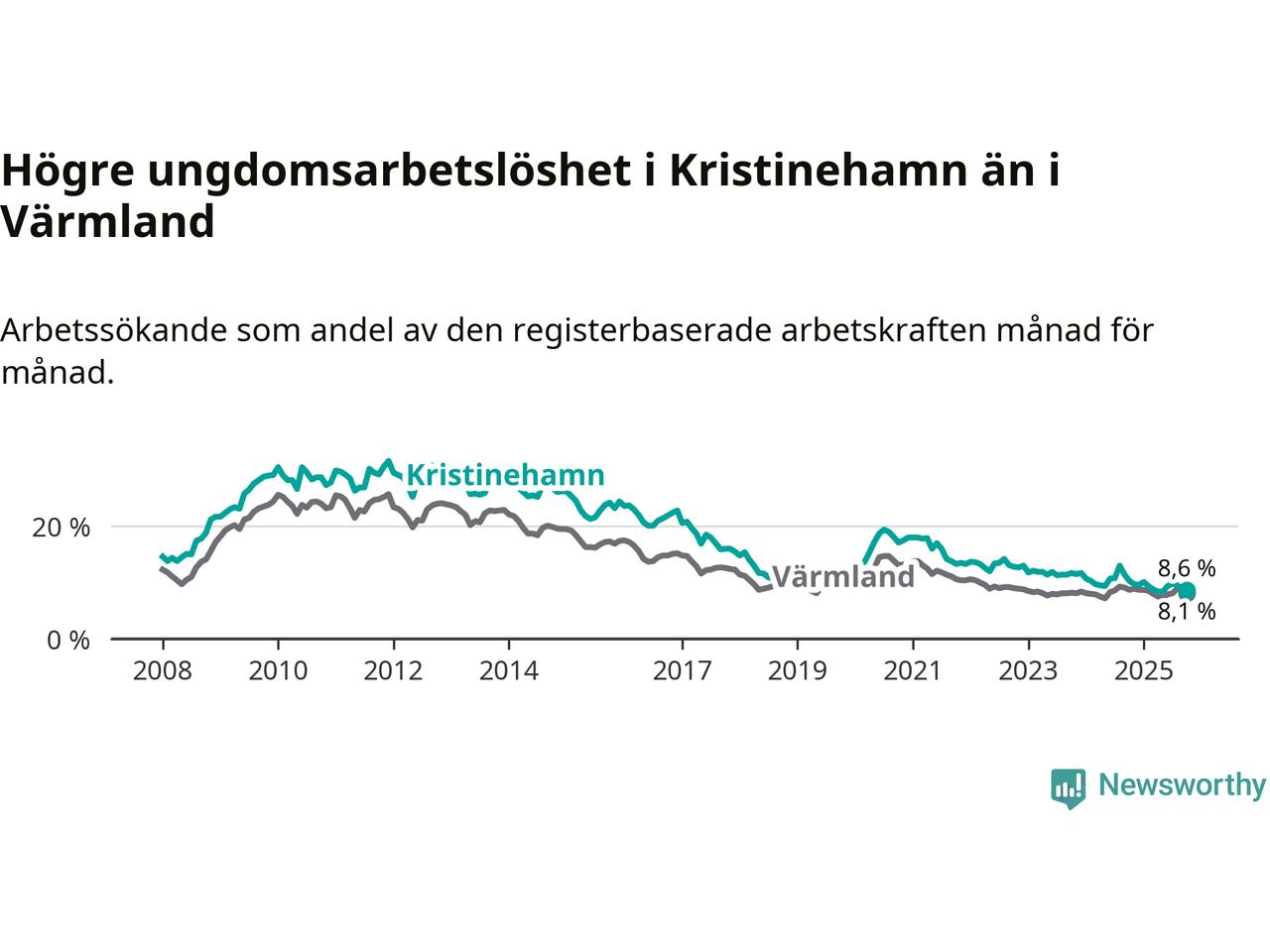 Precis som den totala arbetslösheten ligger ungdomsarbetslösheten i Kristinehamn högre än i Värmland som helhet. Skillnaden mellan kommunen och länet är 0,5 procentenheter.
