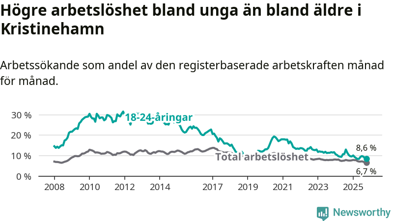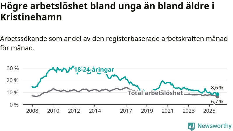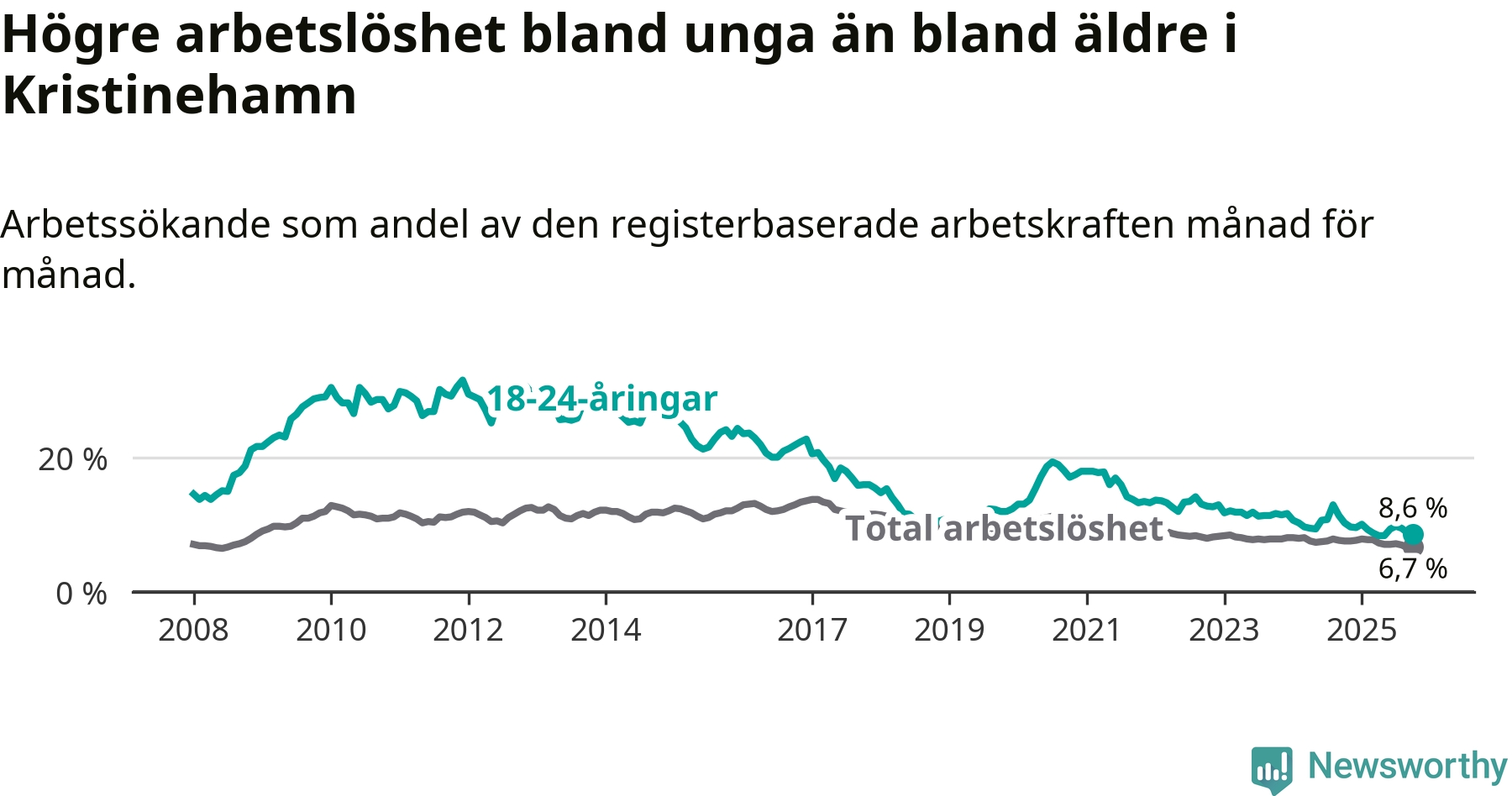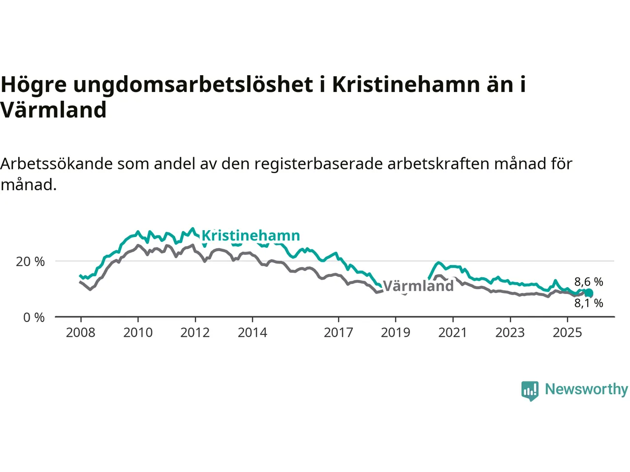 I och med den senaste månadens nedgång har de ungas arbetslöshet i Kristinehamn sjunkit 13 månader i följd (ner från 11,4 procent i september 2024 till 8,6 procent nu).