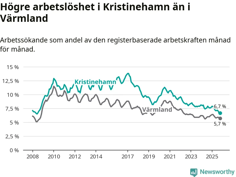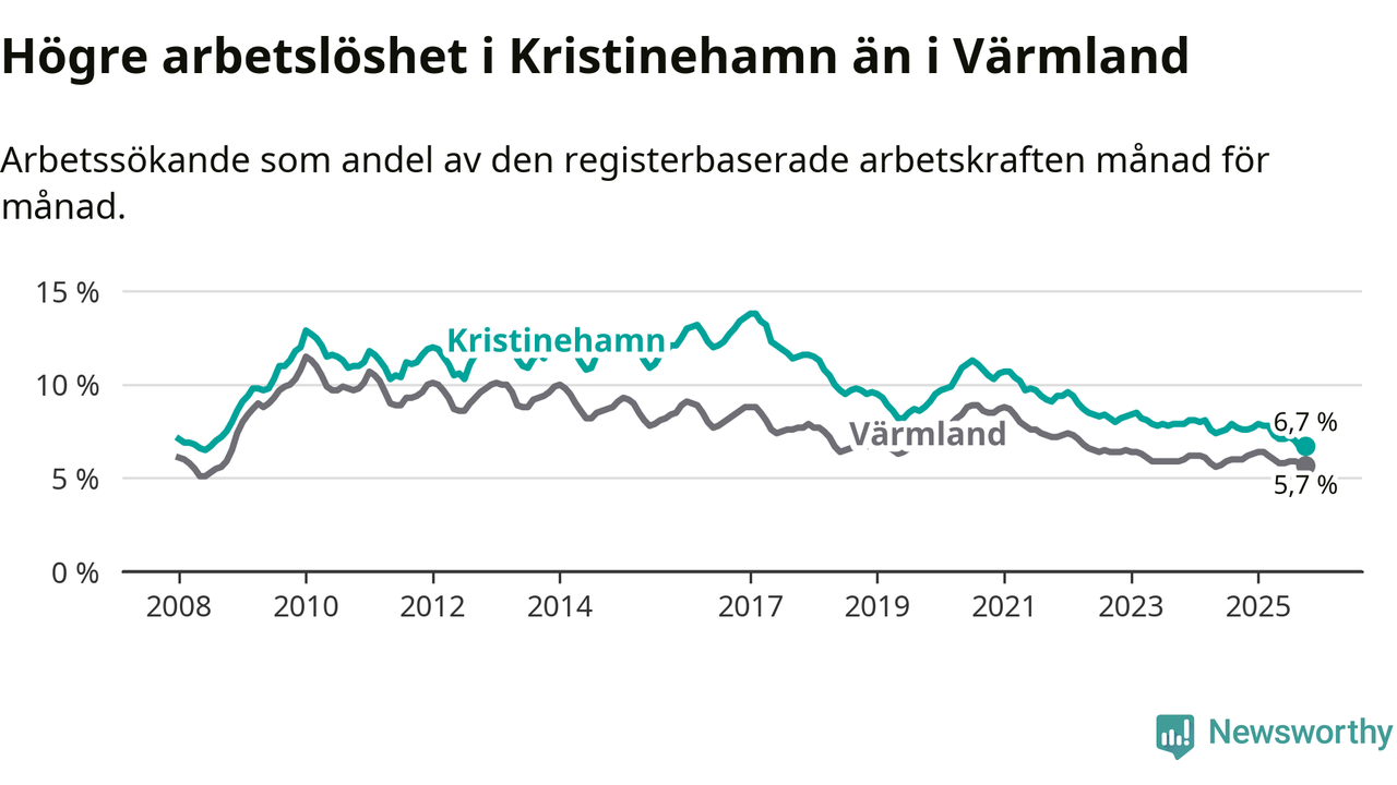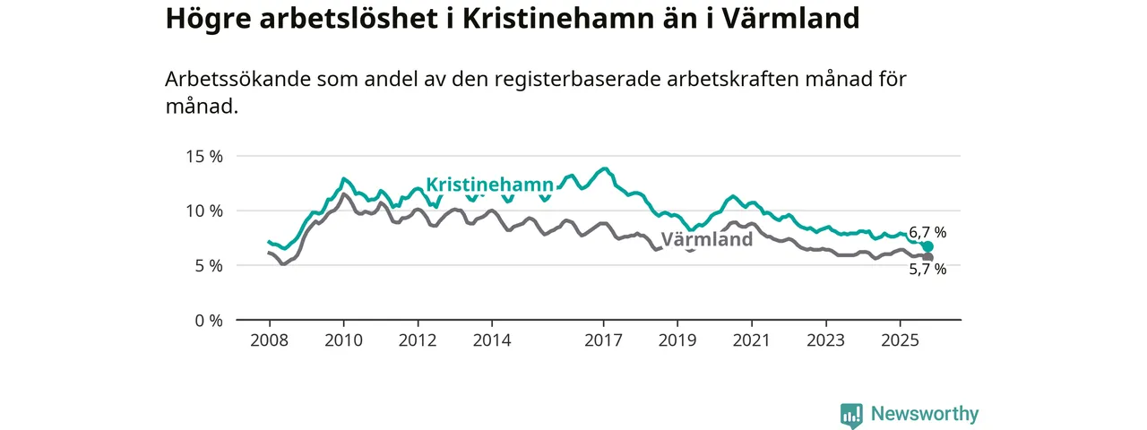 Det är 14:e månaden i följd som arbetslösheten i Kristinehamn är lägre än den var under samma tidpunkt året innan. Sedan augusti 2024 har arbetslösheten gått ner från 7,9 till 6,7 procent.