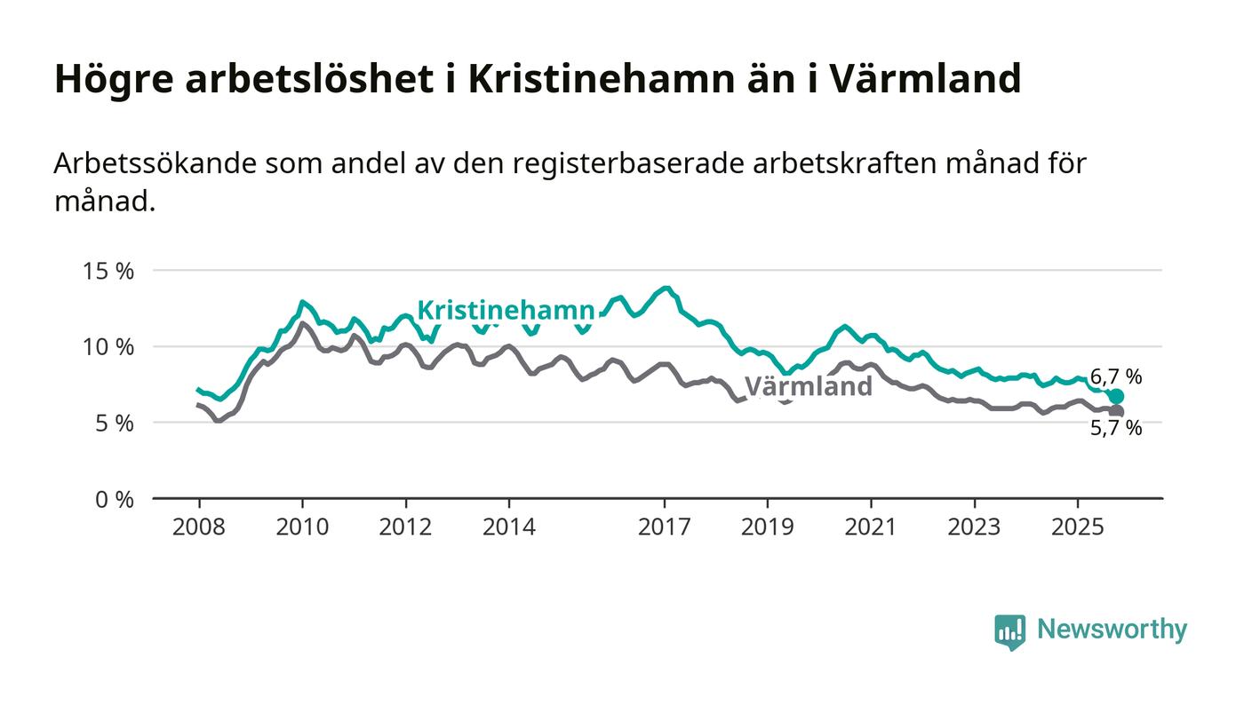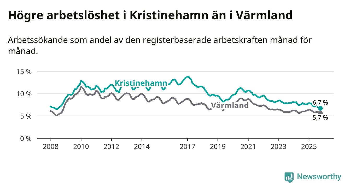 Under oktober månad rapporterade Kristinehamns kommun en total arbetslöshet på 6,7 procent. Det är en minskning jämfört med samma tidpunkt i fjol (−0,9 procentenheter). Även i Värmlands län sjunker arbetslösheten .