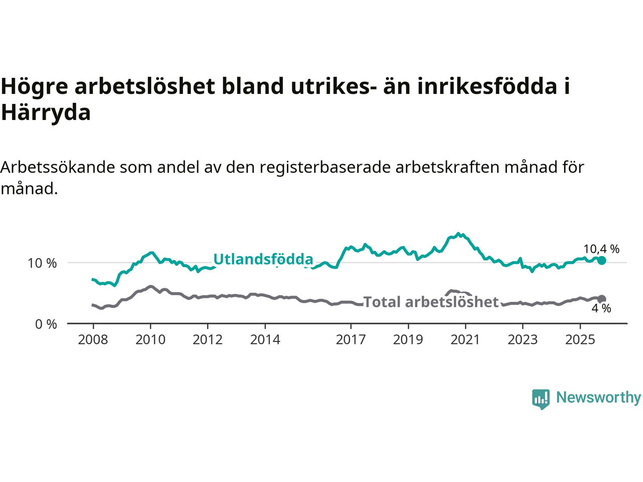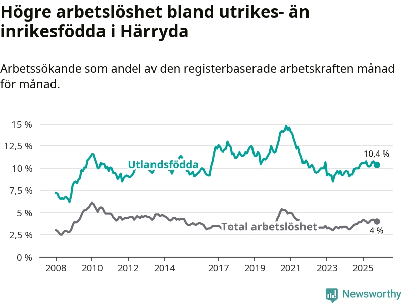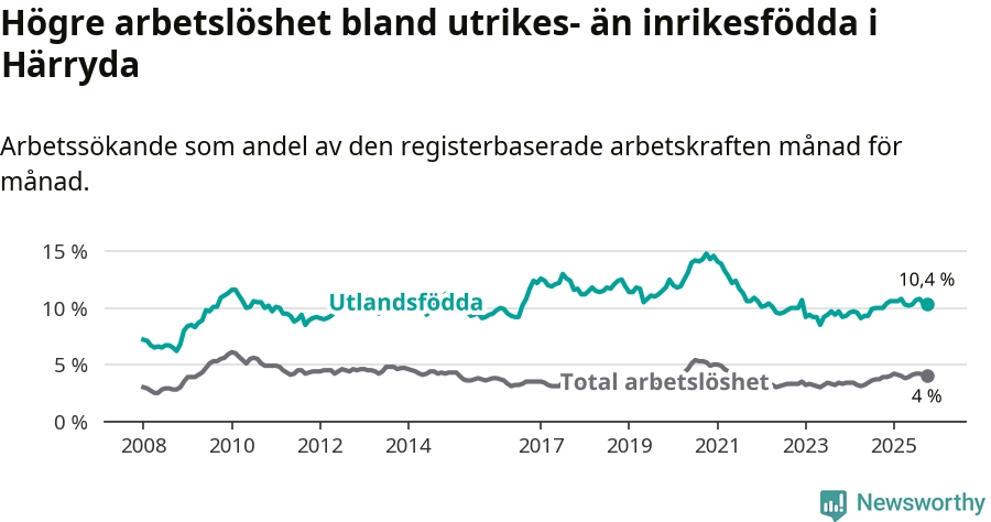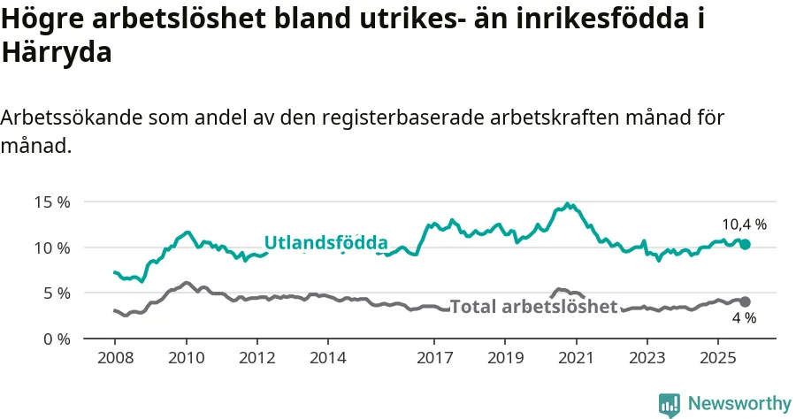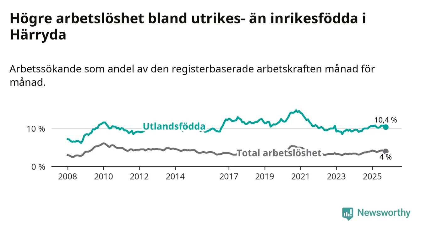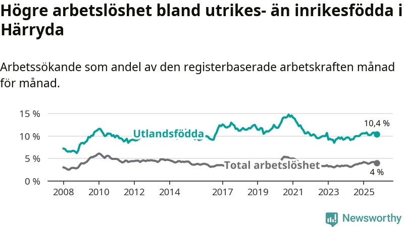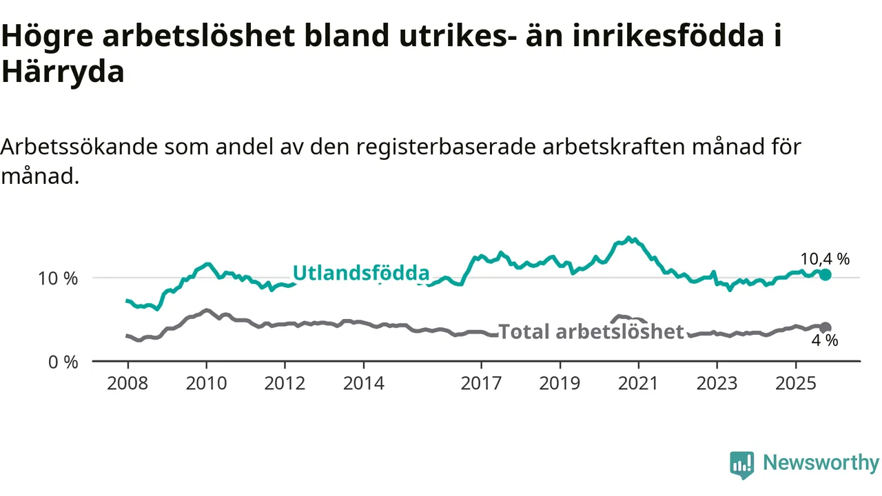 Arbetslösheten bland utlandsfödda var 10,4 procent i Härryda under oktober månad, motsvarande 342 av 3 288 personer. Det är 0,4 procentenheter fler än vid samma tidpunkt i fjol (+15 om man räknar personer). Därmed är de utlandsföddas arbetslöshet högre än vid samma tidpunkt i fjol för 18:e månaden i följd. Sedan april 2024 har arbetslösheten bland utlandsfödda ökat från 9,1 till 10,4 procent.