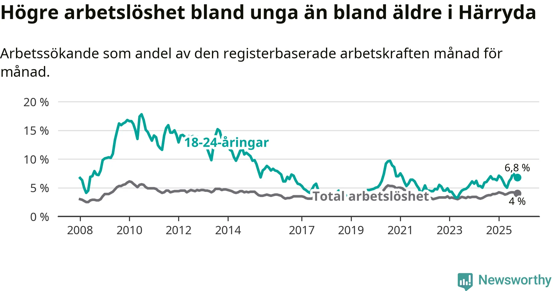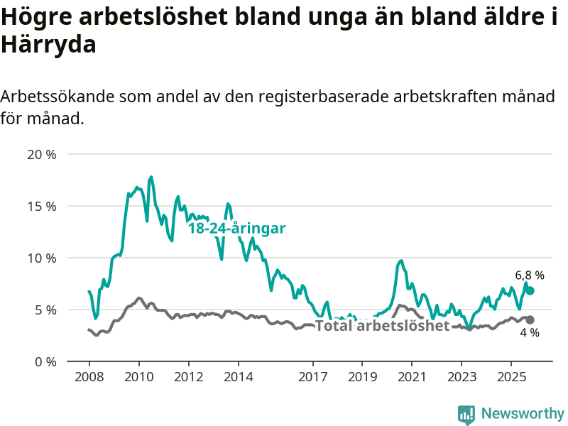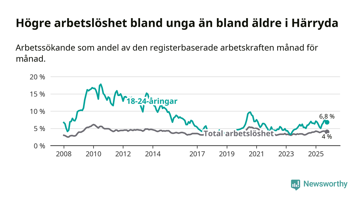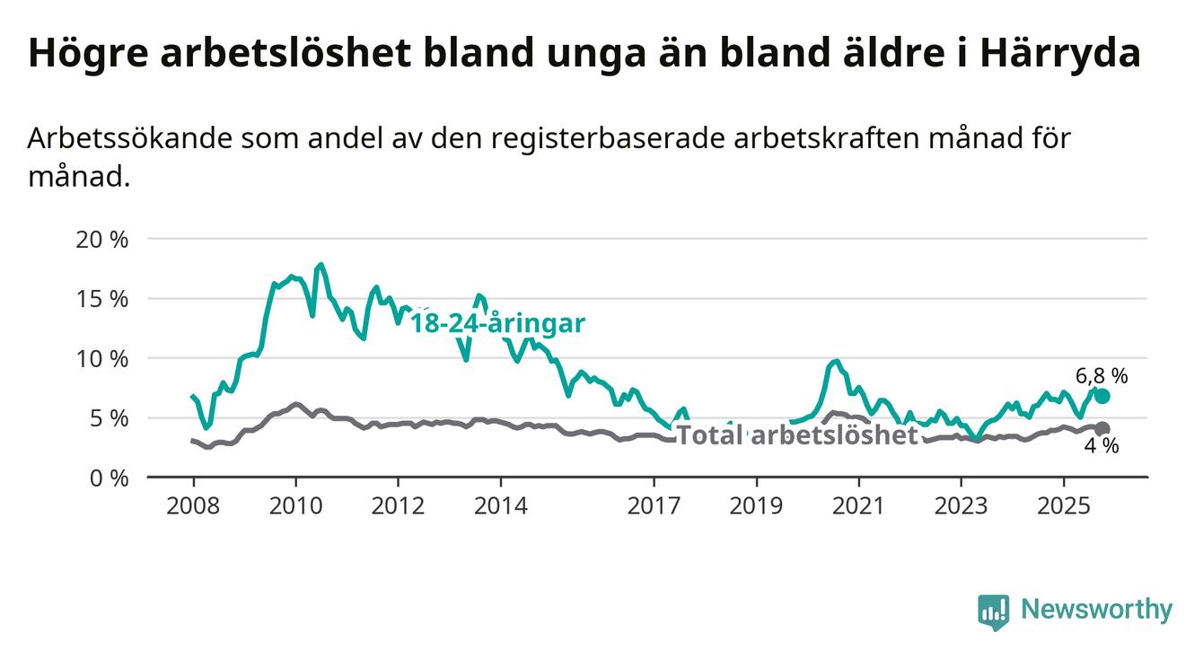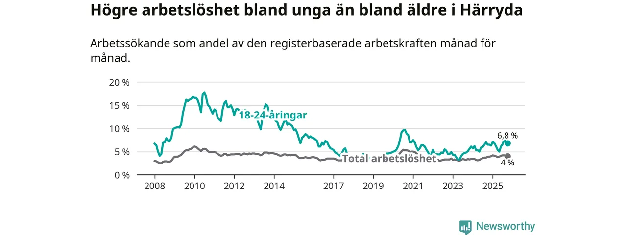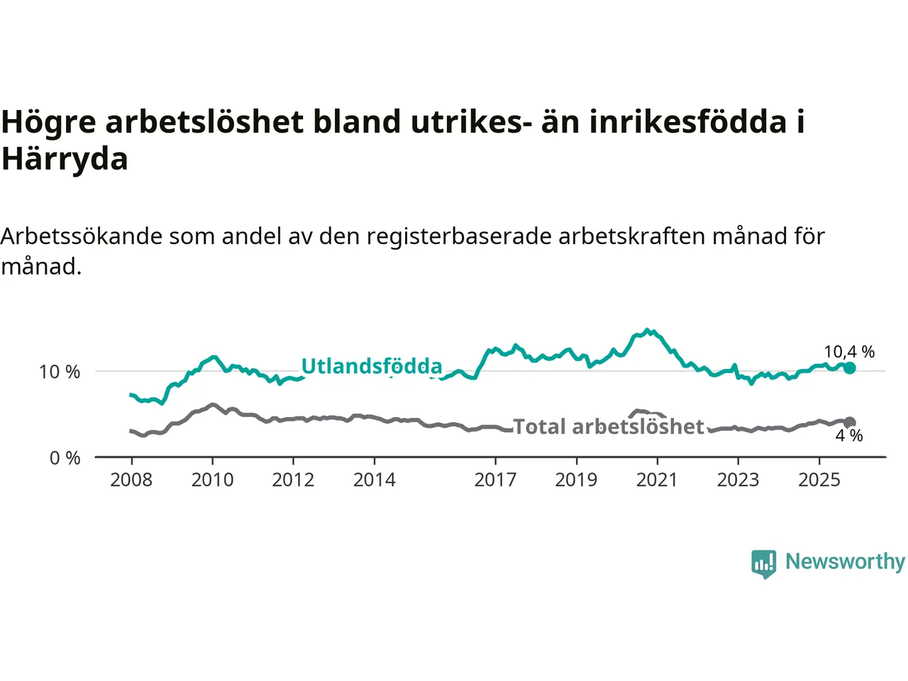 Arbetslösheten bland utlandsfödda var 10,4 procent i Härryda under oktober månad, motsvarande 342 av 3 288 personer. Det är 0,4 procentenheter fler än vid samma tidpunkt i fjol (+15 om man räknar personer). Därmed är de utlandsföddas arbetslöshet högre än vid samma tidpunkt i fjol för 18:e månaden i följd. Sedan april 2024 har arbetslösheten bland utlandsfödda ökat från 9,1 till 10,4 procent.