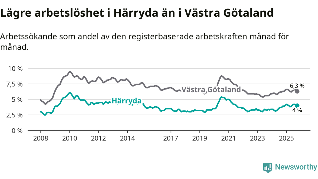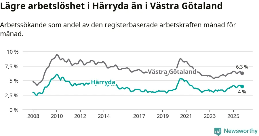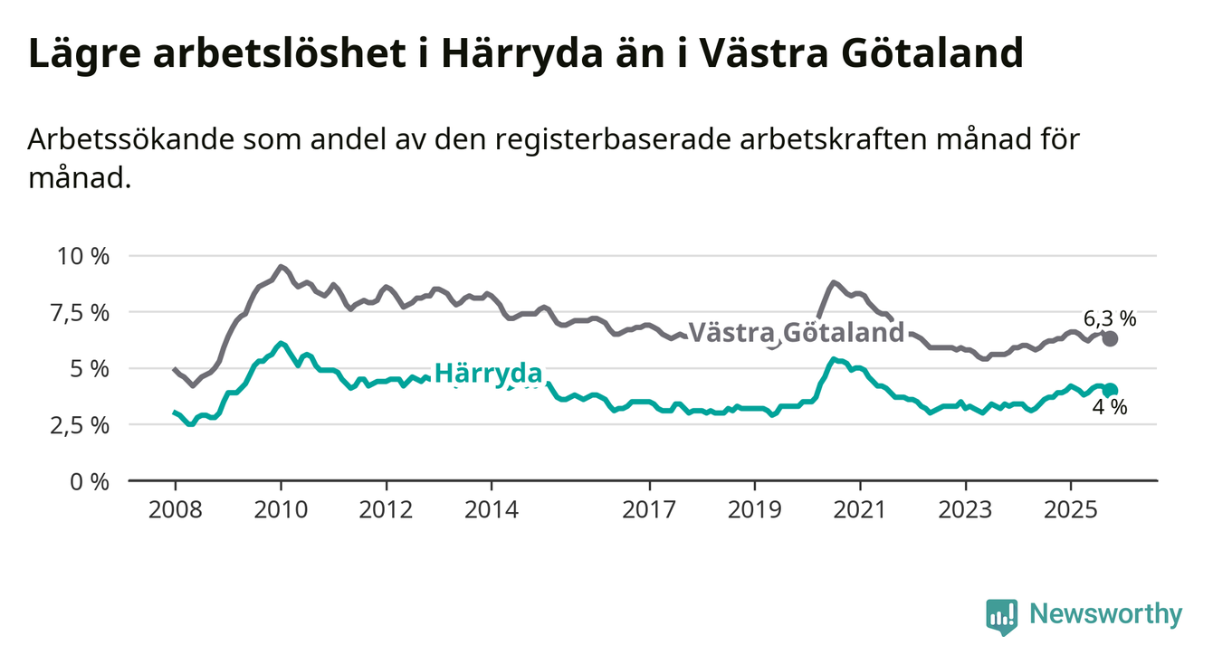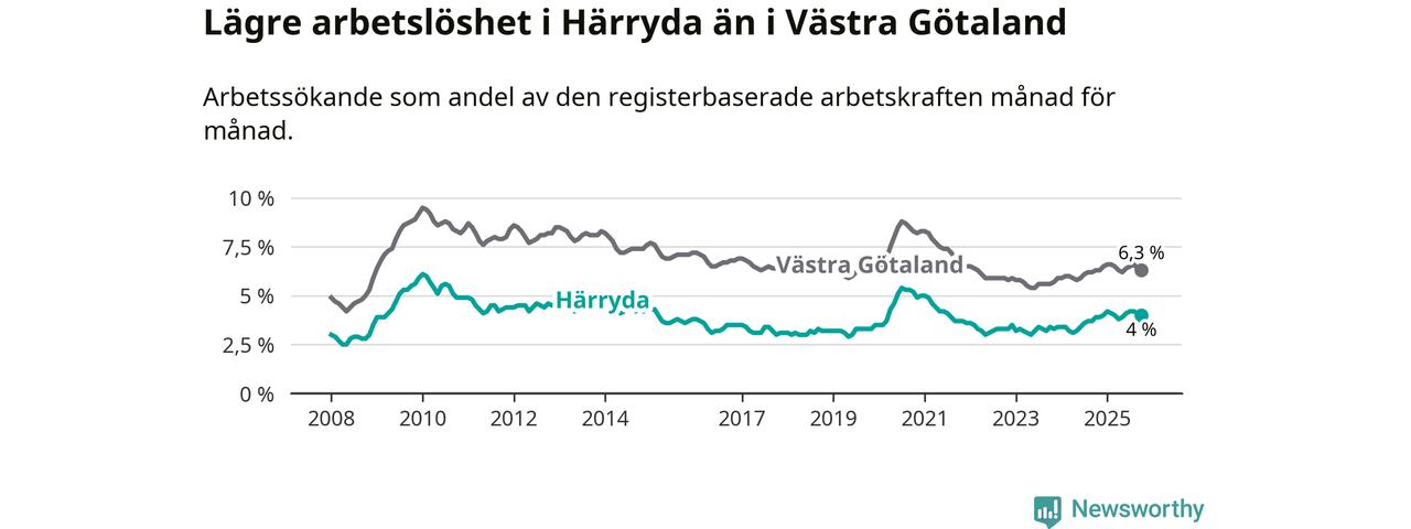 Under oktober månad rapporterade Härryda kommun en total arbetslöshet på 4,0 procent. Det är en ökning jämfört med samma tidpunkt i fjol (+0,1 procentenheter). I Västra Götalands län däremot står arbetslösheten stilla.