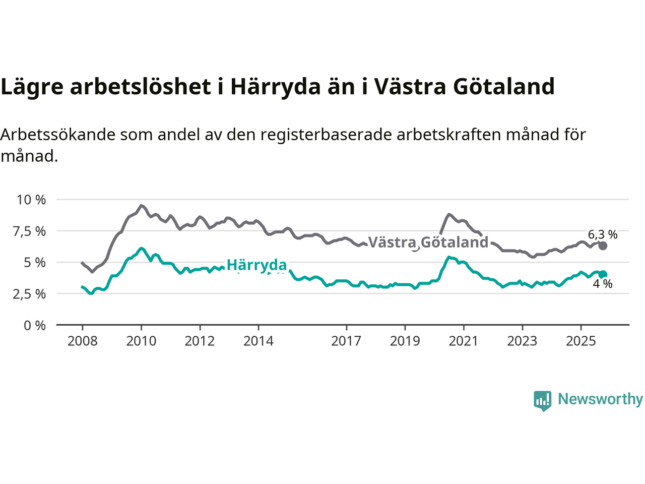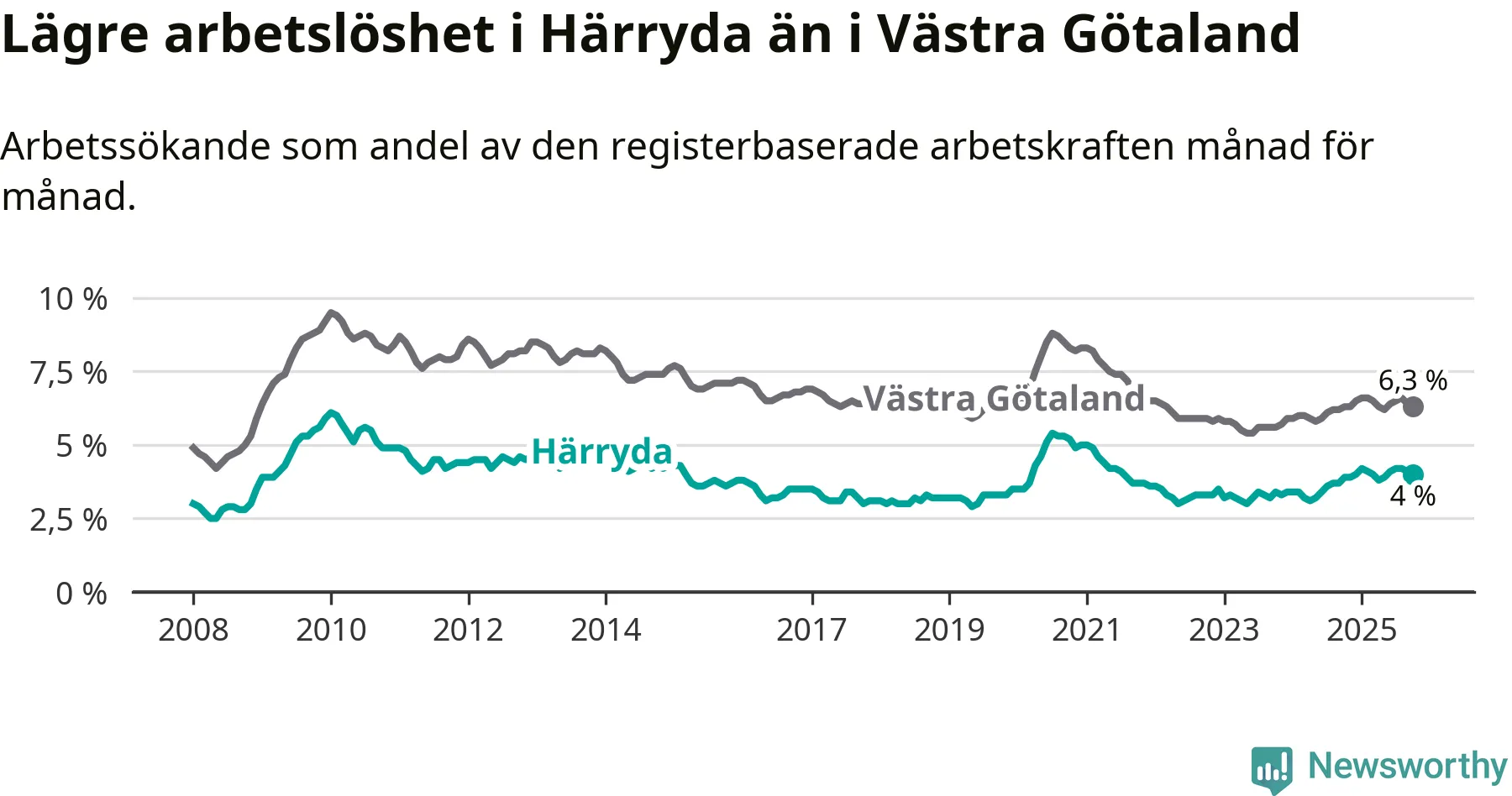 Även om arbetslösheten i Härryda alltså ökar, så ligger den fortfarande under snittet i hela Västra Götalands län (4,0 procent i kommunen, jämfört med 6,3 procent i hela länet). Öckerö har den lägsta arbetslösheten i länet (2,7 procent), medan Gullspång har den högsta (8,8 procent). För att Härryda skulle komma ner i samma arbetslöshetsnivå som Öckerö skulle 268 personer behöva sysselsättas.