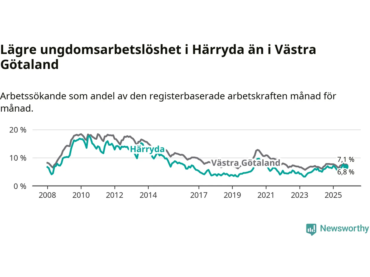 Precis som den totala arbetslösheten ligger ungdomsarbetslösheten i Härryda lägre än i Västra Götaland som helhet. Skillnaden mellan kommunen och länet är 0,3 procentenheter.