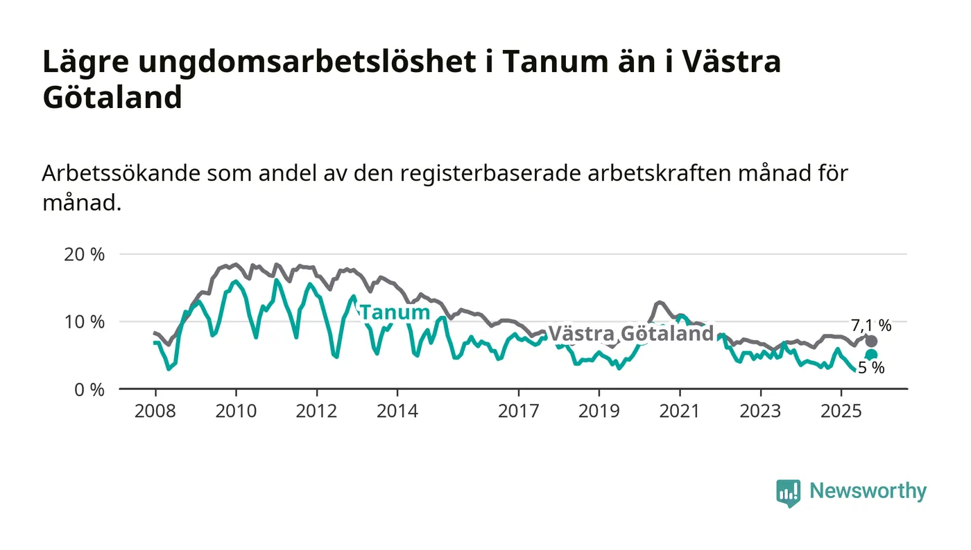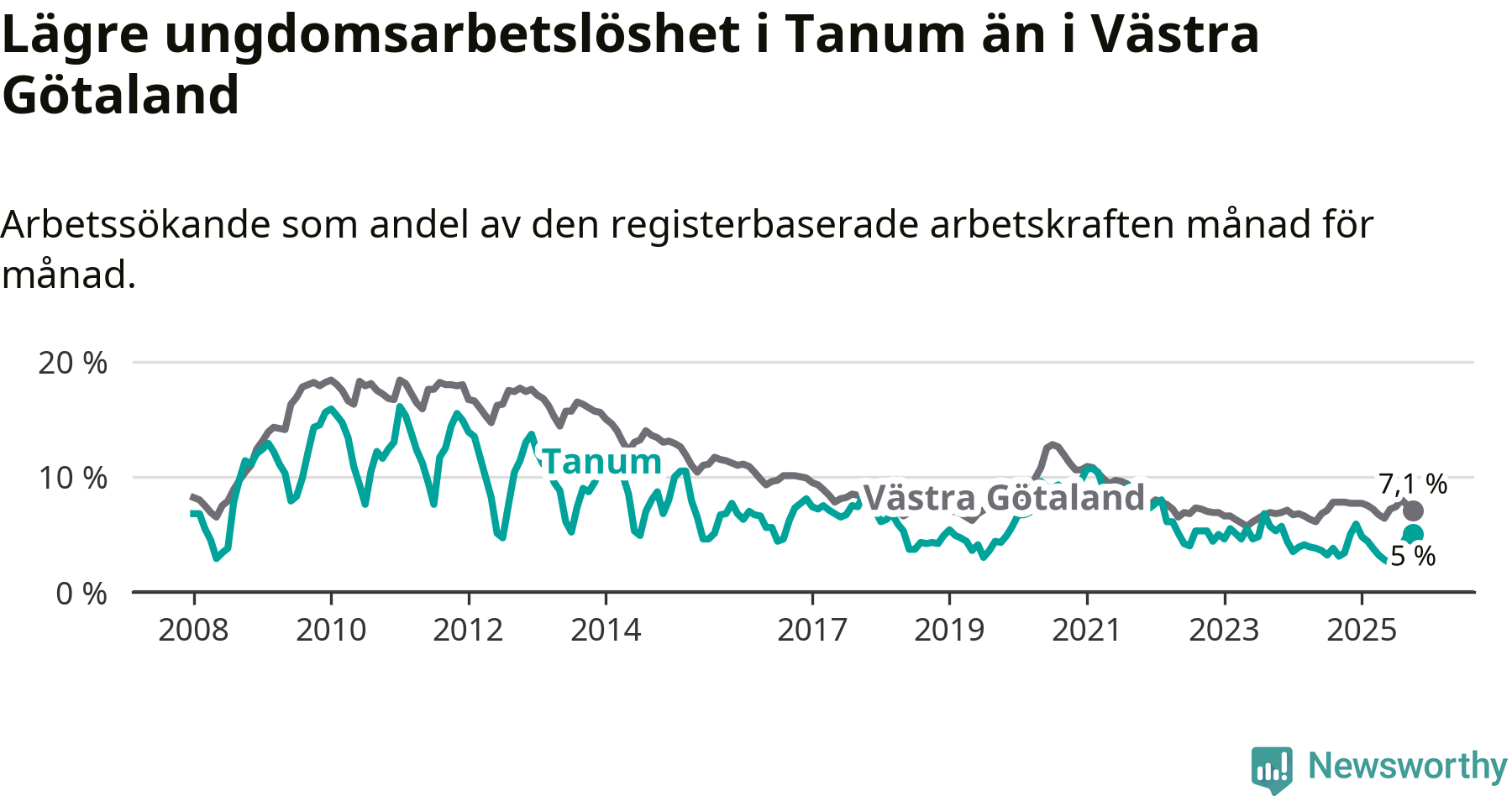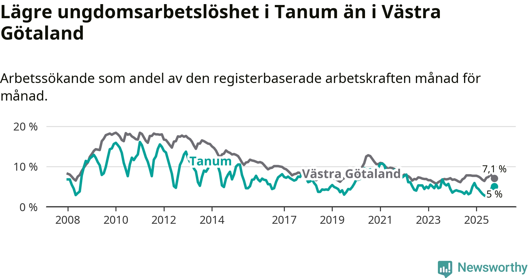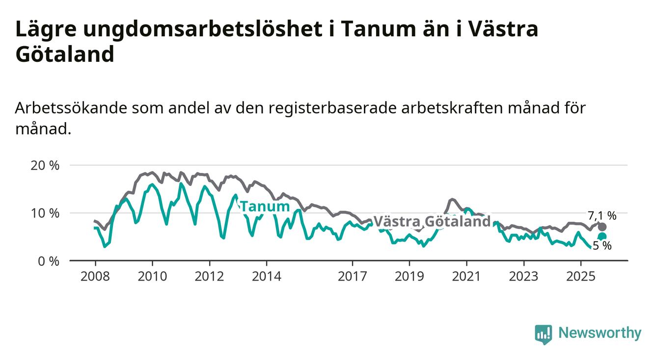 Graf: Arbetslöshet bland unga i Tanums kommun och Västra Götalands län