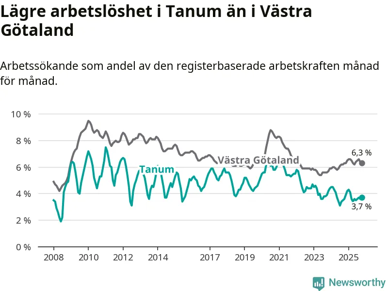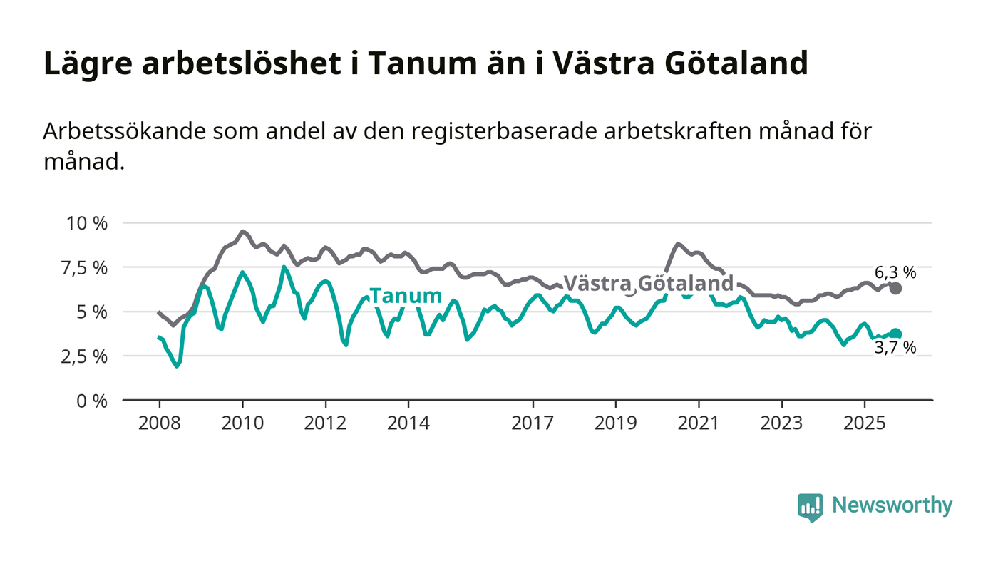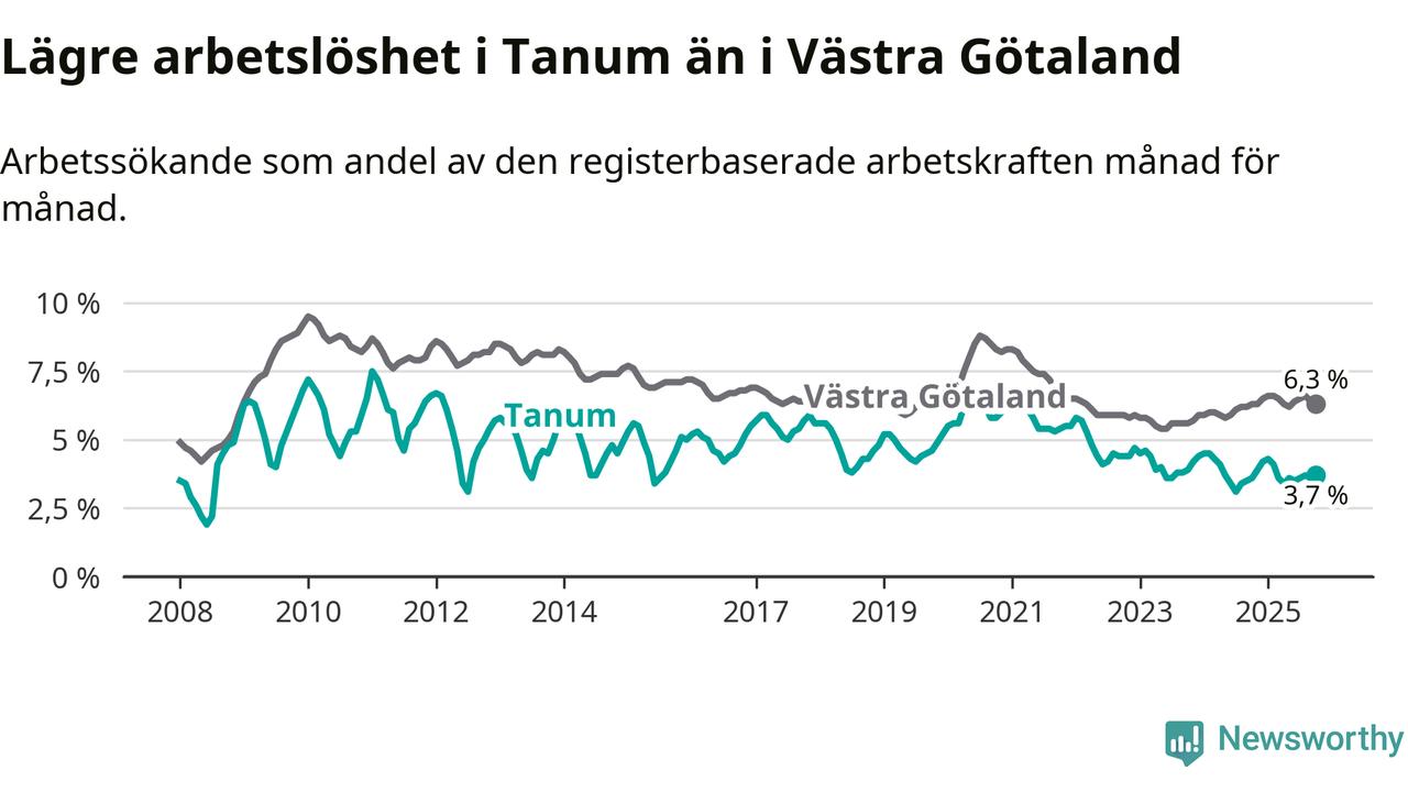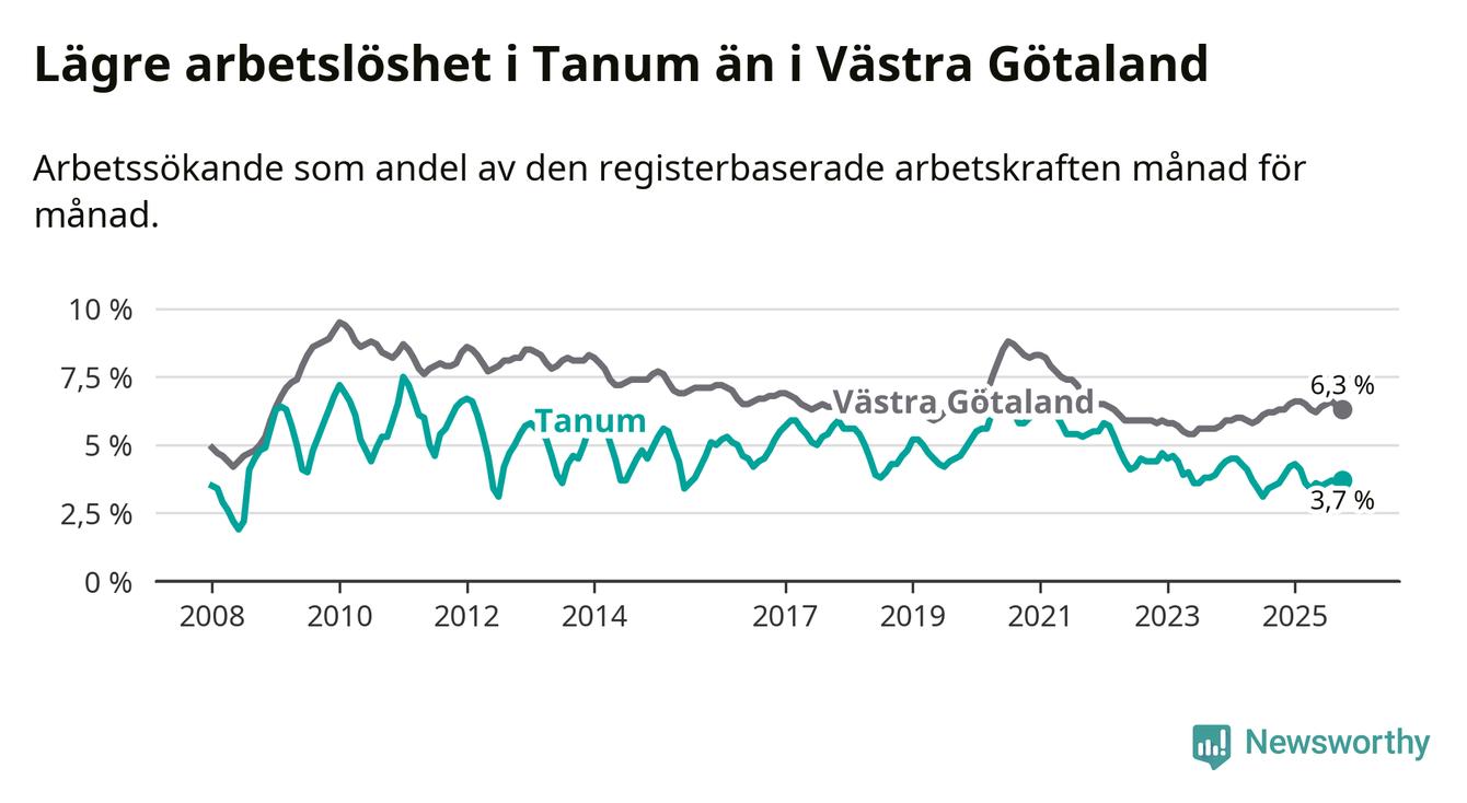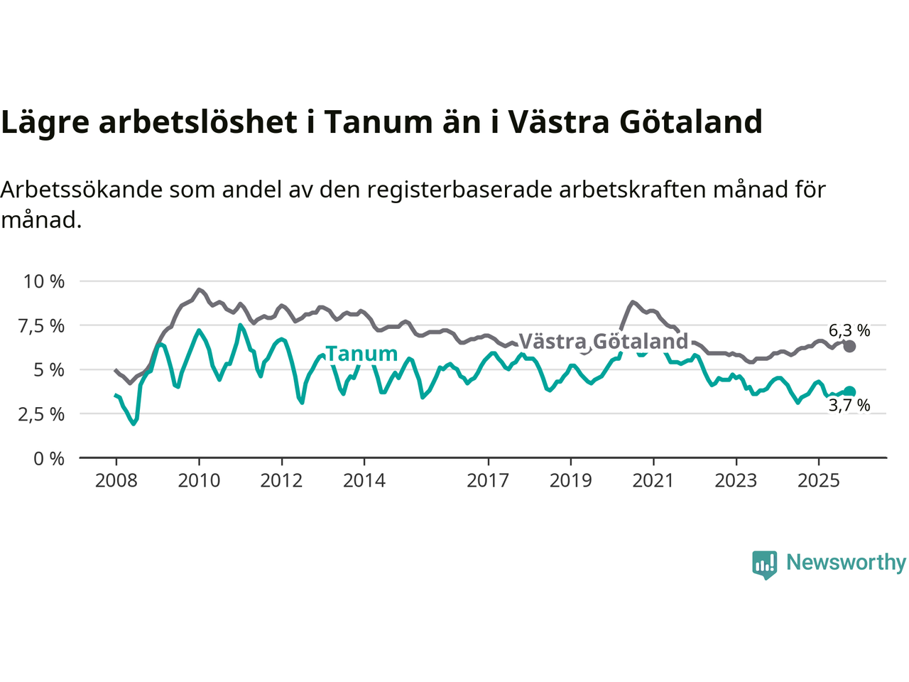 Under oktober månad rapporterade Tanums kommun en total arbetslöshet på 3,7 procent. Det är en ökning jämfört med samma tidpunkt i fjol (+0,1 procentenheter). I Västra Götalands län däremot står arbetslösheten stilla.