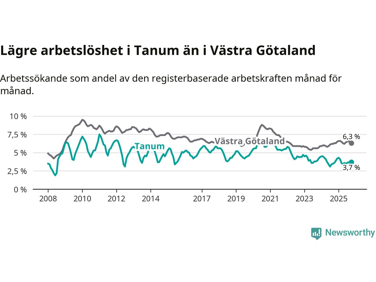 Även om arbetslösheten i Tanum alltså ökar, så ligger den fortfarande under snittet i hela Västra Götalands län (3,7 procent i kommunen, jämfört med 6,3 procent i hela länet). Öckerö har den lägsta arbetslösheten i länet (2,7 procent), medan Gullspång har den högsta (8,8 procent). För att Tanum skulle komma ner i samma arbetslöshetsnivå som Öckerö skulle 56 personer behöva sysselsättas.
