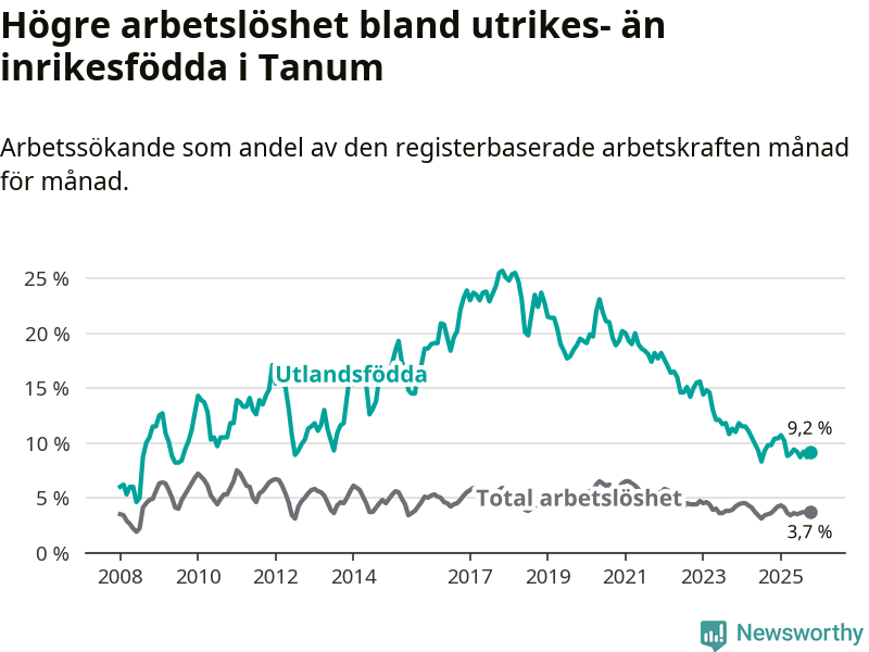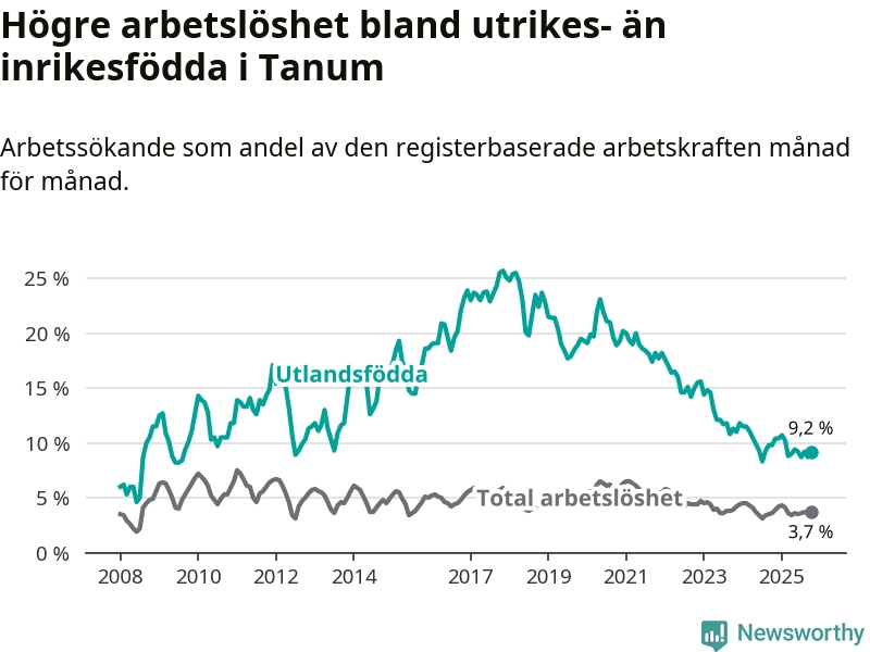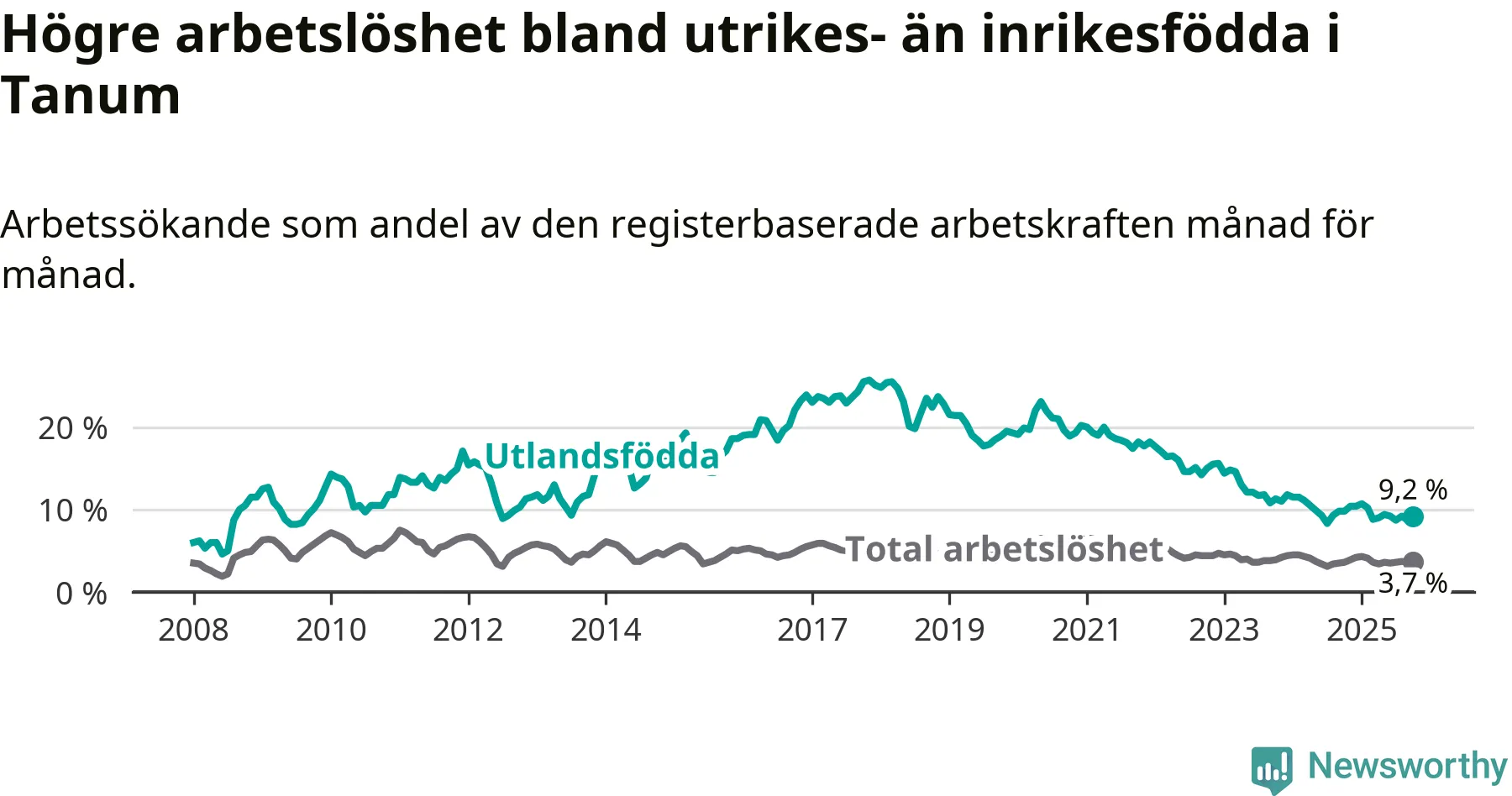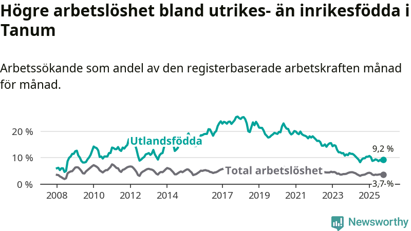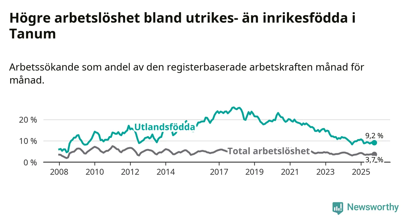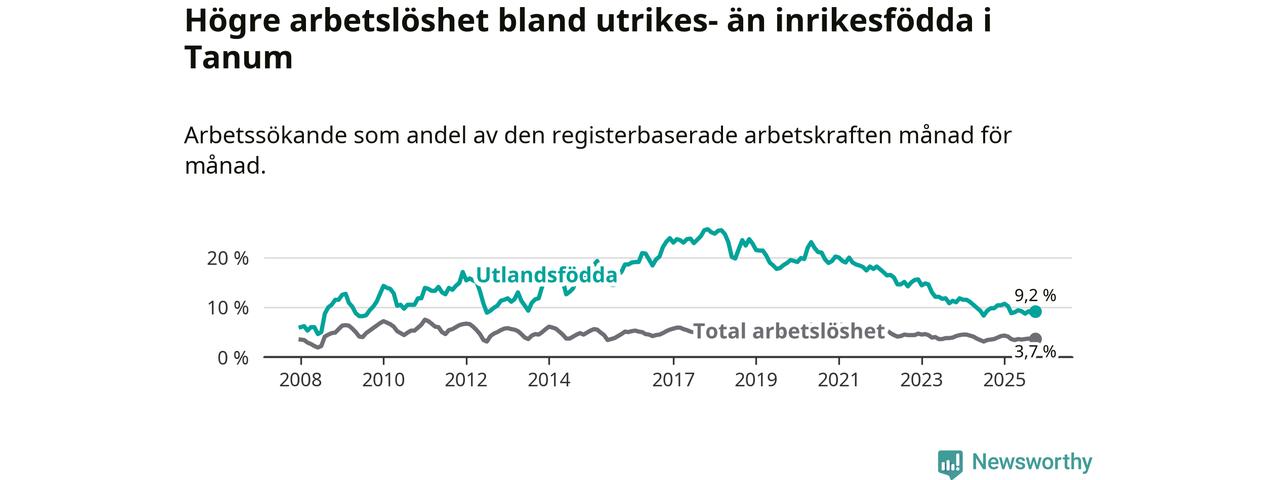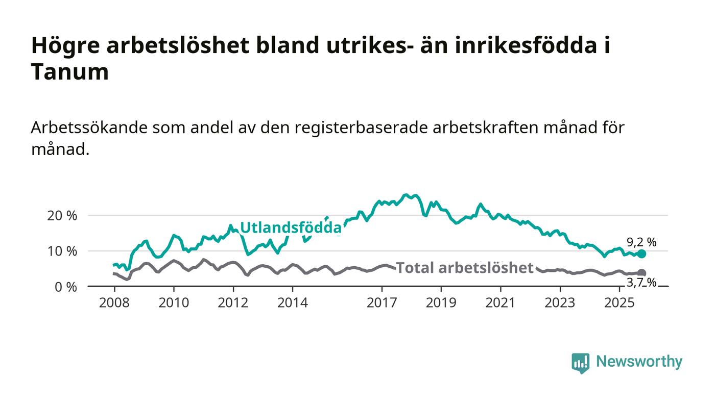 Skillnaden i arbetslöshet mellan utrikesfödda och hela befolkningen är 5,5 procentenheter i Tanum. Det är en mindre skillnad än för ett år sedan (−0,7 procentenheter).