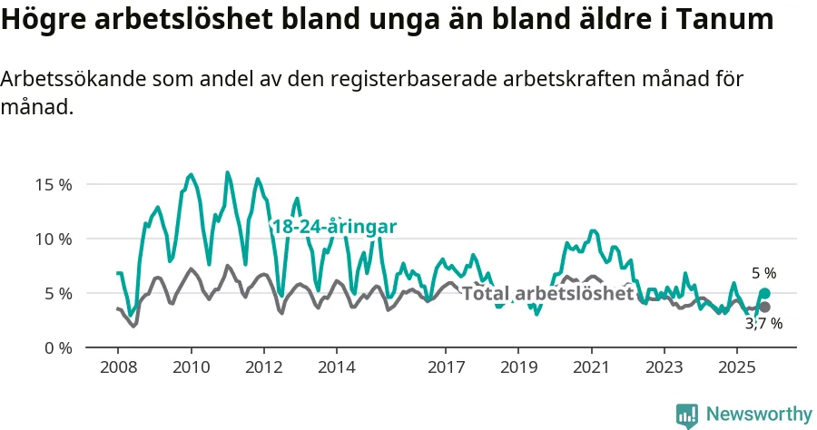 Precis som den totala arbetslösheten stiger arbetslösheten bland unga (+1,6 procentenheter). I oktober var 5,0 procent av 18–24-åringarna inskrivna som arbetssökande (motsvarande 26 personer). Mäter vi antalet inskrivna ser vi en ökning med åtta personer på ett års sikt.