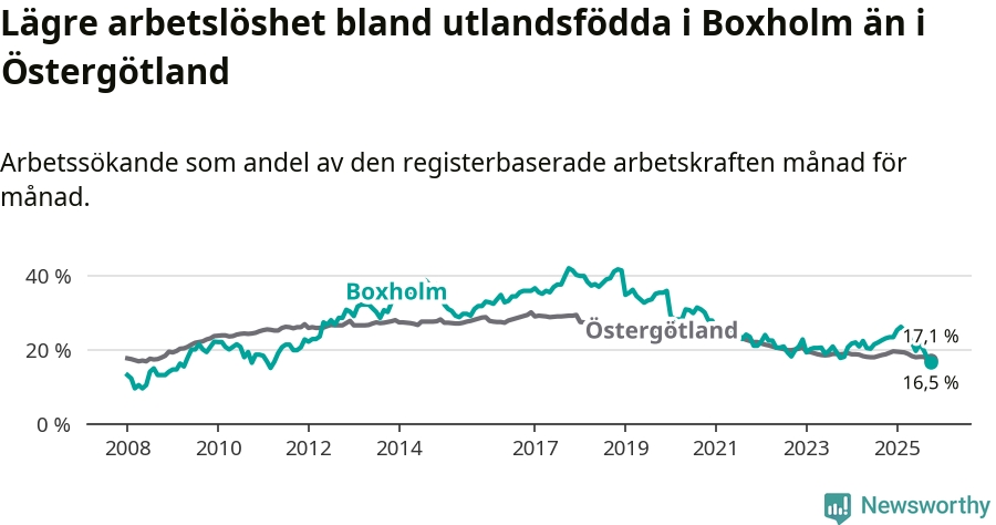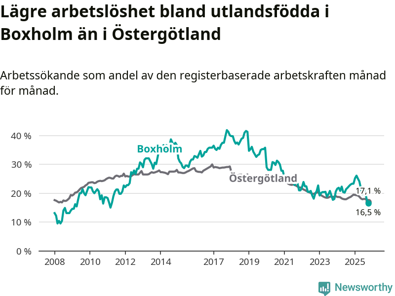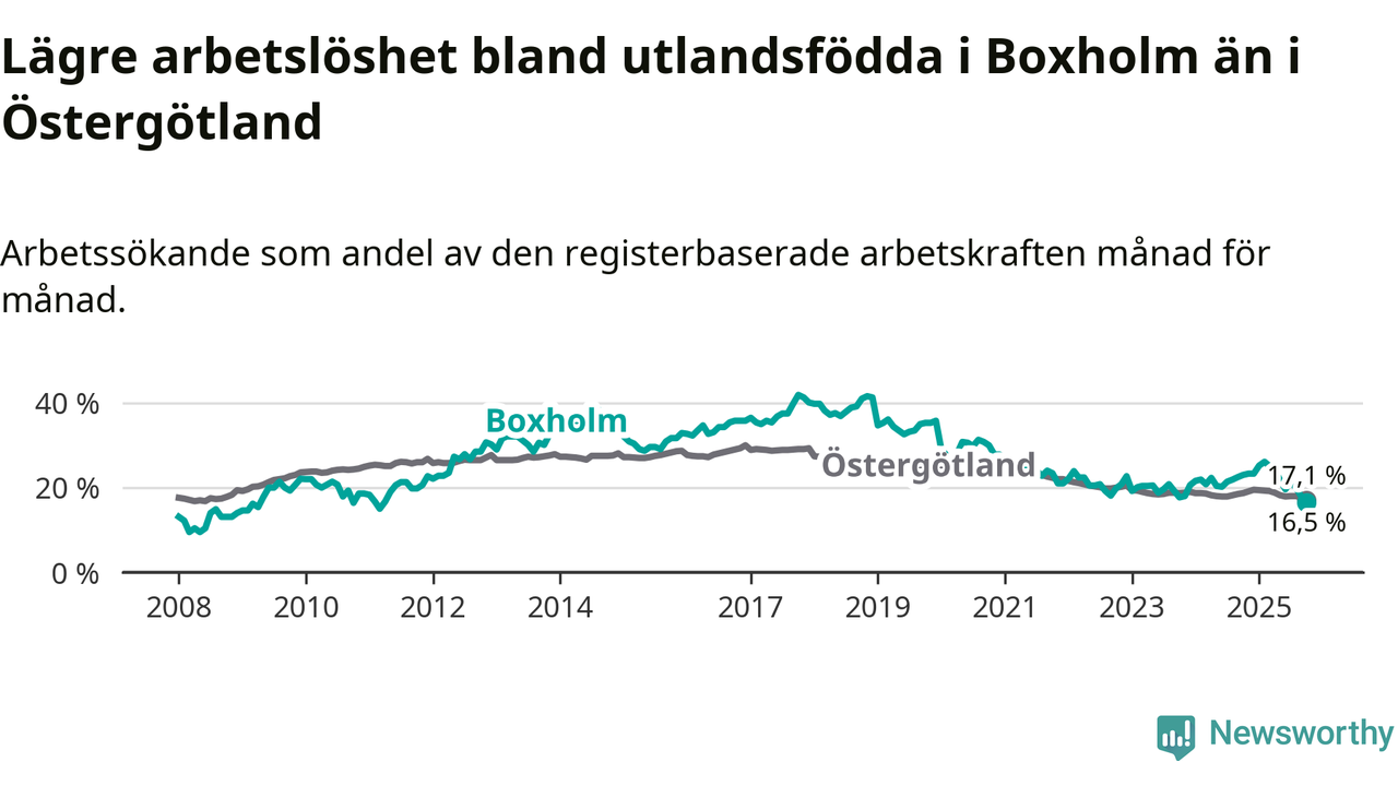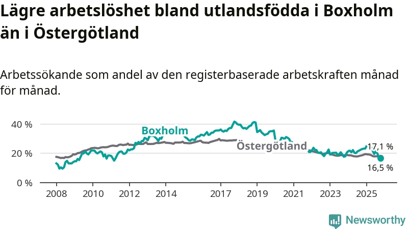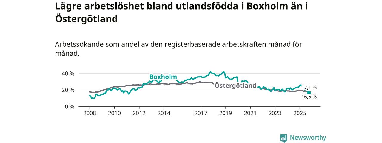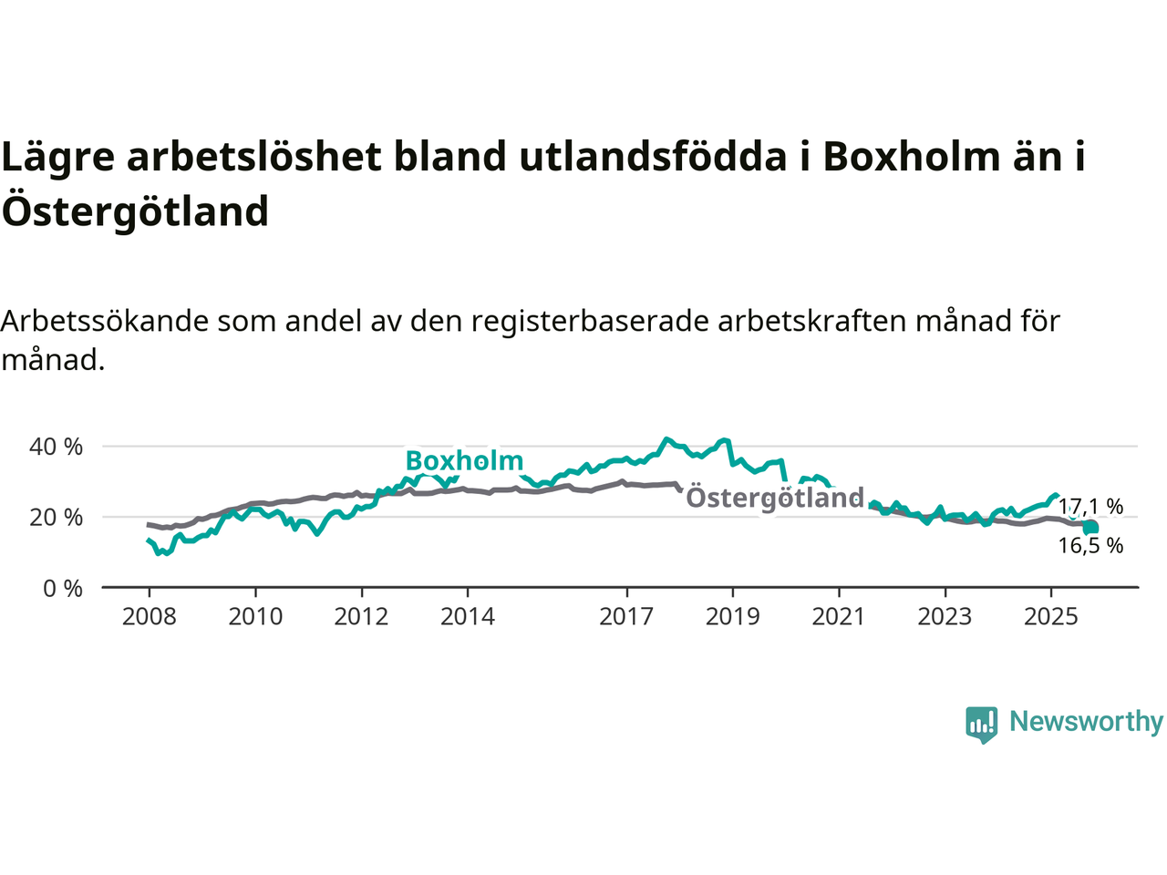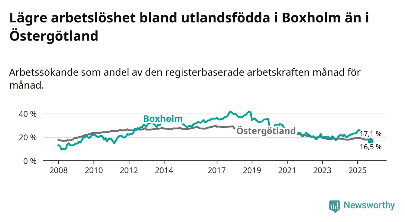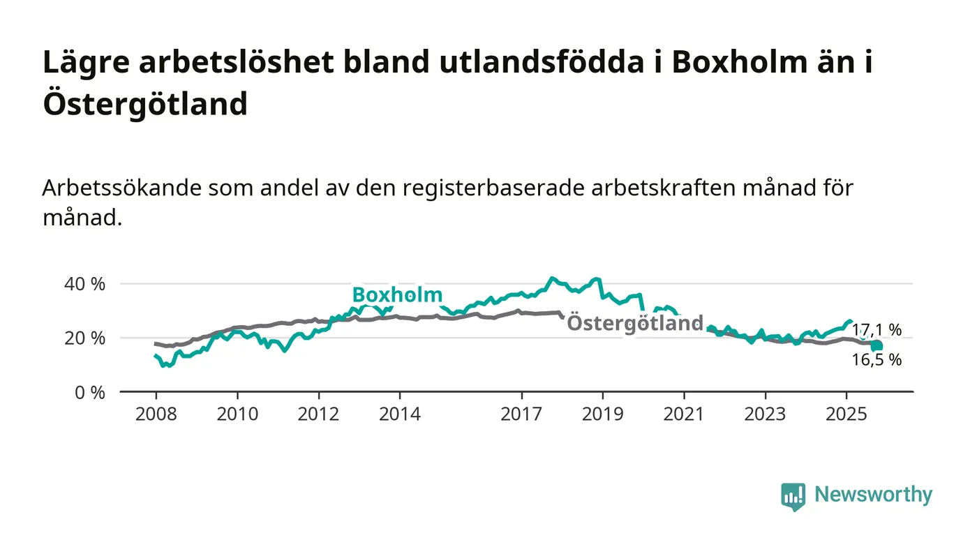 Den senaste månadsstatistiken från Arbetsförmedlingen visar på en nedgång i arbetslöshet bland utlandsfödda i Boxholms kommun med 6,5 procentenheter. Arbetslösheten bland invånare födda i ett annat land låg i oktober på 16,5 procent.