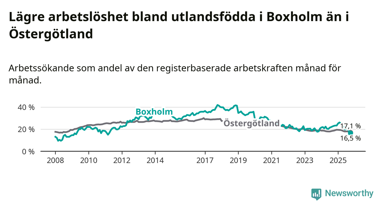 Graf: Arbetslöshet bland utrikesfödda i Boxholms kommun och Östergötlands län