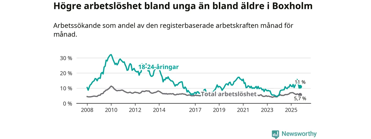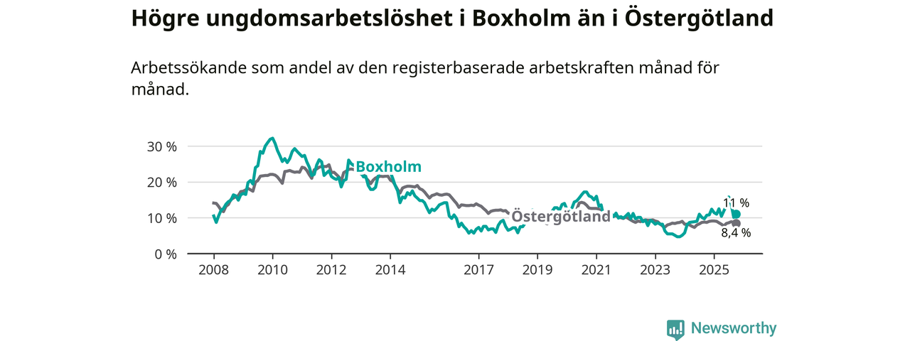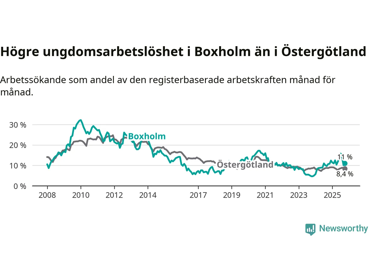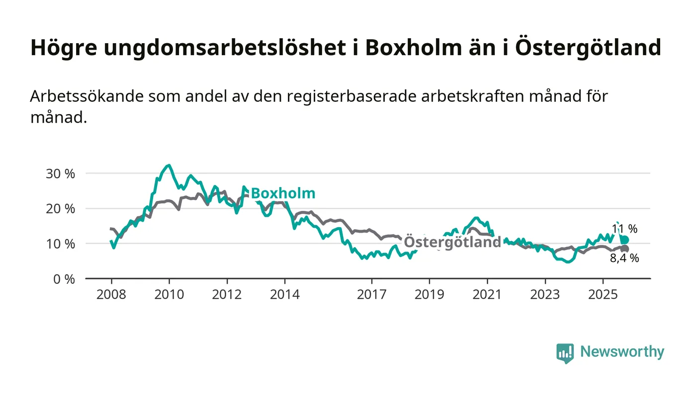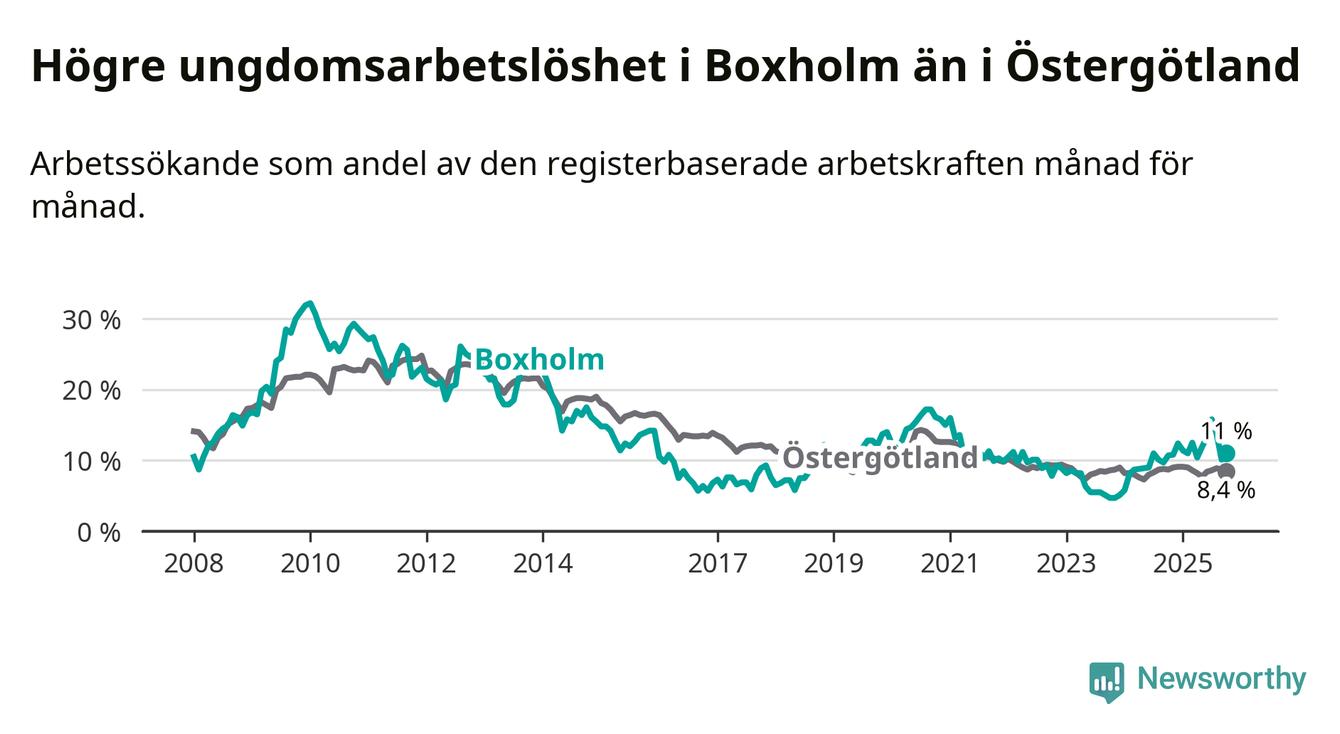 Medan Boxholm har lägre total arbetslöshet än Östergötland, ligger ungdomsarbetslösheten 2,6 procentenheter högre i Boxholm.