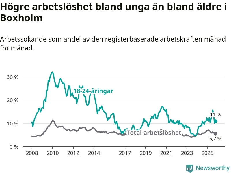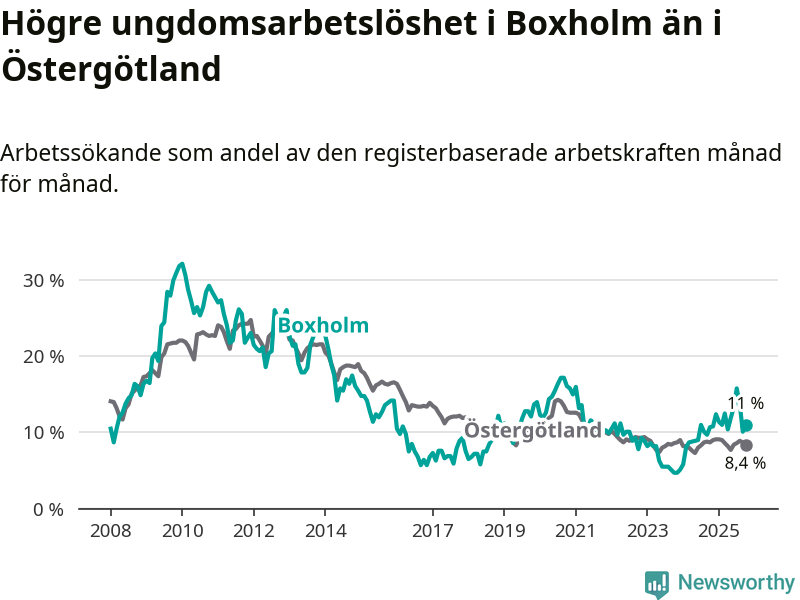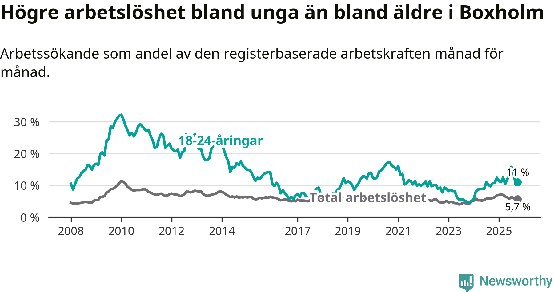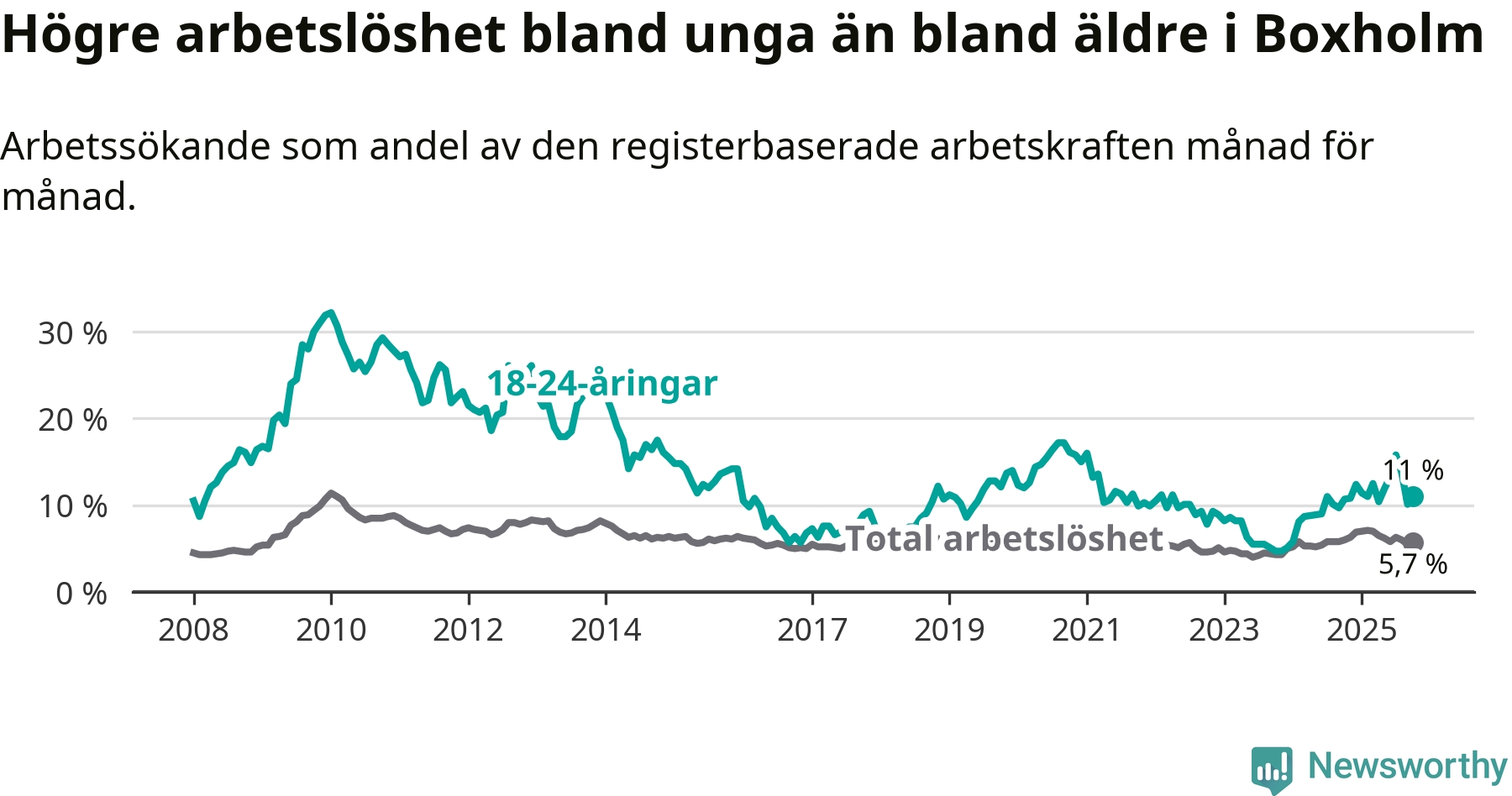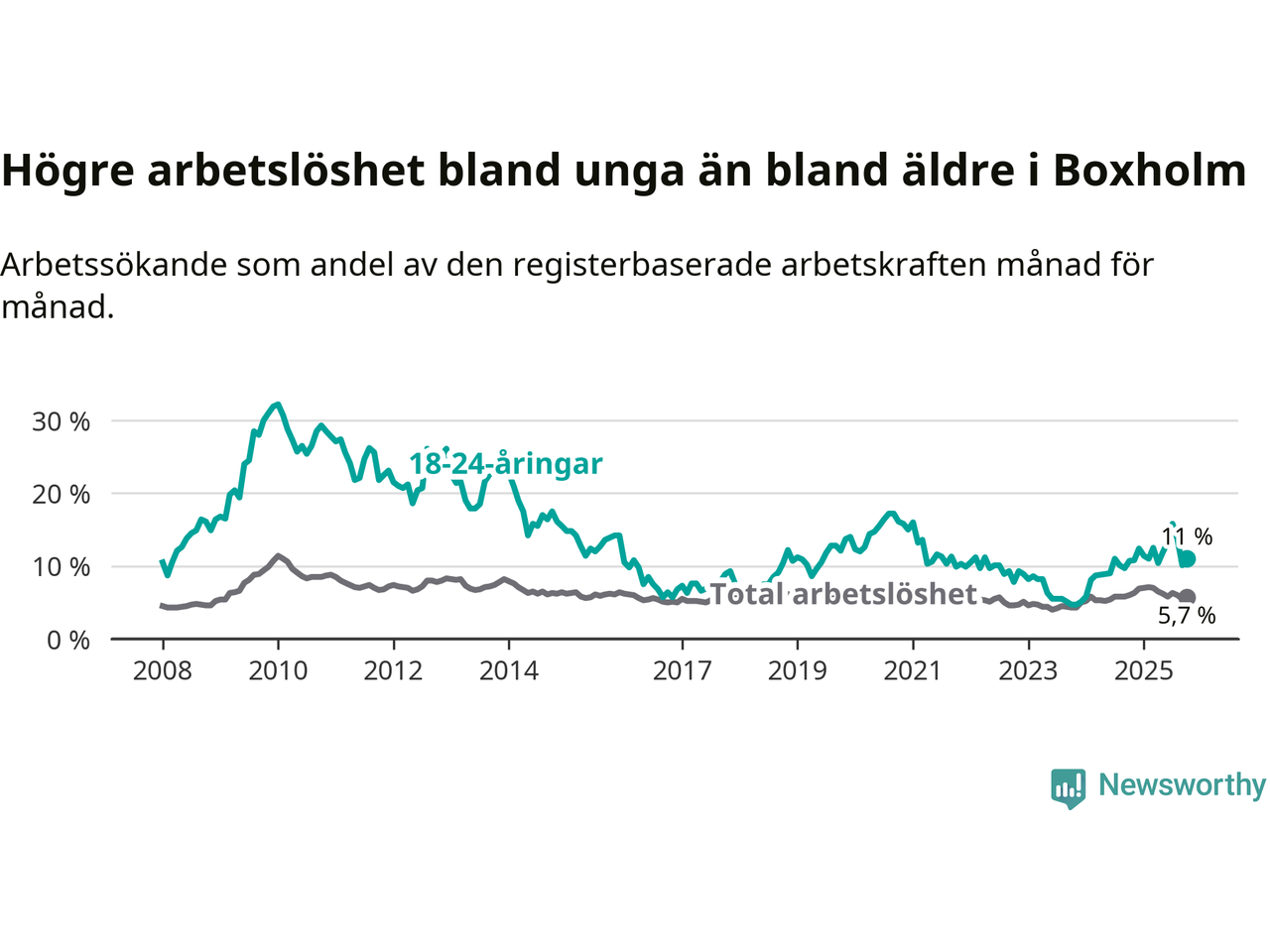 Medan Boxholm har lägre total arbetslöshet än Östergötland, ligger ungdomsarbetslösheten 2,6 procentenheter högre i Boxholm.
