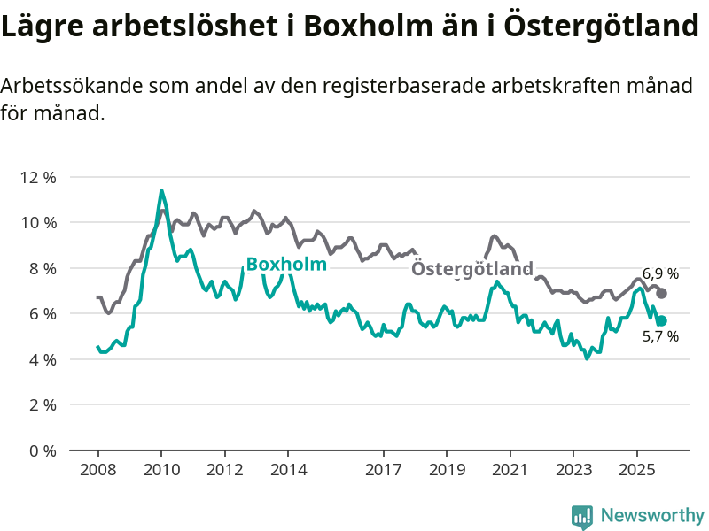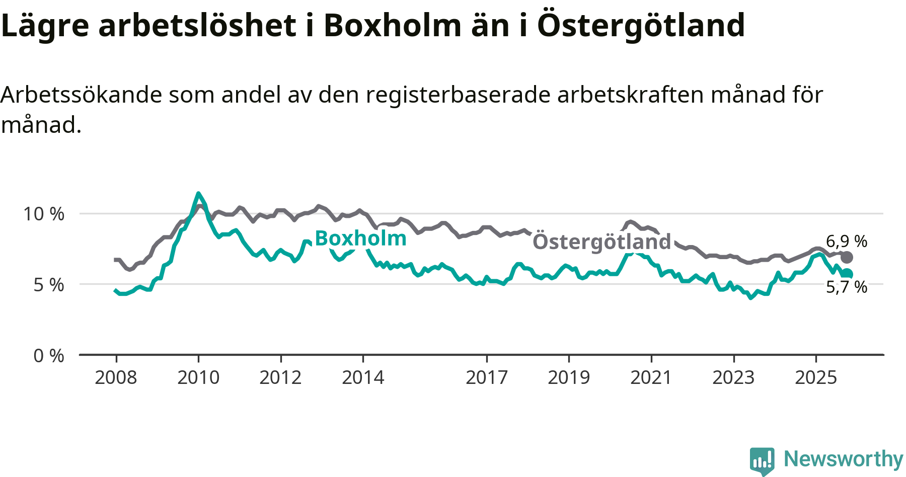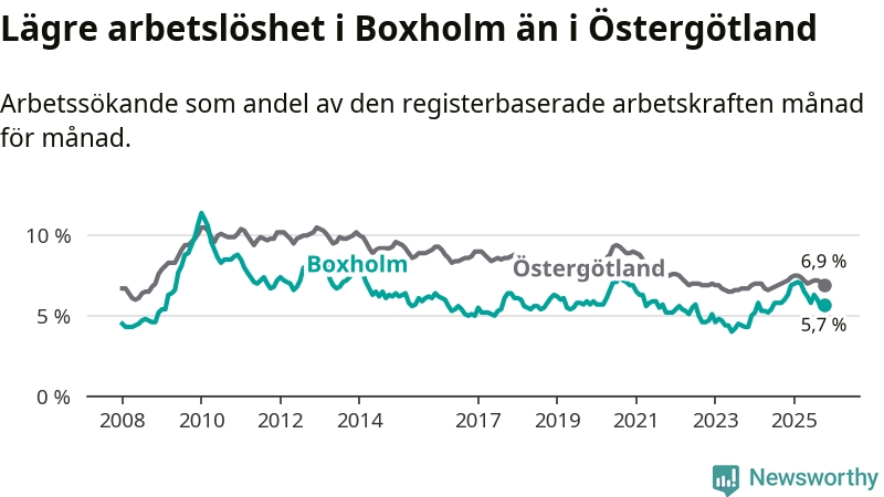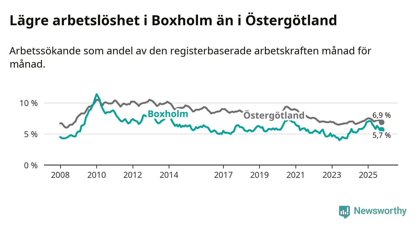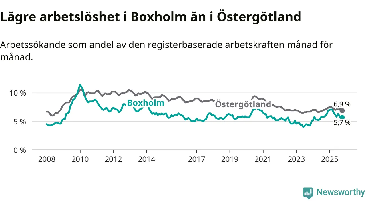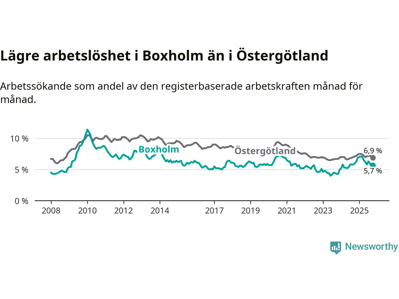 Anmärkningsvärt är att arbetslösheten nu, för första gången sedan november 2023, är lägre i Boxholm än snittet i Östergötland.