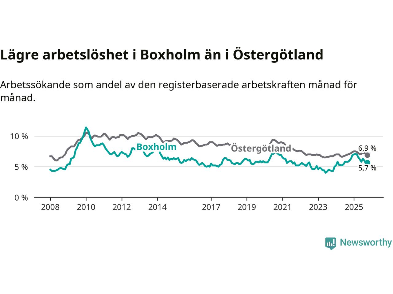 Under oktober månad rapporterade Boxholms kommun en total arbetslöshet på 5,7 procent. Det är en minskning jämfört med samma tidpunkt i fjol (−0,3 procentenheter). Även i Östergötlands län sjunker arbetslösheten något.