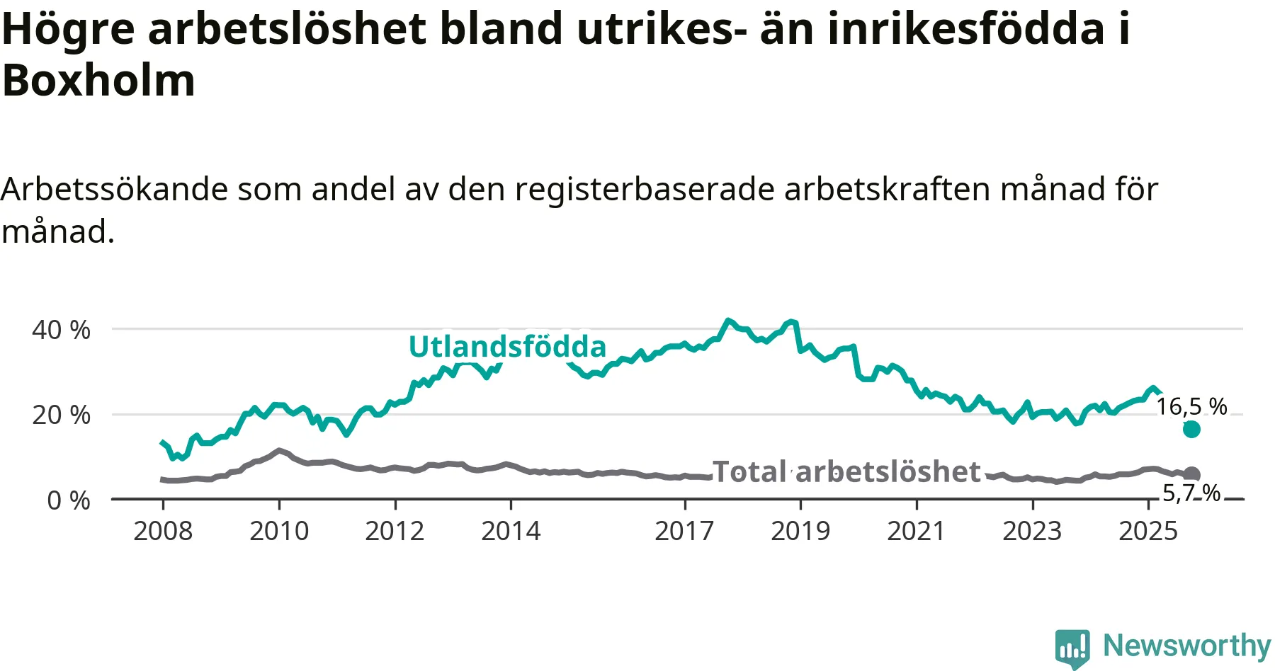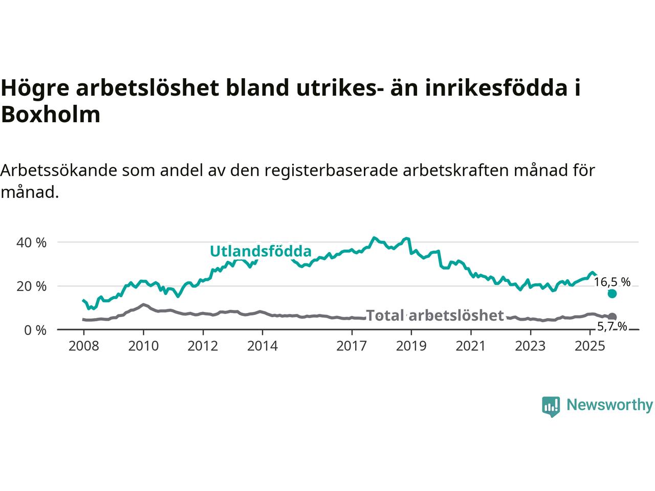 Skillnaden i arbetslöshet mellan utrikesfödda och hela befolkningen är 10,8 procentenheter i Boxholm. Det är en betydligt mindre skillnad än för ett år sedan (−6,2 procentenheter).