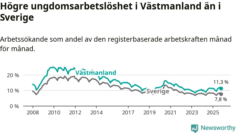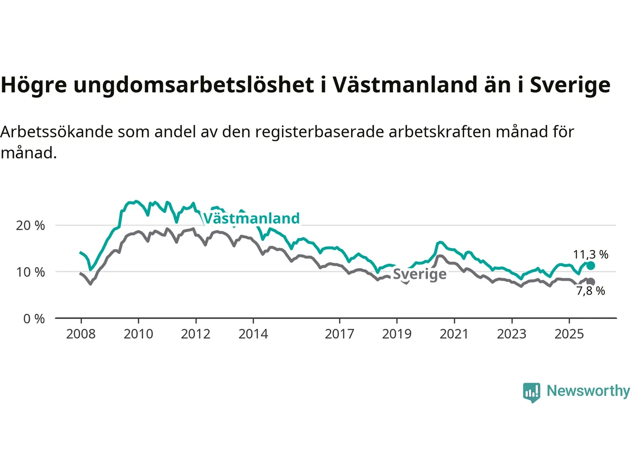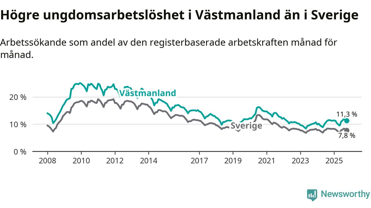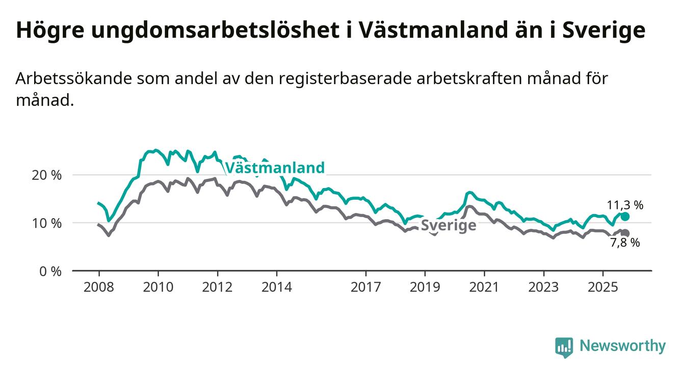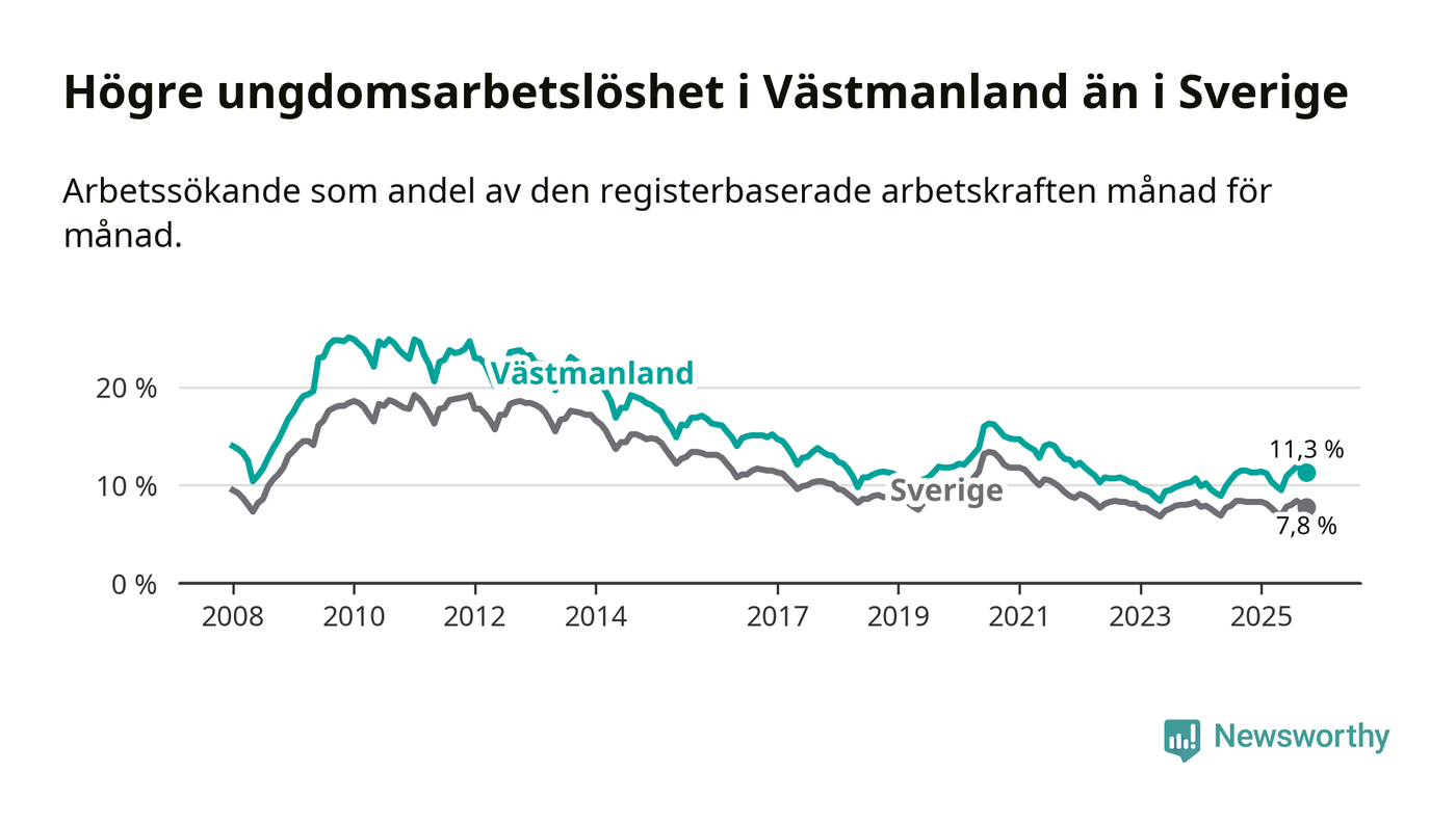 Precis som den totala arbetslösheten ligger ungdomsarbetslösheten i Västmanland högre än i Sverige som helhet. Skillnaden mellan länet och riket är 3,5 procentenheter.