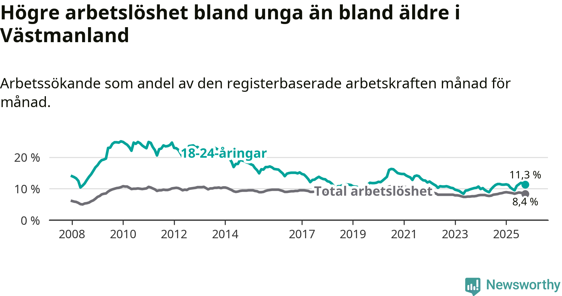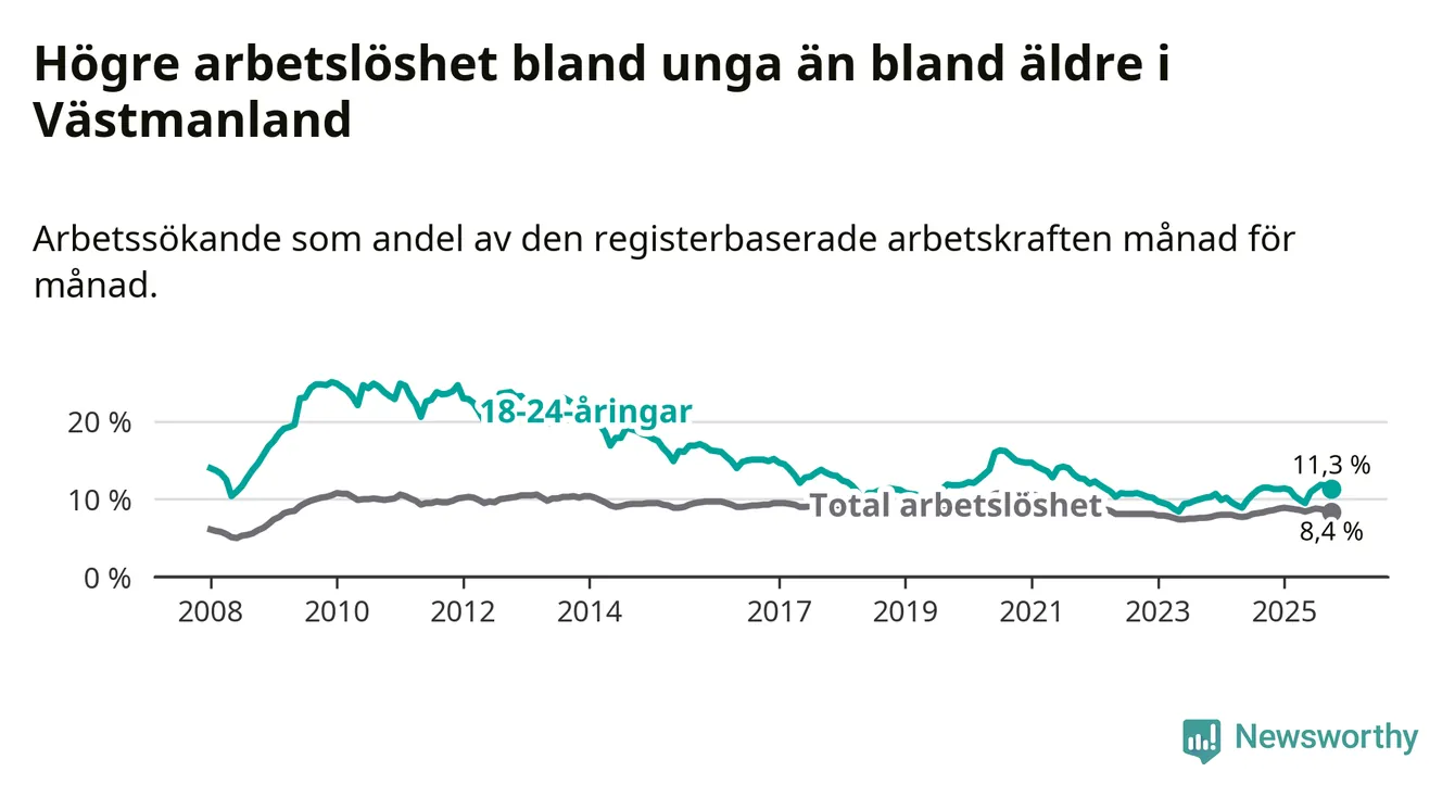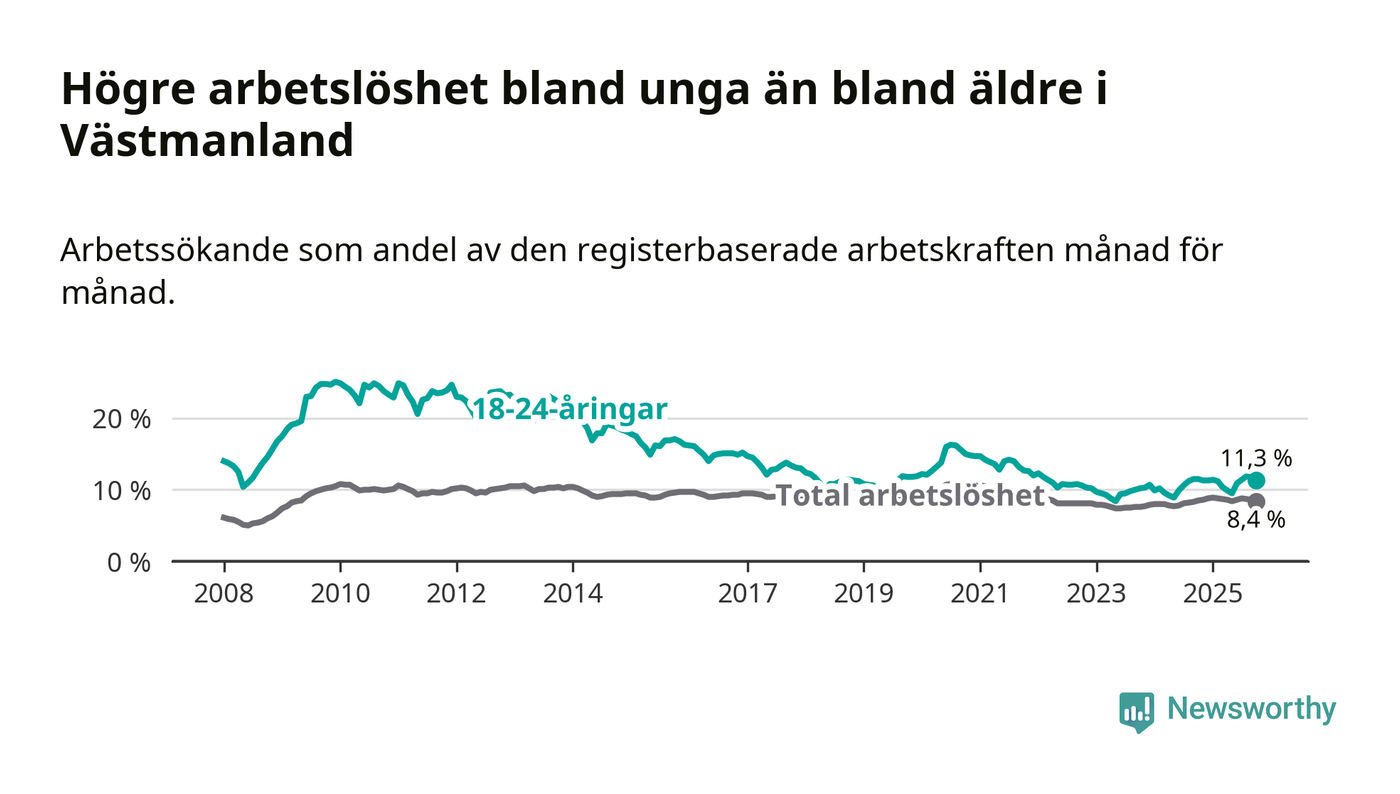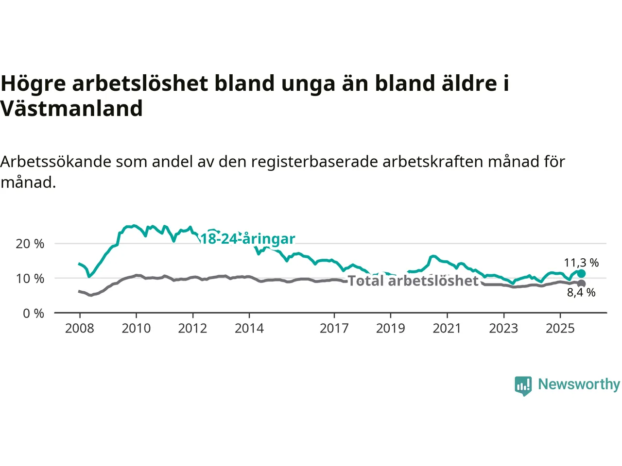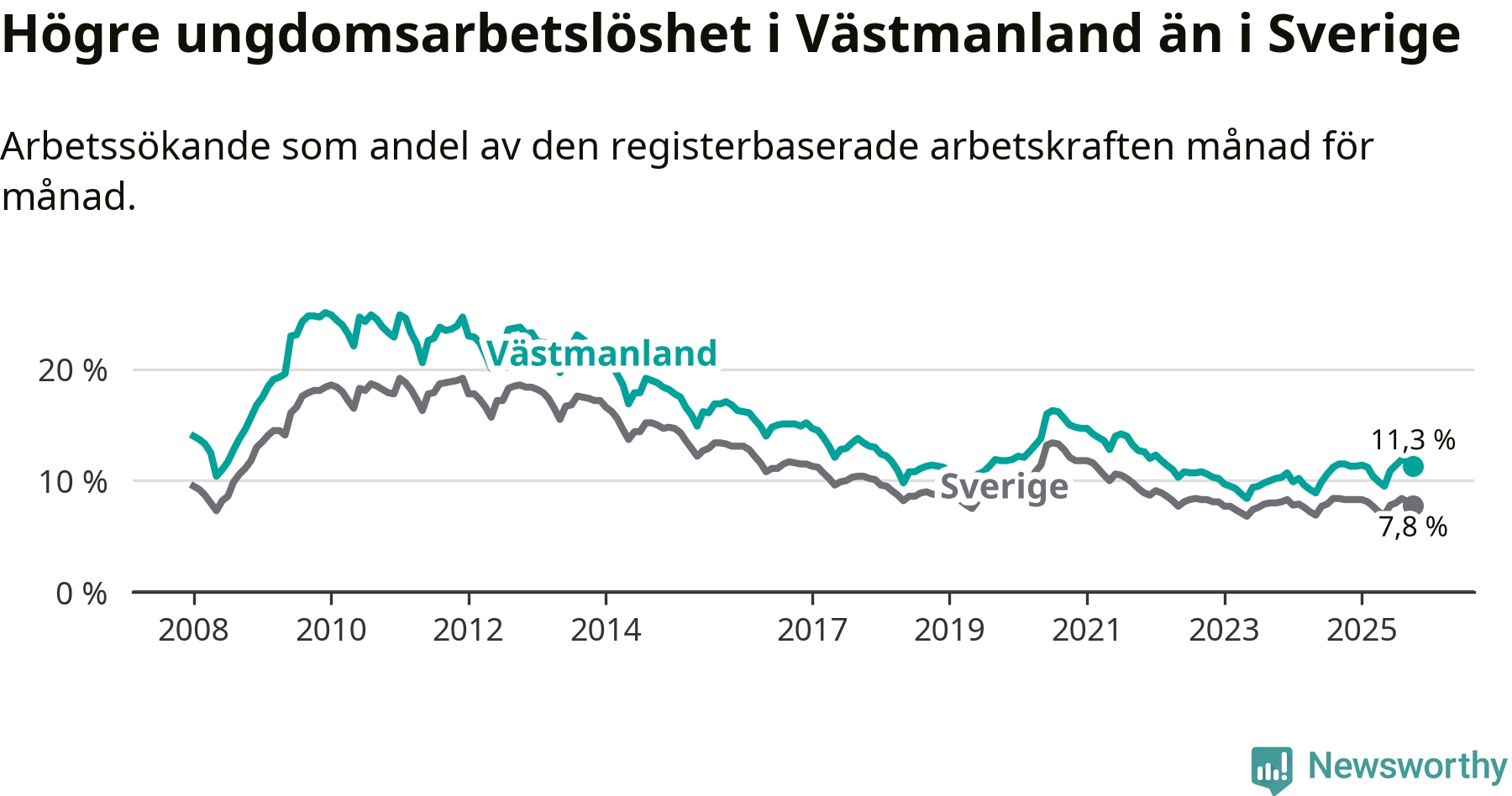 Precis som den totala arbetslösheten ligger ungdomsarbetslösheten i Västmanland högre än i Sverige som helhet. Skillnaden mellan länet och riket är 3,5 procentenheter.