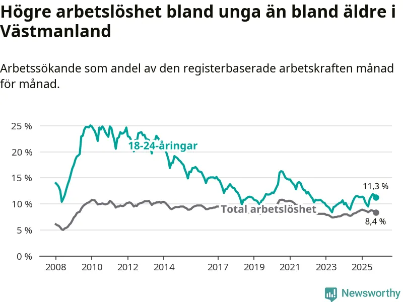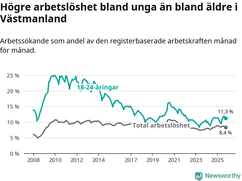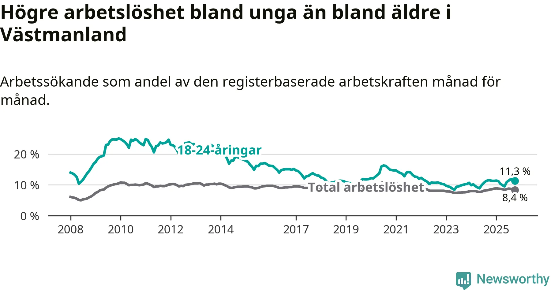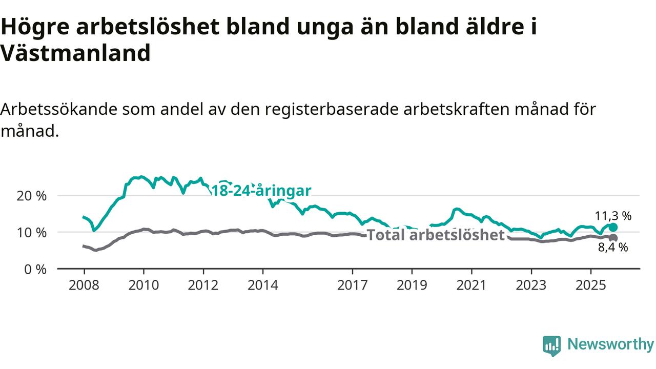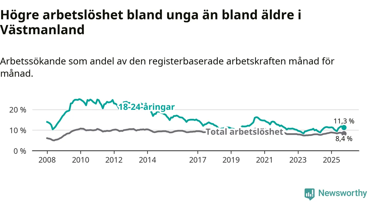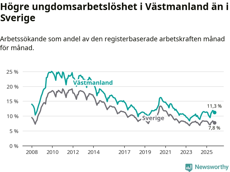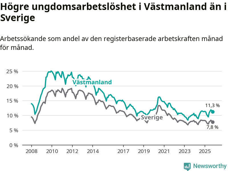 Precis som den totala arbetslösheten ligger ungdomsarbetslösheten i Västmanland högre än i Sverige som helhet. Skillnaden mellan länet och riket är 3,5 procentenheter.