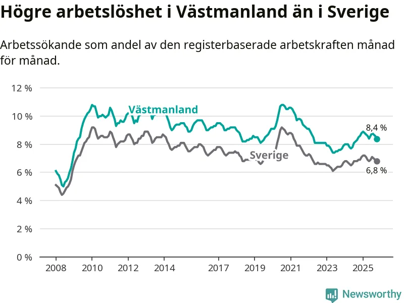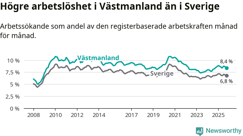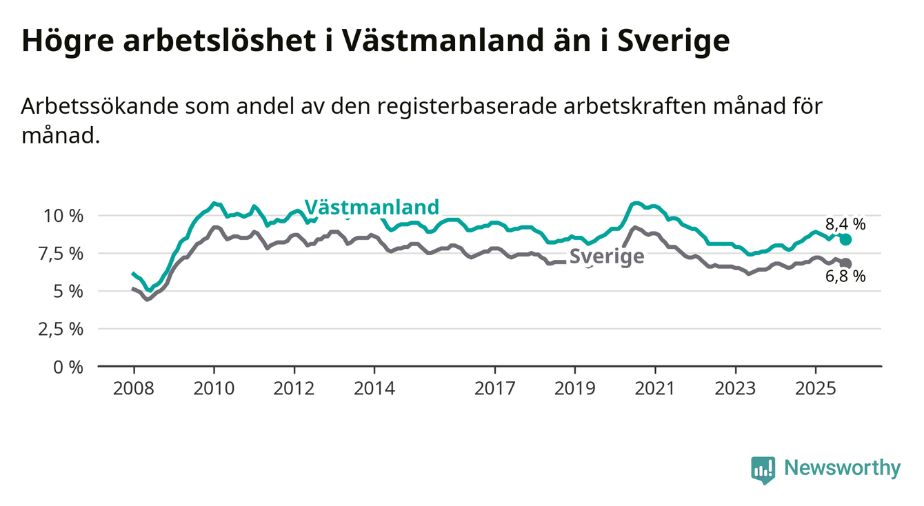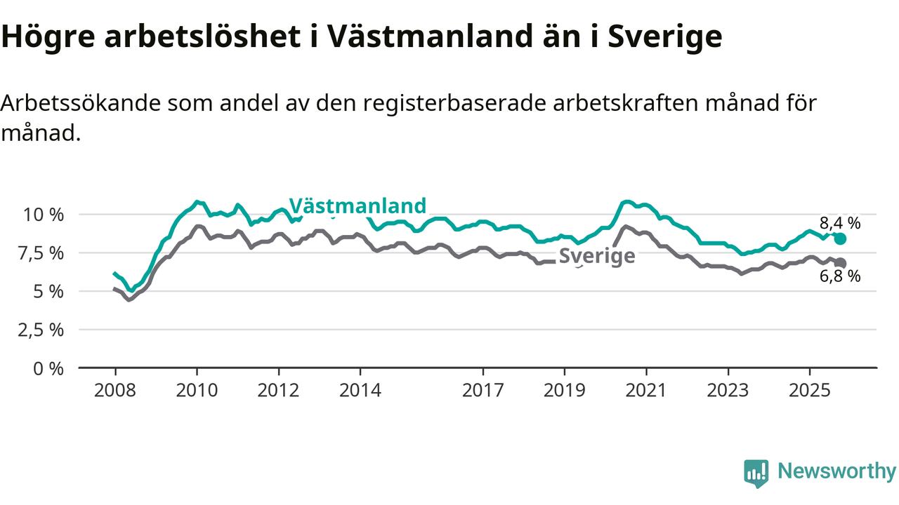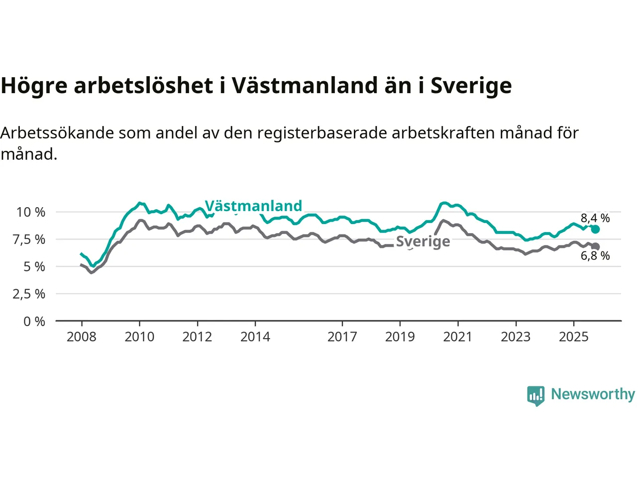 Även om arbetslösheten i Västmanland alltså minskar, så ligger den fortfarande över snittet i hela Sverige (8,4 procent i länet, jämfört med 6,8 procent i hela riket). Norrbotten har den lägsta arbetslösheten i riket (3,9 procent), medan Skåne har den högsta (8,8 procent). För att Västmanland skulle komma ner i samma arbetslöshetsnivå som Norrbotten skulle 6 140 personer behöva sysselsättas.
