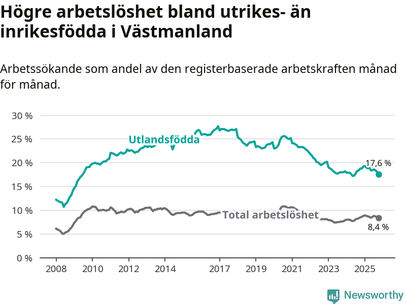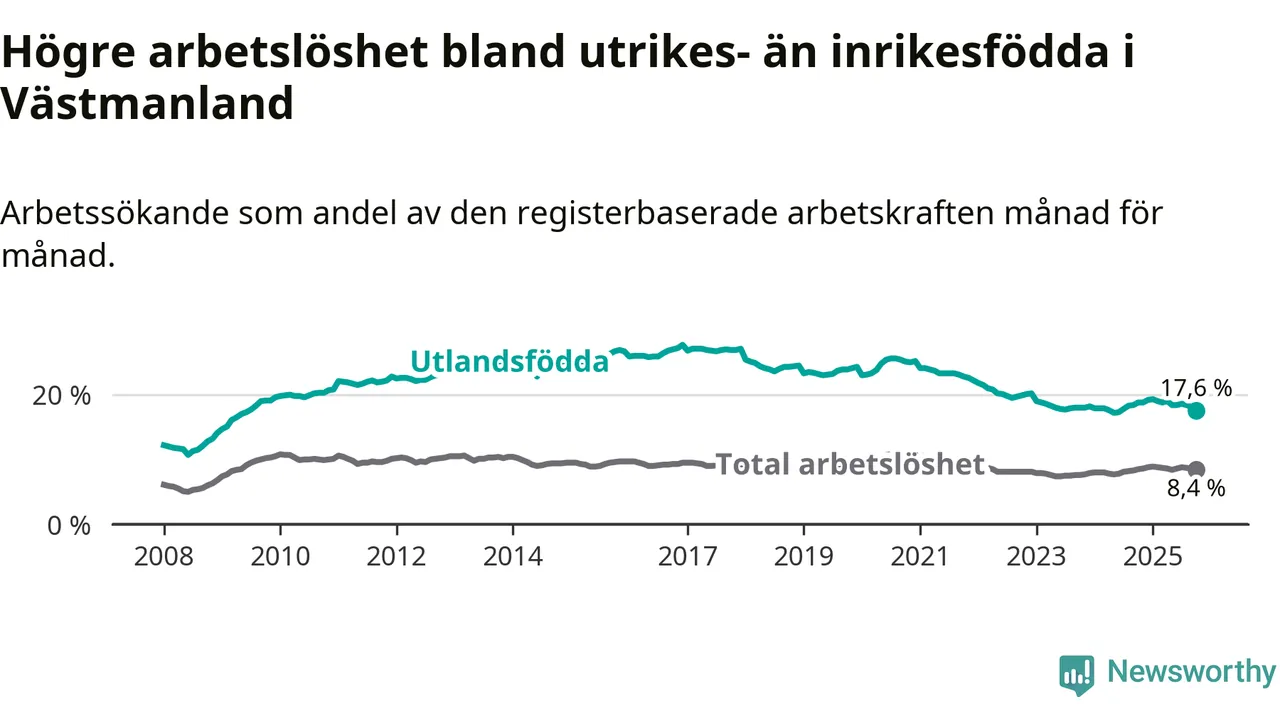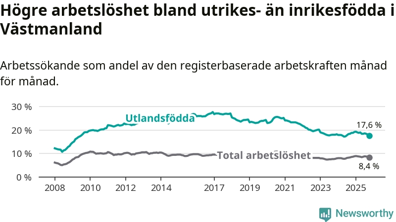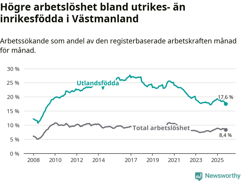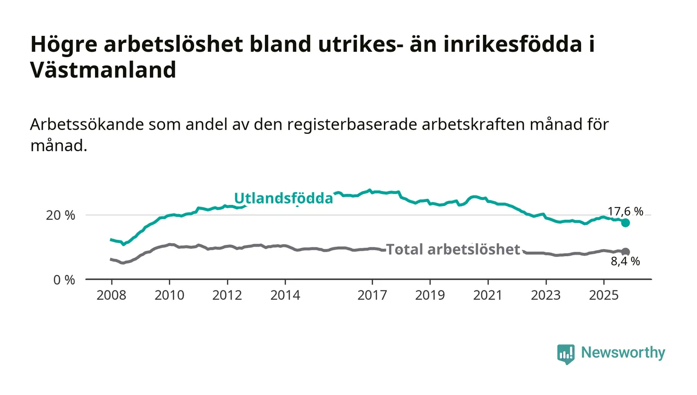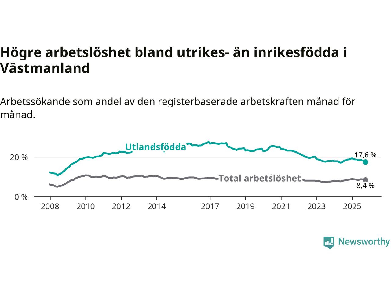 Arbetslösheten bland utlandsfödda var 17,6 procent i Västmanland under oktober månad, motsvarande 6 459 av 36 699 personer. Det är 1,2 procentenheter färre än vid samma tidpunkt i fjol (−337 om man räknar personer).