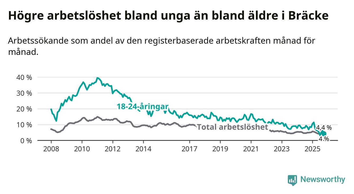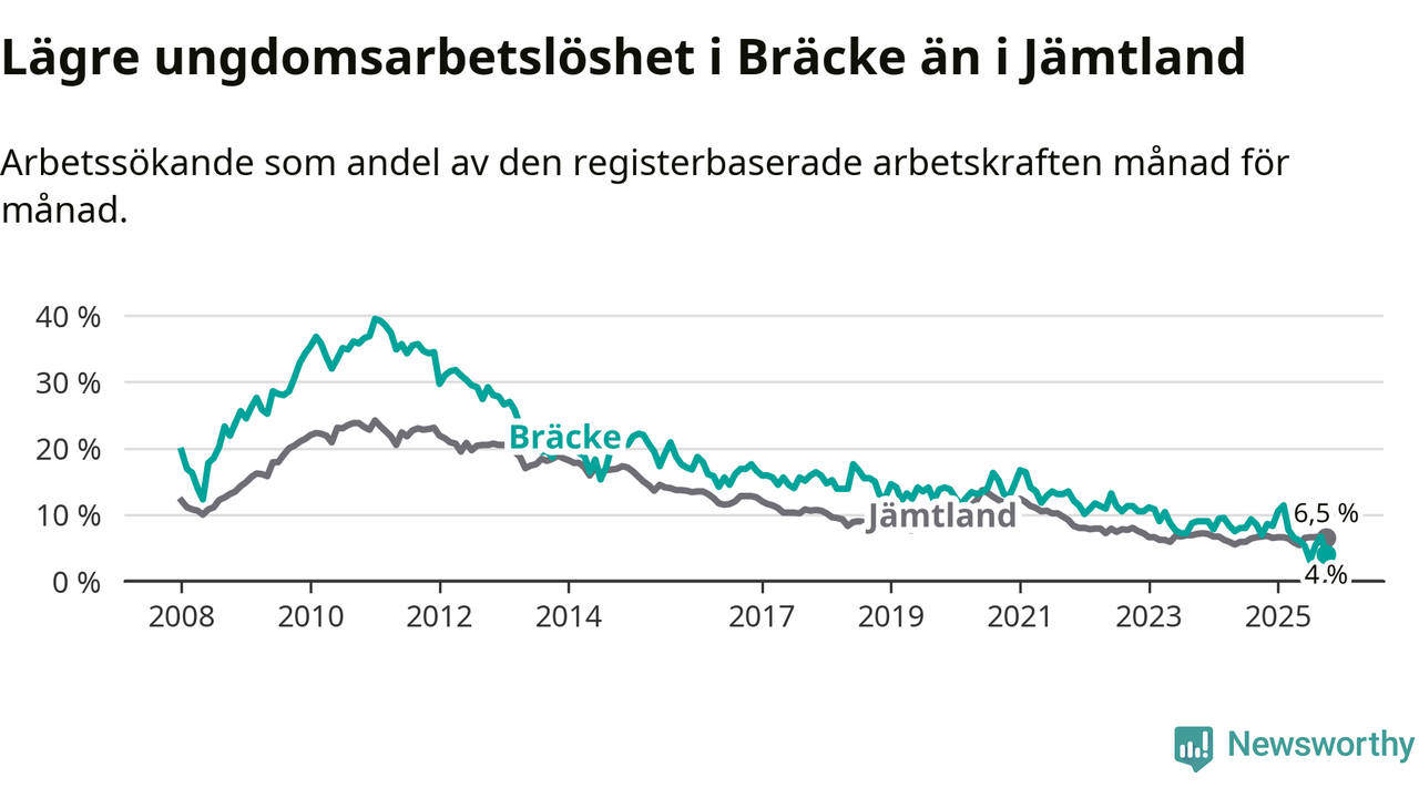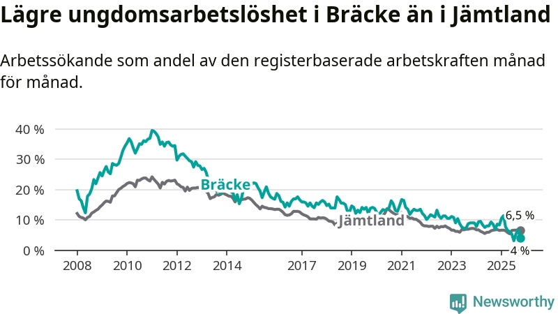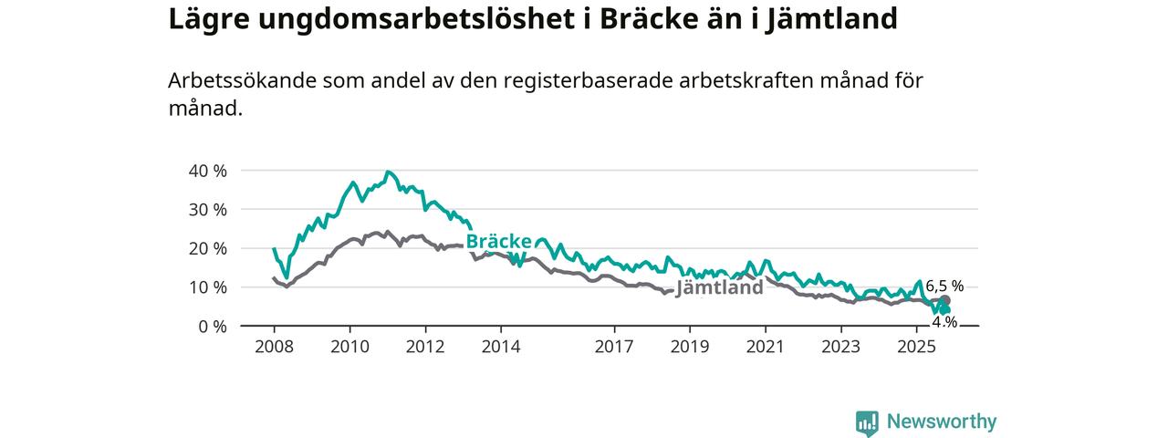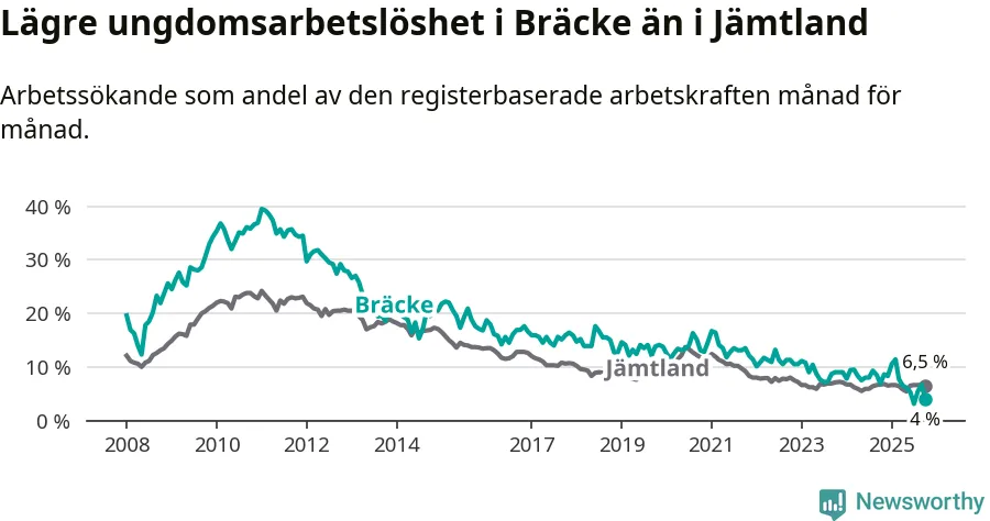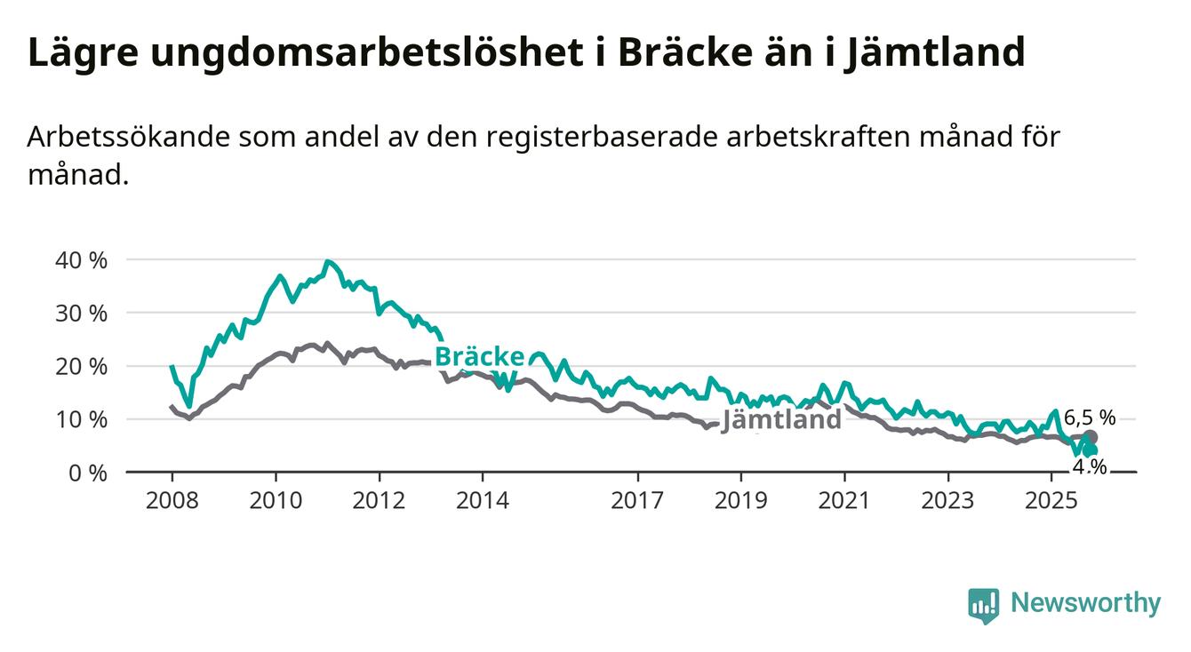 I och med den senaste månadens nedgång har de ungas arbetslöshet i Bräcke sjunkit åtta månader i följd (ner från 11,4 procent i februari till 4,0 procent nu).