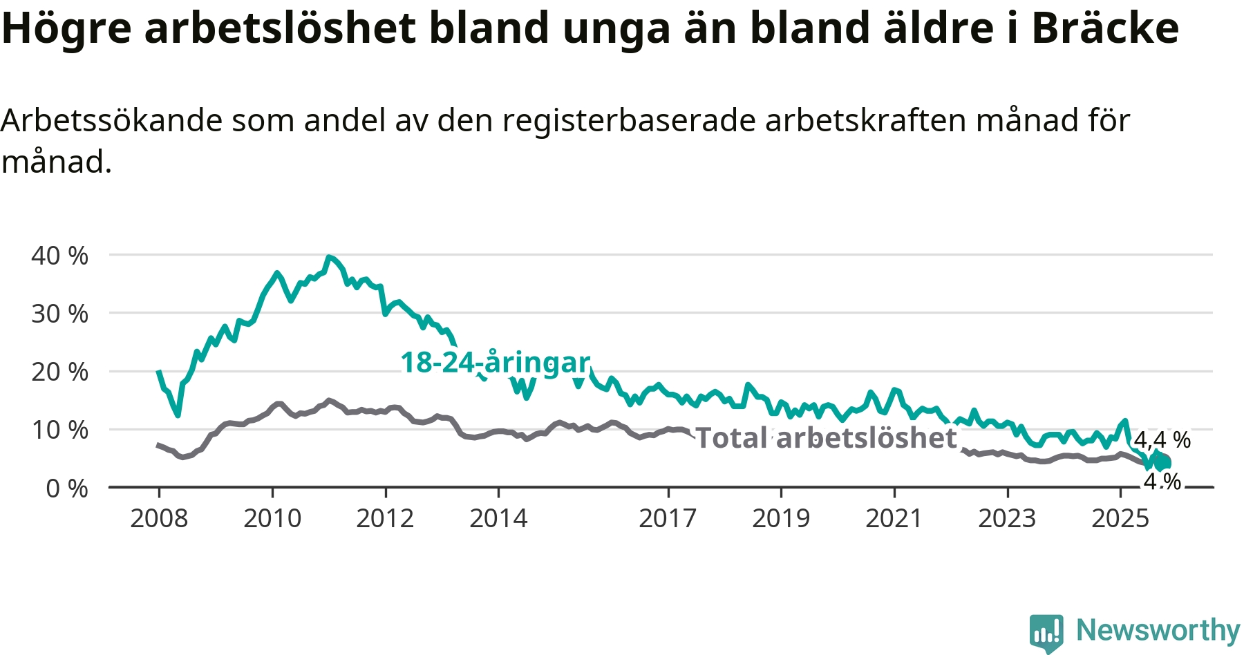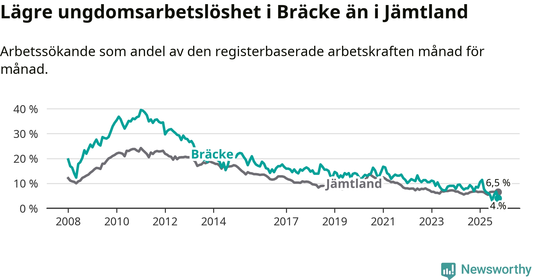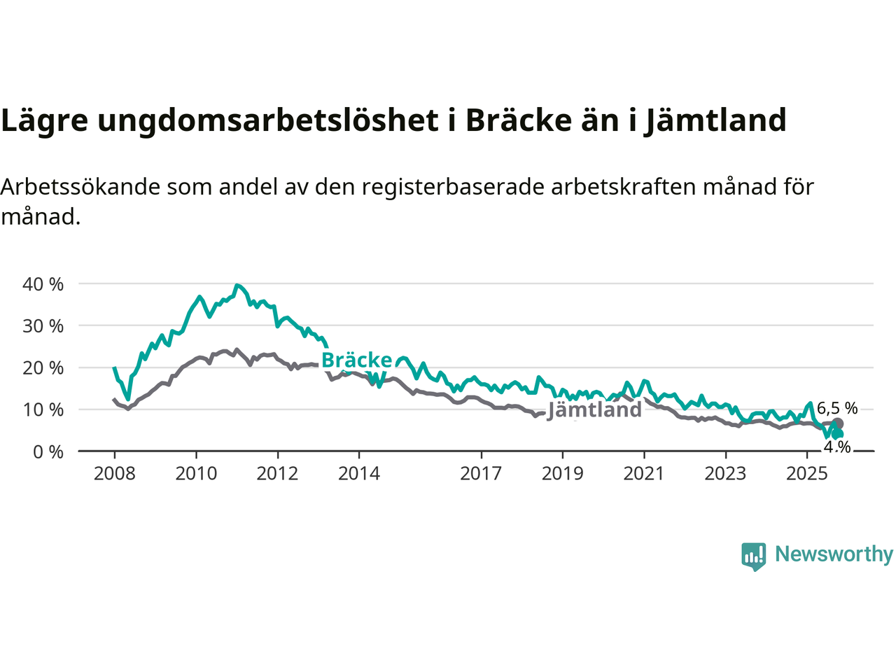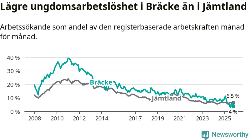 I och med den senaste månadens nedgång har de ungas arbetslöshet i Bräcke sjunkit åtta månader i följd (ner från 11,4 procent i februari till 4,0 procent nu).