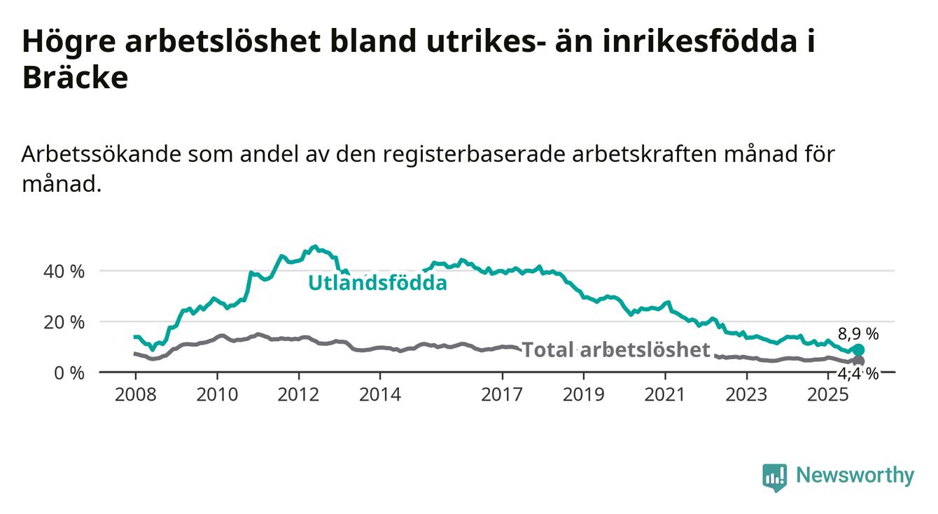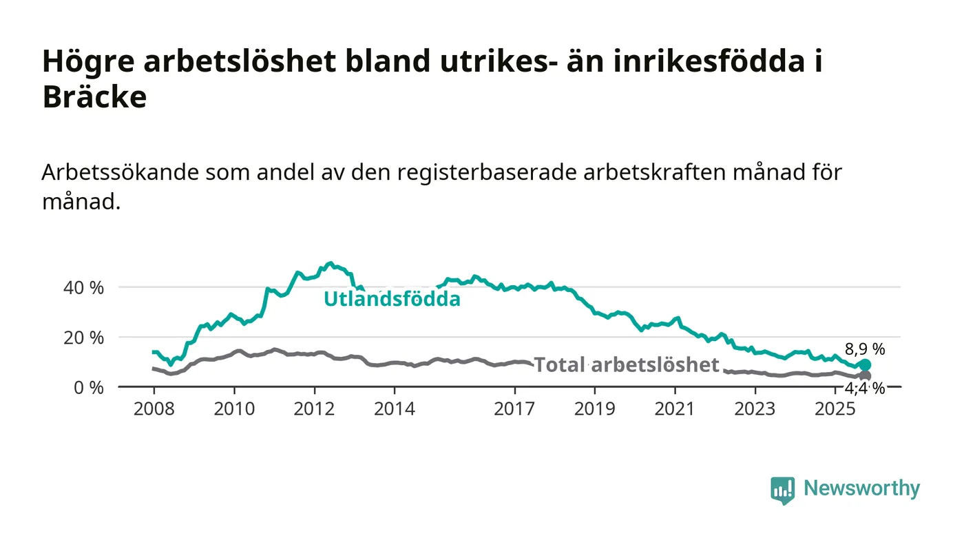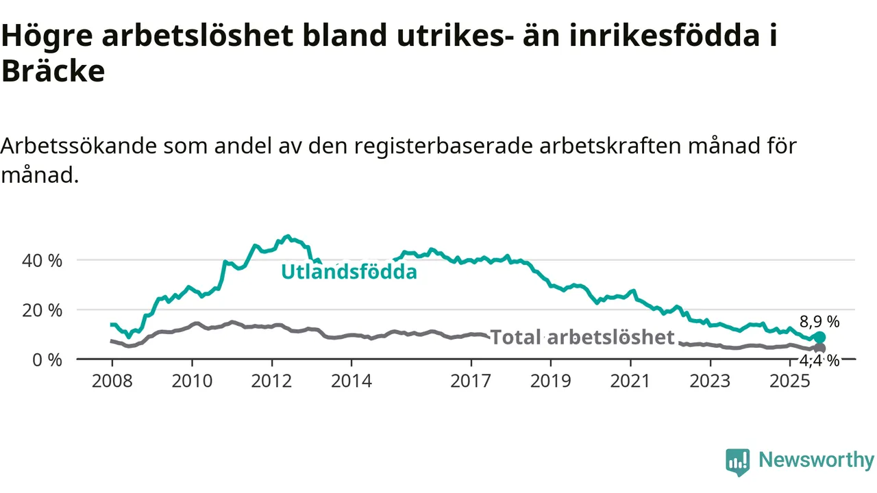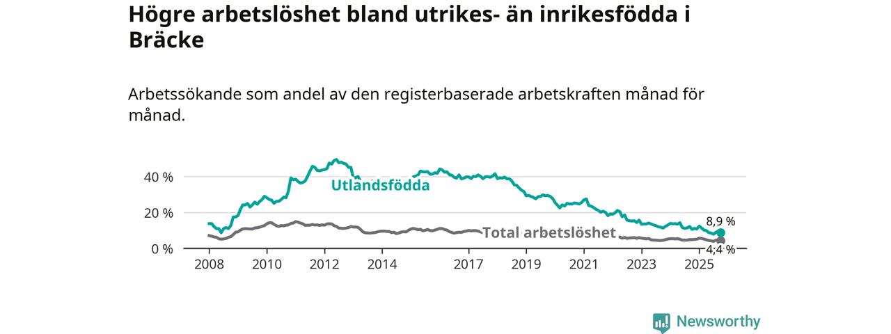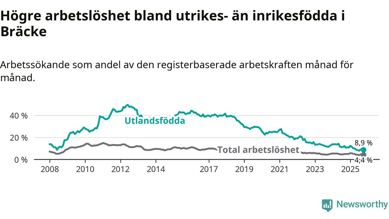 Arbetslösheten bland utlandsfödda var 8,9 procent i Bräcke under oktober månad, motsvarande 34 av 382 personer. Det är 1,7 procentenheter färre än vid samma tidpunkt i fjol (−5 om man räknar personer). Därmed är de utlandsföddas arbetslöshet lägre än vid samma tidpunkt i fjol för 13:e månaden i följd. Sedan september 2024 har arbetslösheten bland utlandsfödda minskat från 12,2 till 8,9 procent.