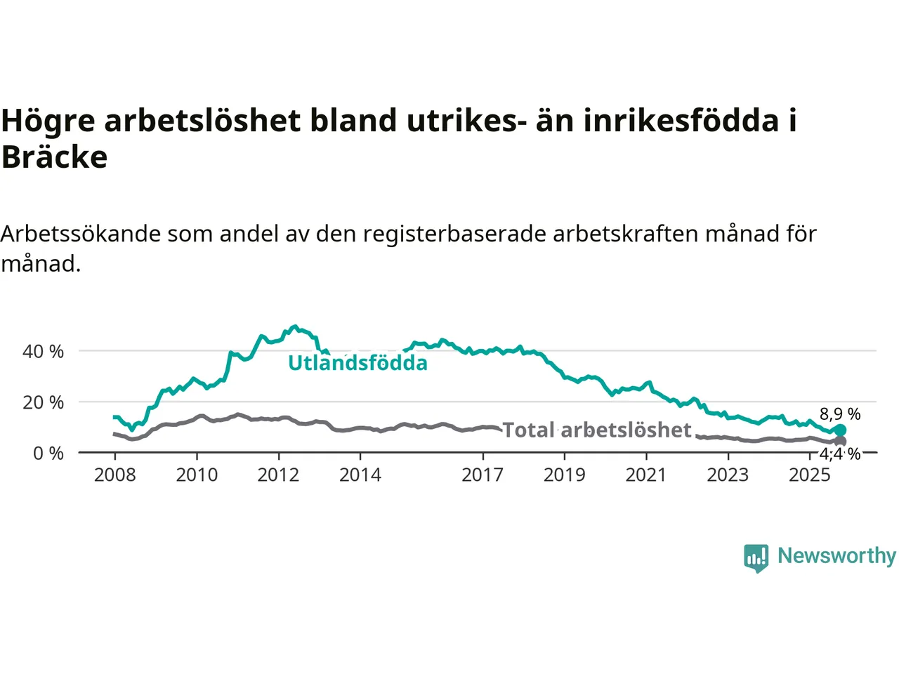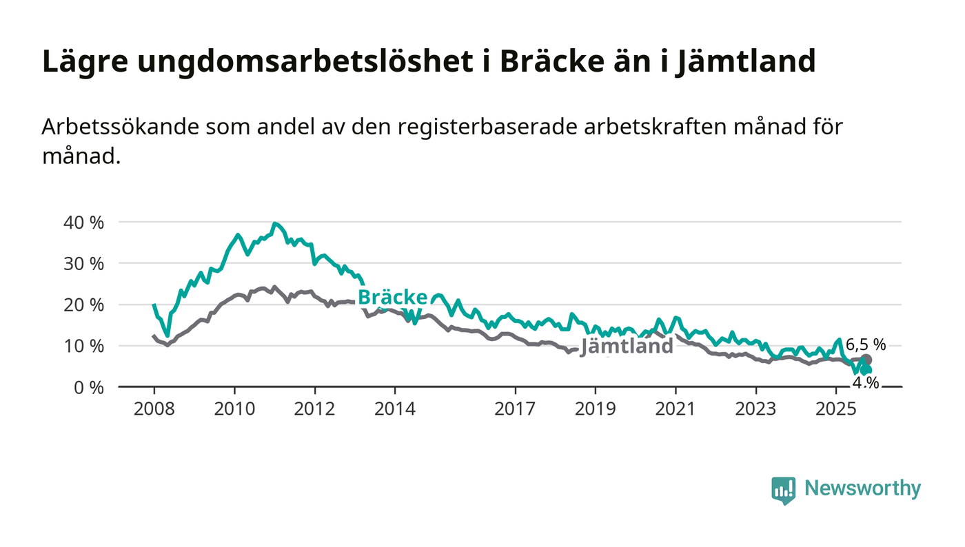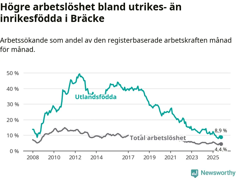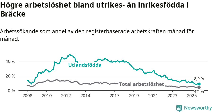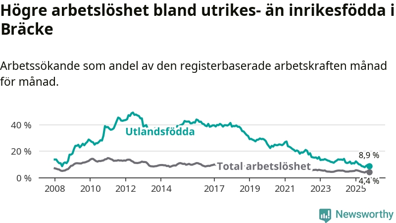 Arbetslösheten bland utlandsfödda var 8,9 procent i Bräcke under oktober månad, motsvarande 34 av 382 personer. Det är 1,7 procentenheter färre än vid samma tidpunkt i fjol (−5 om man räknar personer). Därmed är de utlandsföddas arbetslöshet lägre än vid samma tidpunkt i fjol för 13:e månaden i följd. Sedan september 2024 har arbetslösheten bland utlandsfödda minskat från 12,2 till 8,9 procent.