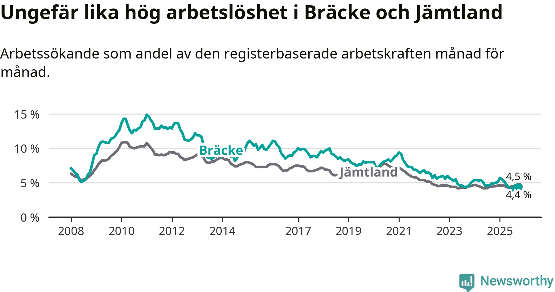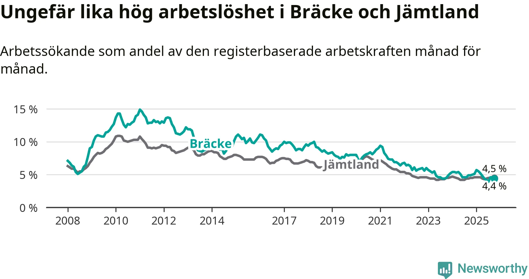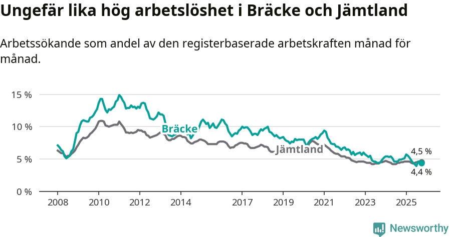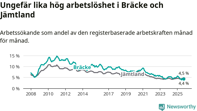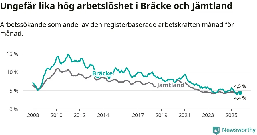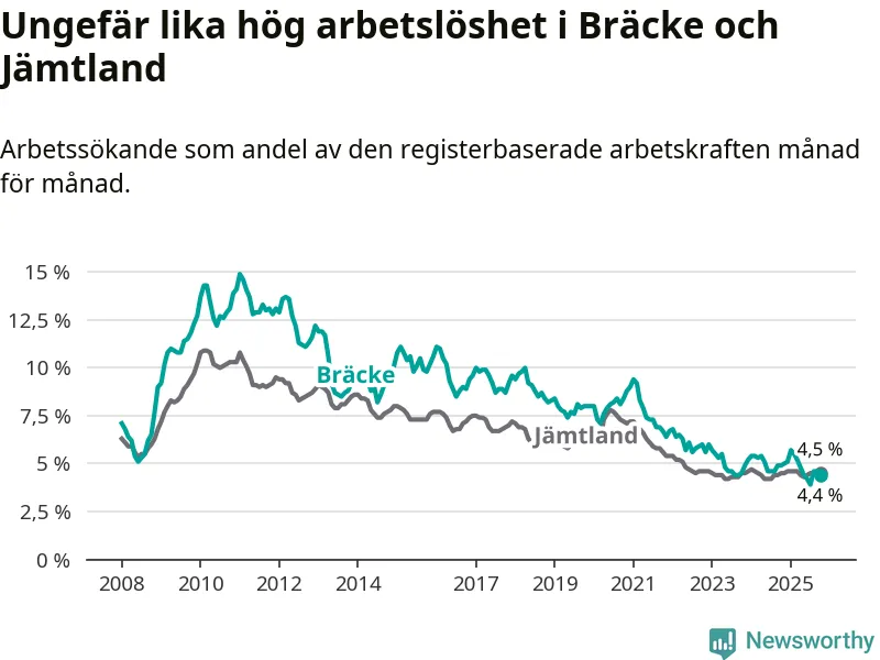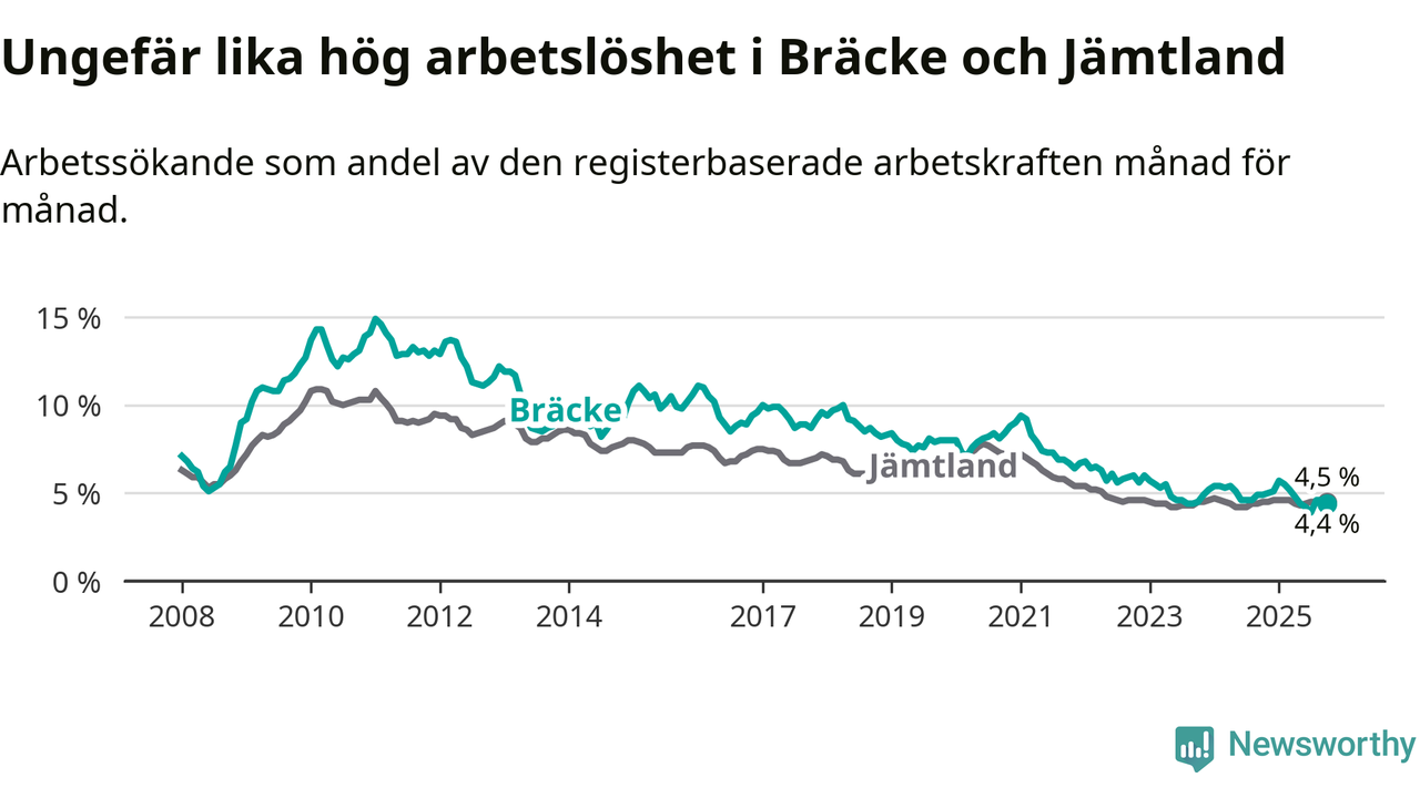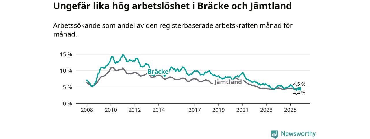 Under oktober månad rapporterade Bräcke kommun en total arbetslöshet på 4,4 procent. Det är en minskning jämfört med samma tidpunkt i fjol (−0,5 procentenheter). I Jämtlands län däremot står arbetslösheten stilla.