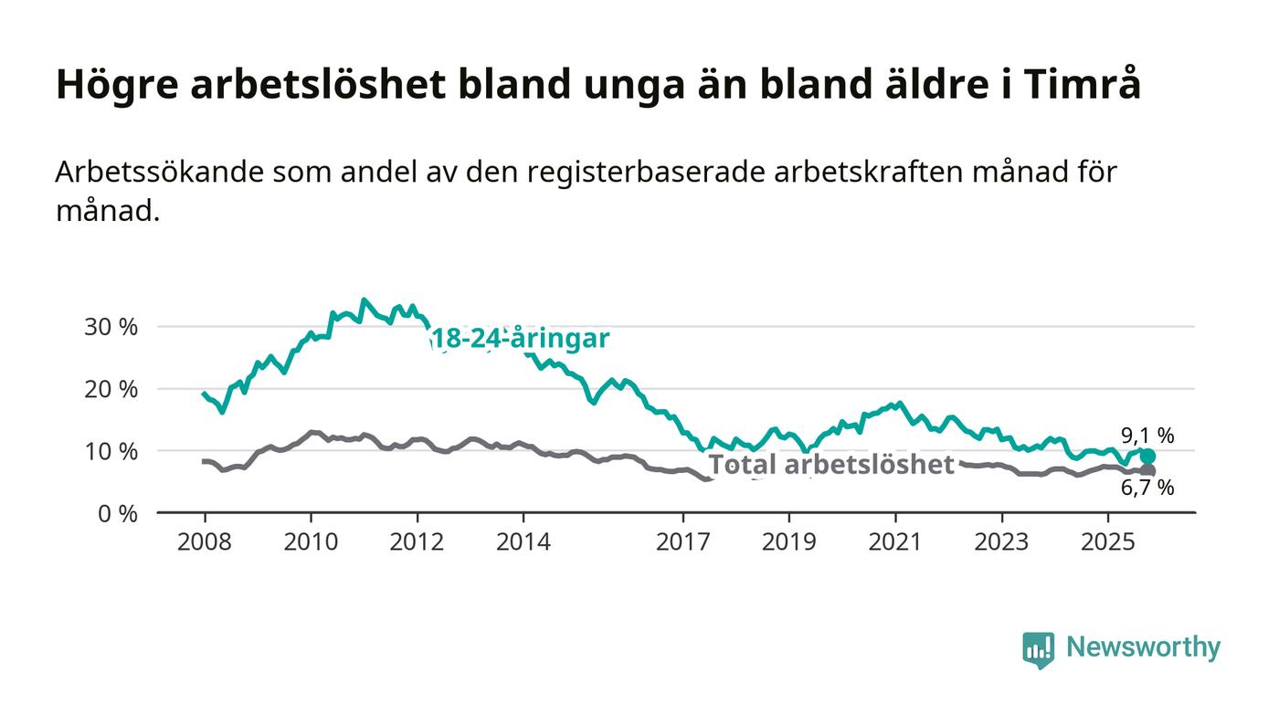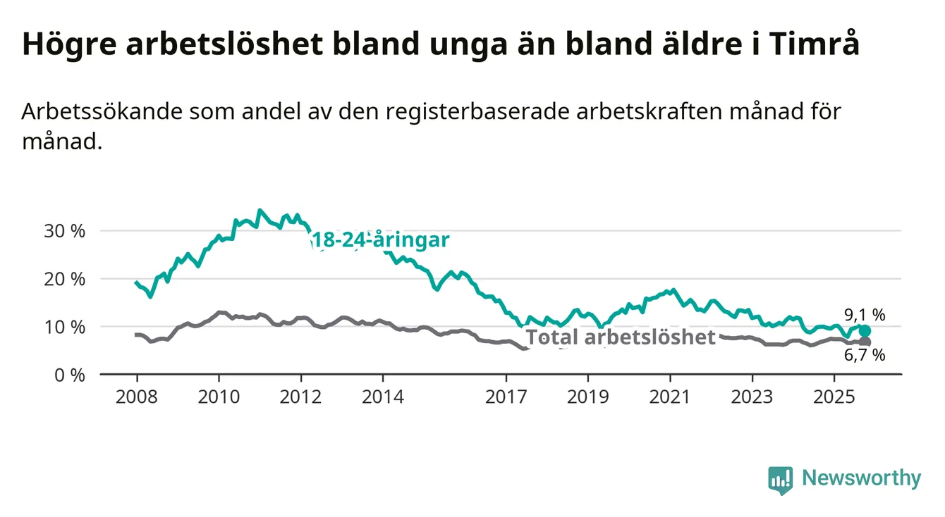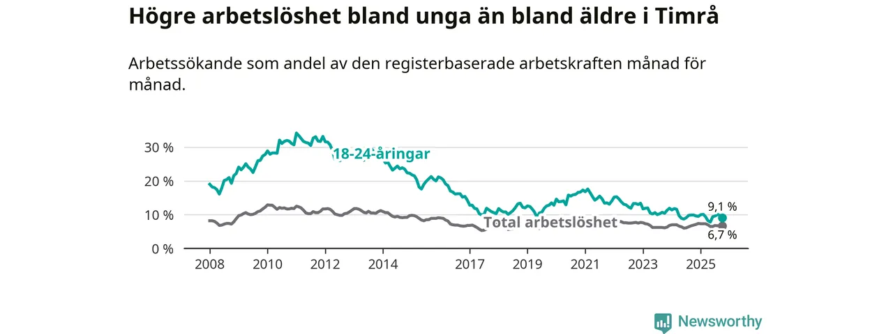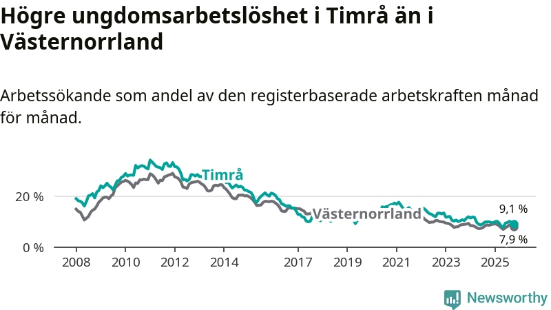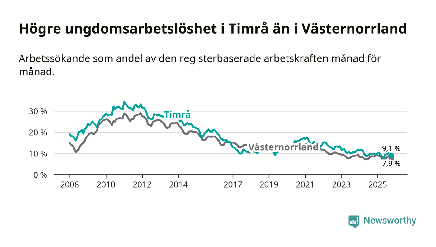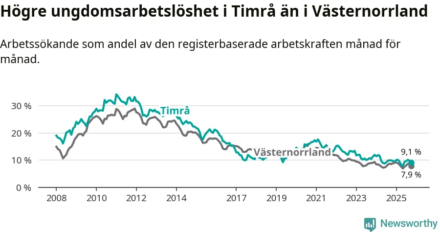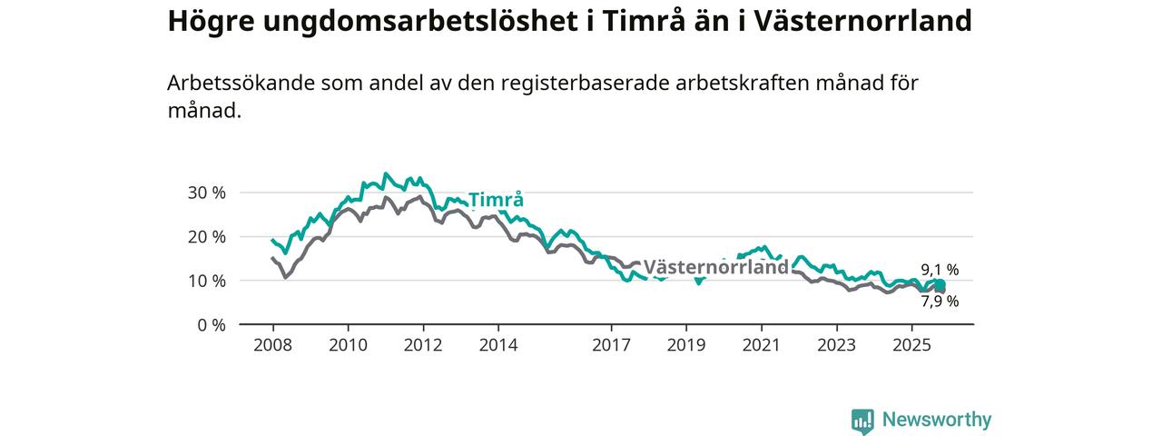 Precis som den totala arbetslösheten ligger ungdomsarbetslösheten i Timrå högre än i Västernorrland som helhet. Skillnaden mellan kommunen och länet är 1,2 procentenheter.