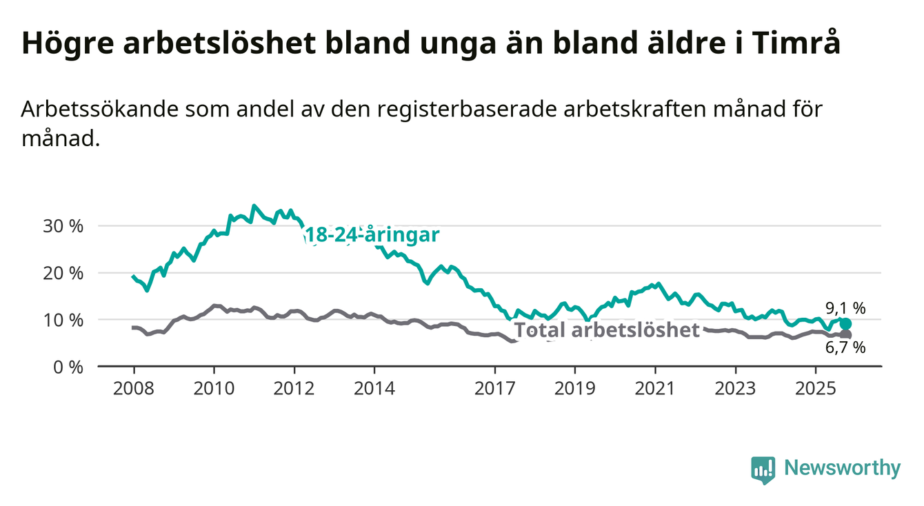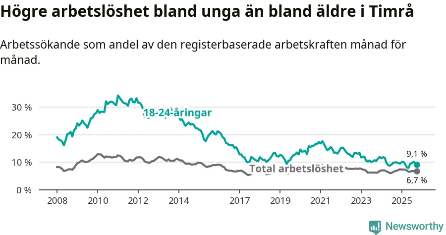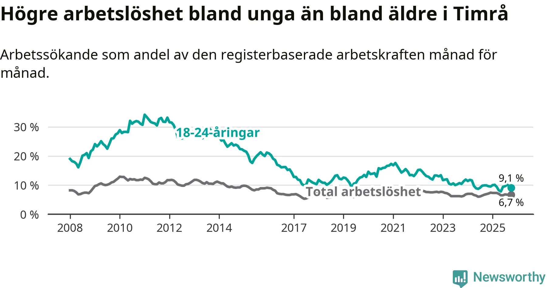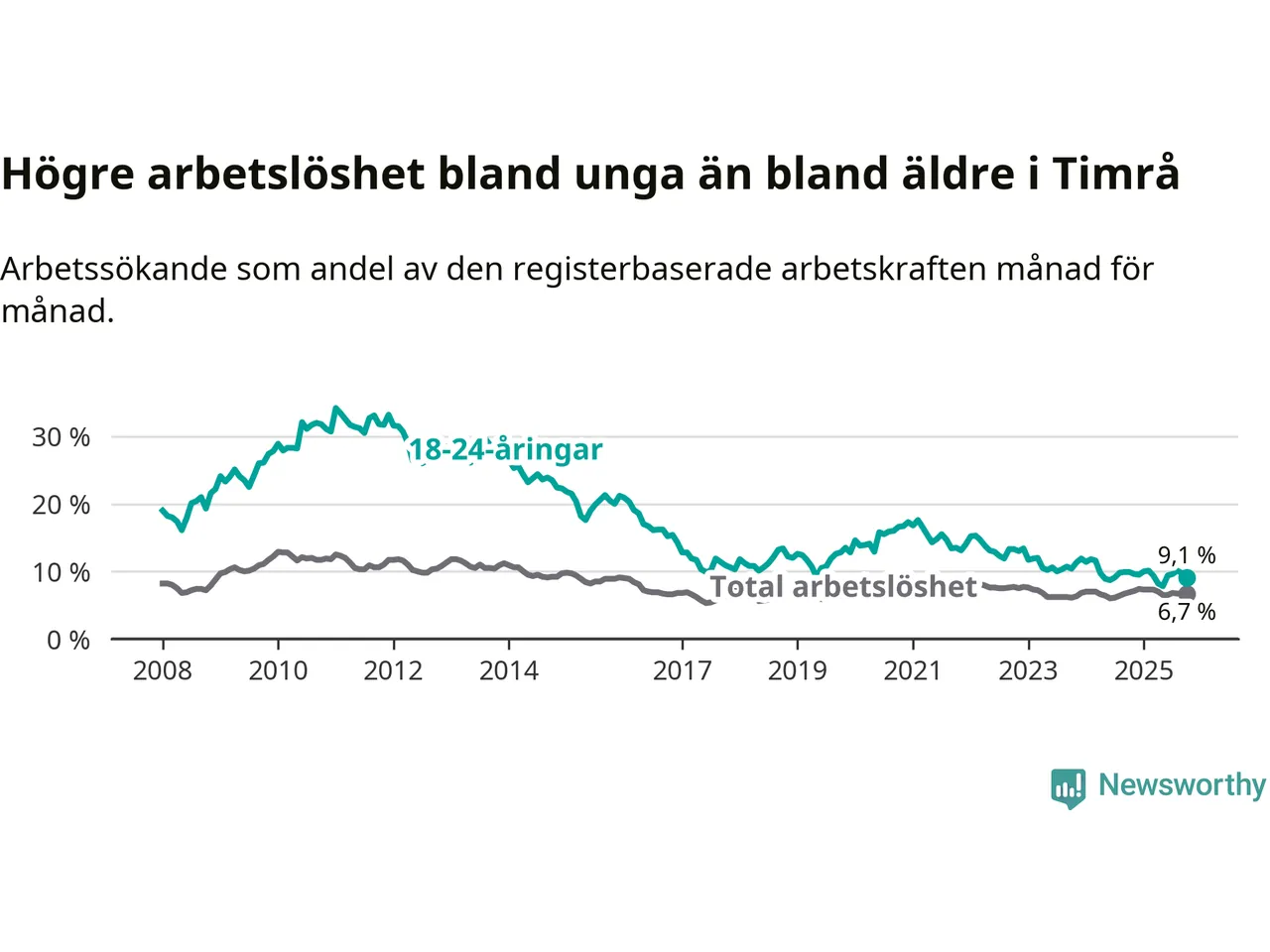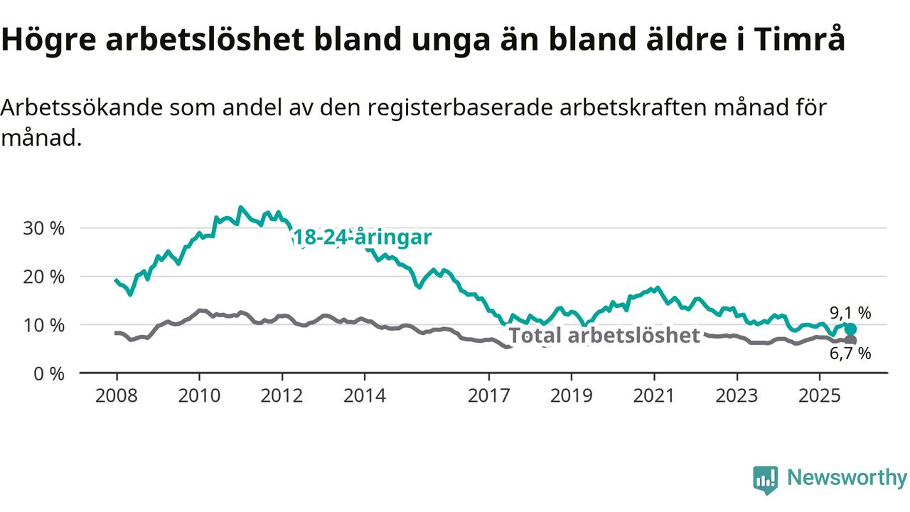 Precis som den totala arbetslösheten ligger ungdomsarbetslösheten i Timrå högre än i Västernorrland som helhet. Skillnaden mellan kommunen och länet är 1,2 procentenheter.