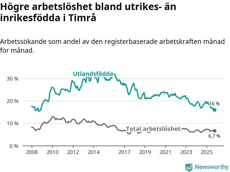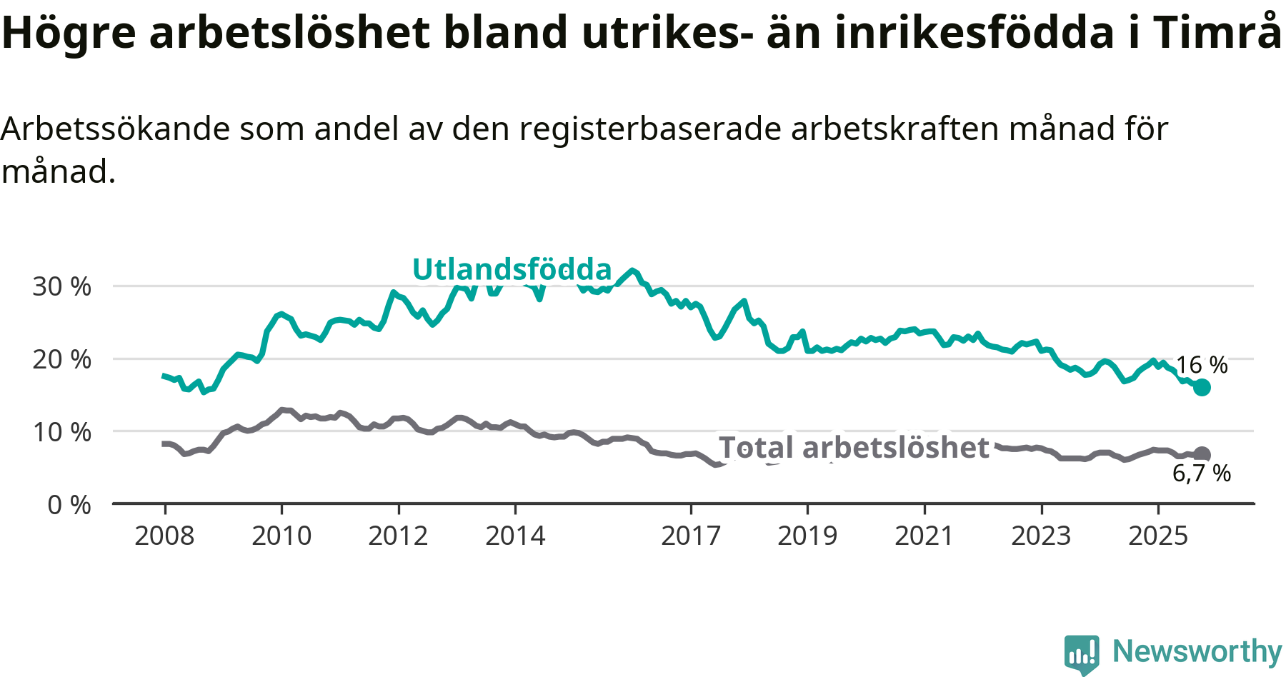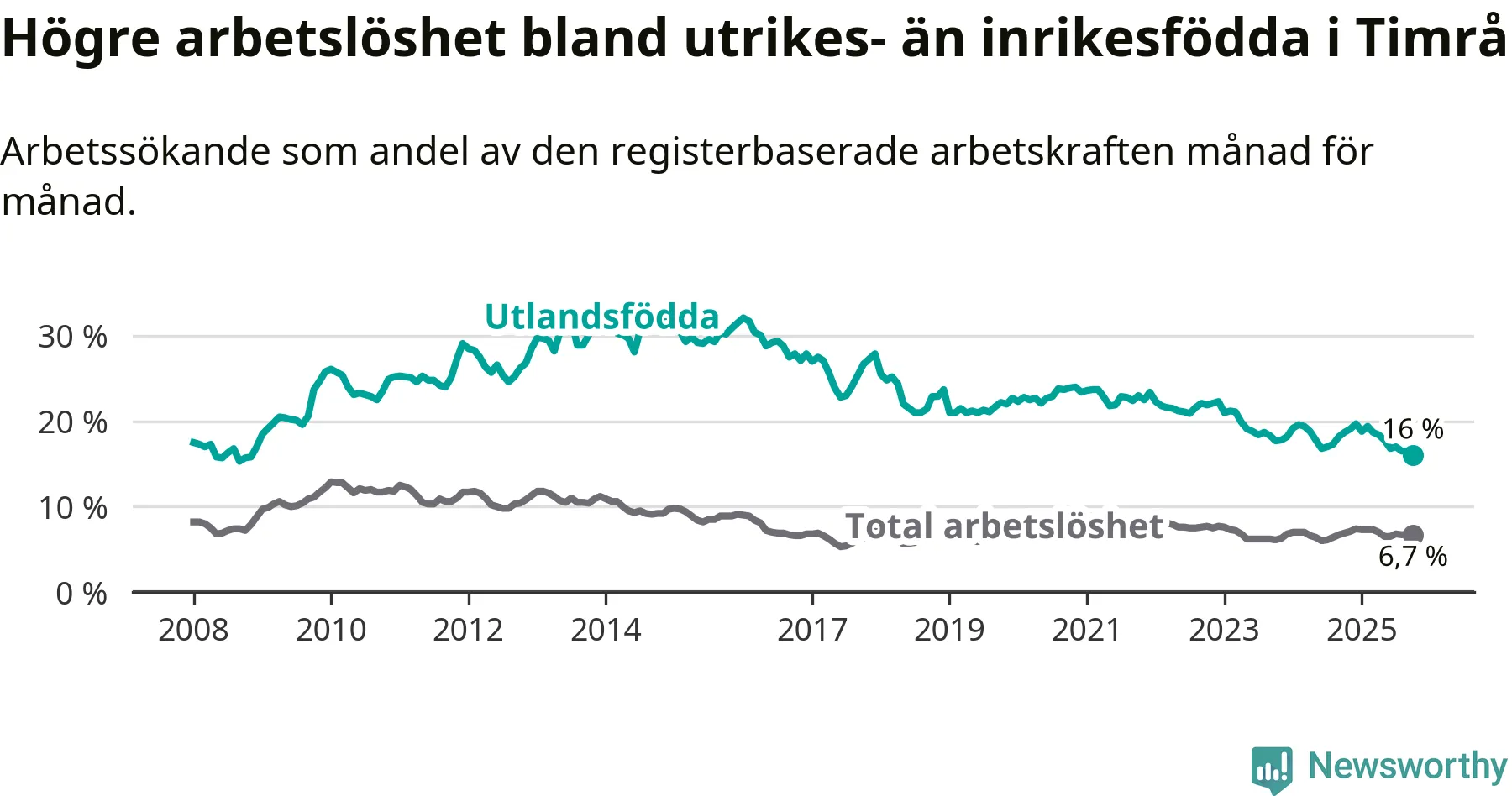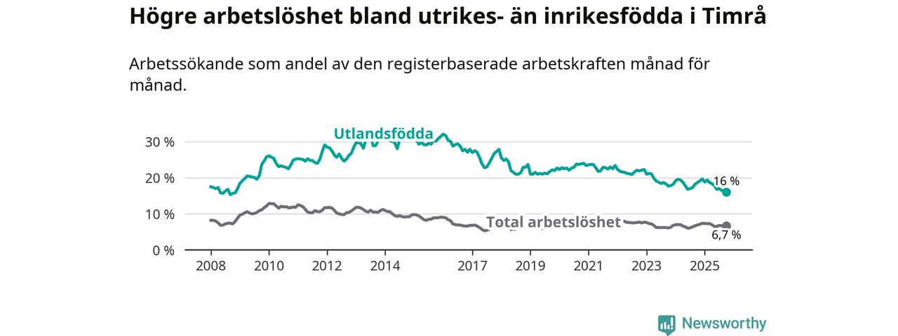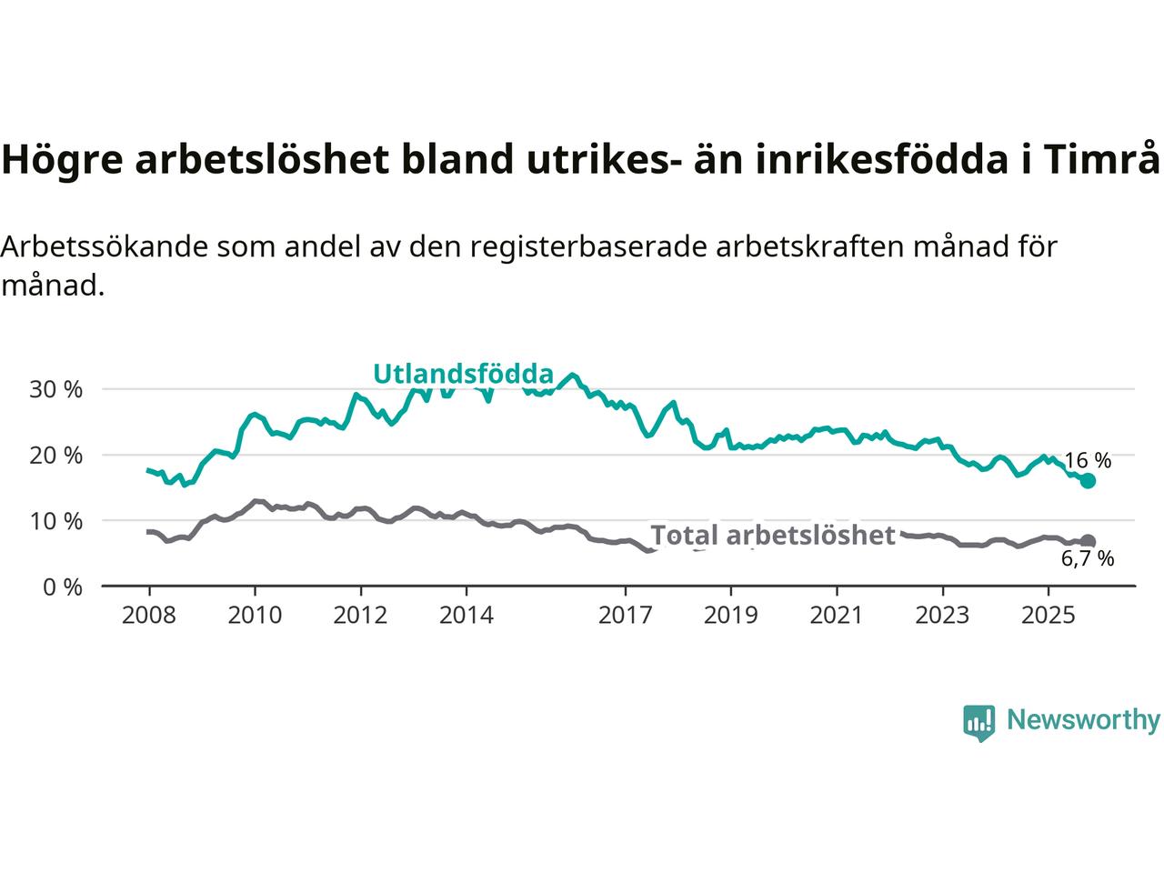Arbetslösheten bland utlandsfödda var 16,0 procent i Timrå under oktober månad, motsvarande 172 av 1 075 personer. Det är 2,7 procentenheter färre än vid samma tidpunkt i fjol (−30 om man räknar personer). Den nuvarande arbetslöshetsnivån är den lägsta sedan november 2008.