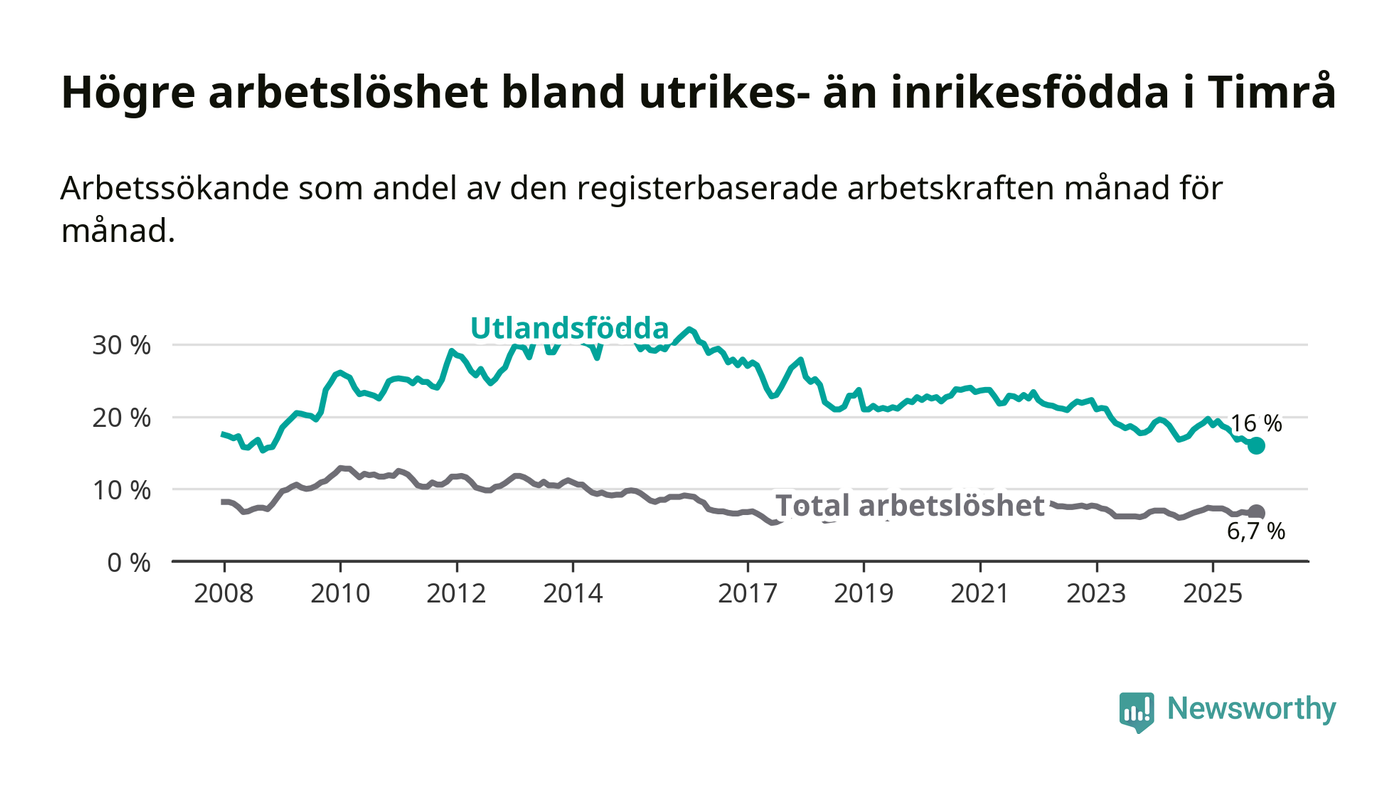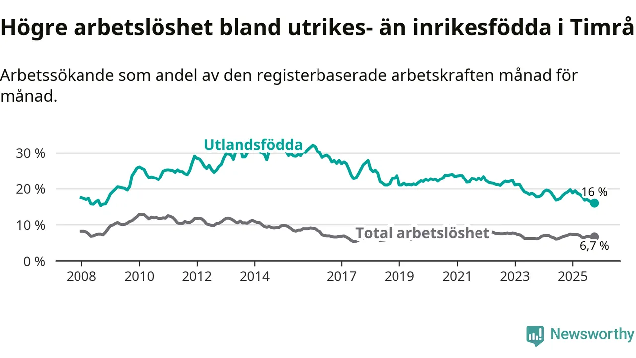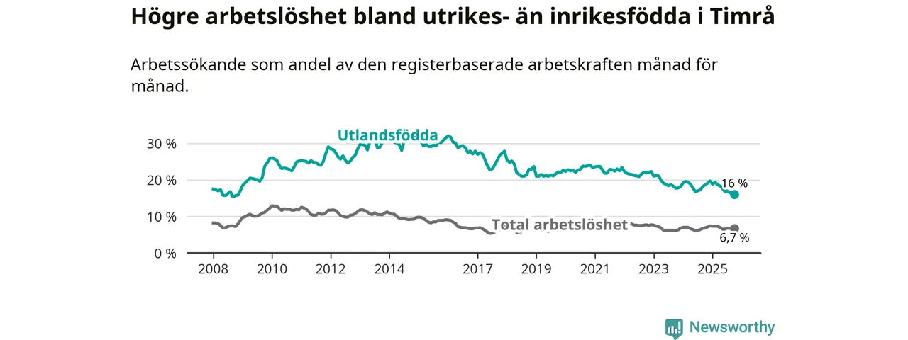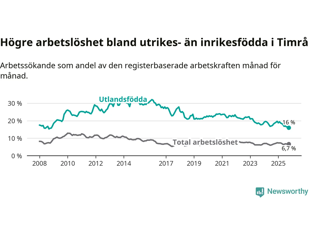 Skillnaden i arbetslöshet mellan utrikesfödda och hela befolkningen är 9,3 procentenheter i Timrå. Det är en betydligt mindre skillnad än för ett år sedan (−2,5 procentenheter).