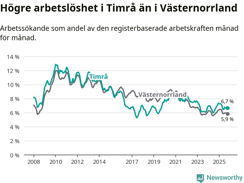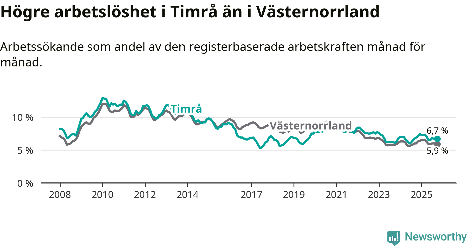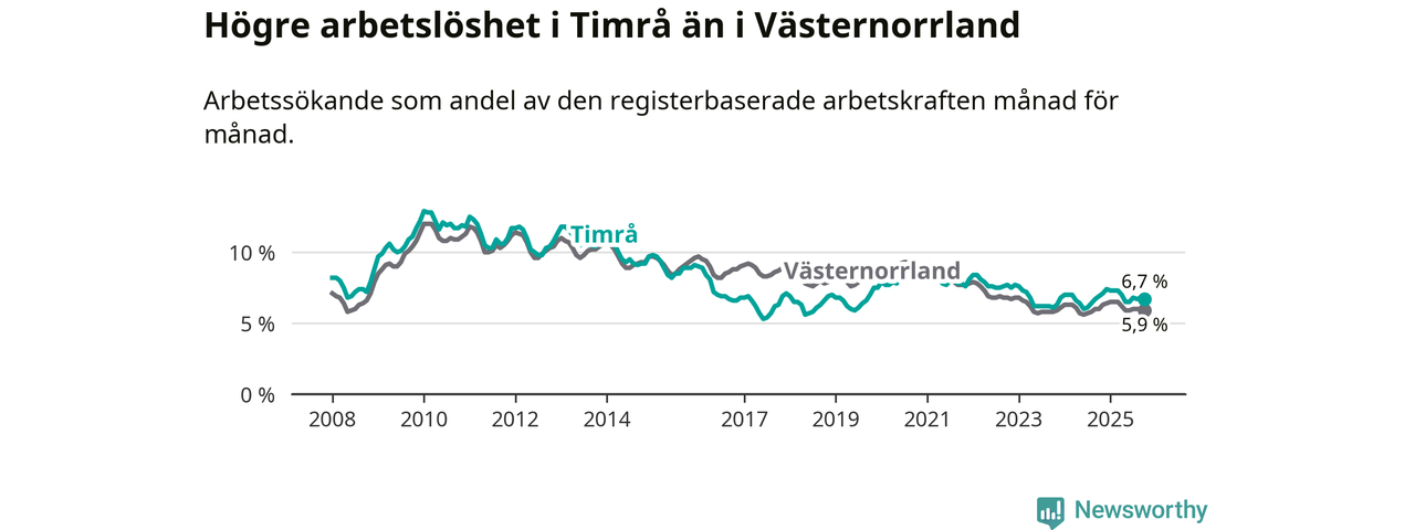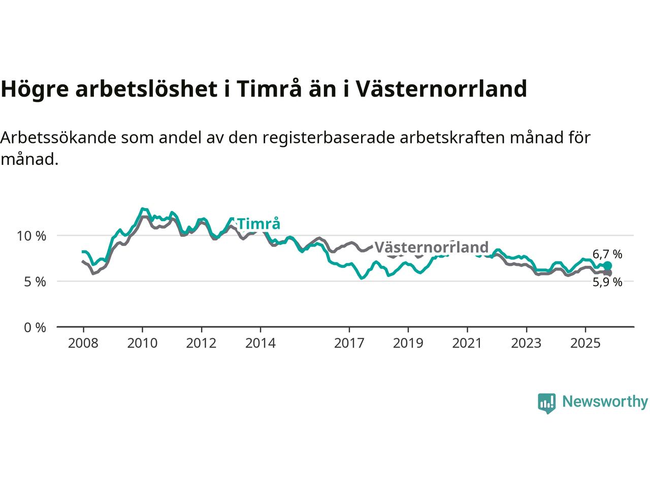 Under oktober månad rapporterade Timrå kommun en total arbetslöshet på 6,7 procent. Det är en minskning jämfört med samma tidpunkt i fjol (−0,2 procentenheter). Även i Västernorrlands län sjunker arbetslösheten något.