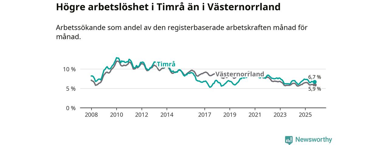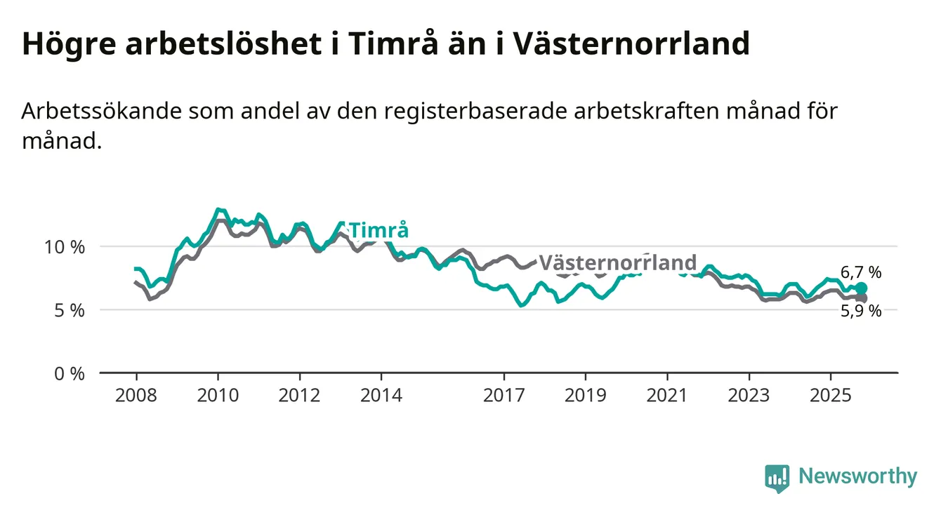 Sedan juli 2024 har arbetslösheten i Timrå kommun ökat, men i oktober vände utvecklingen då andelen arbetslösa sjönk jämfört med året innan.
