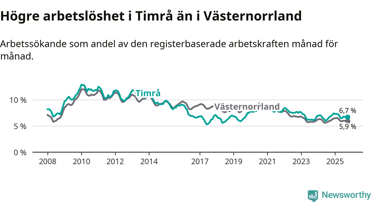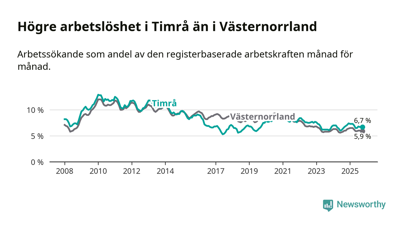 Även om arbetslösheten i Timrå alltså minskar, så ligger den fortfarande över snittet i hela Västernorrlands län (6,7 procent i kommunen, jämfört med 5,9 procent i hela länet). Örnsköldsvik har den lägsta arbetslösheten i länet (5,0 procent), medan Härnösand har den högsta (8,1 procent). För att Timrå skulle komma ner i samma arbetslöshetsnivå som Örnsköldsvik skulle 147 personer behöva sysselsättas.
