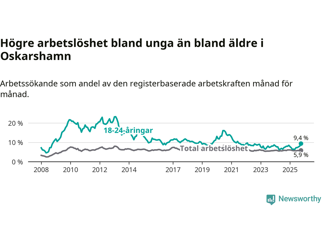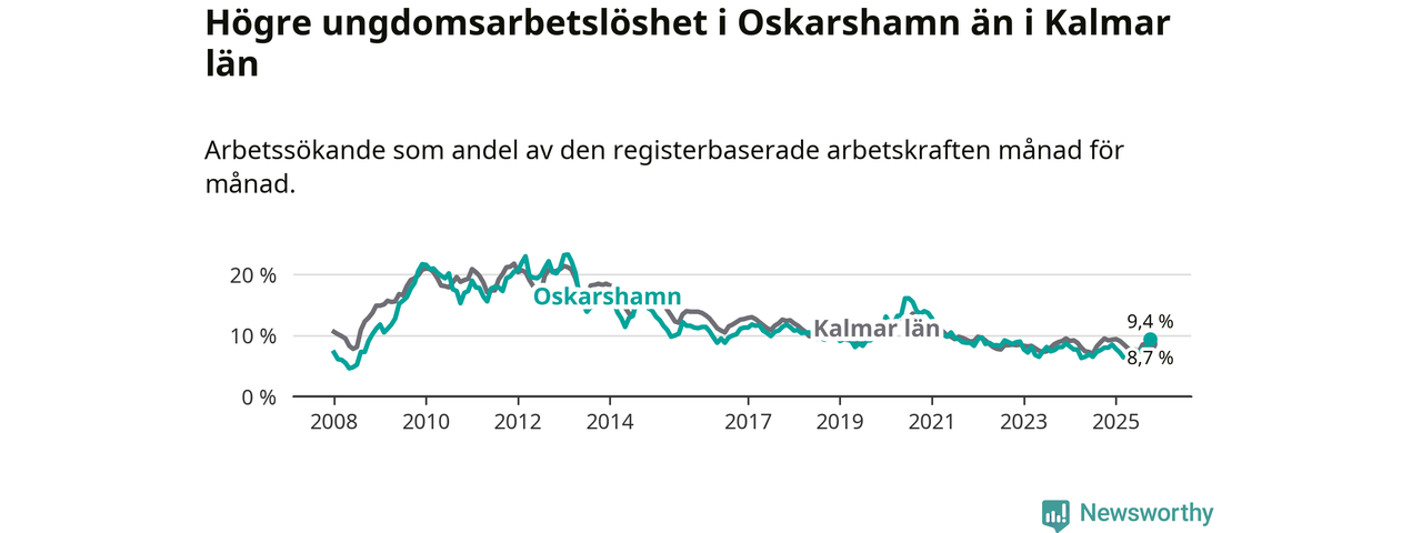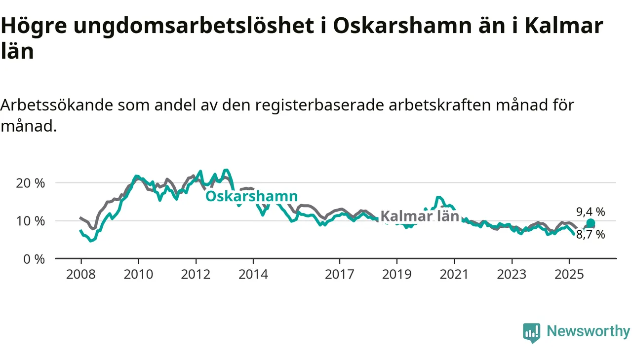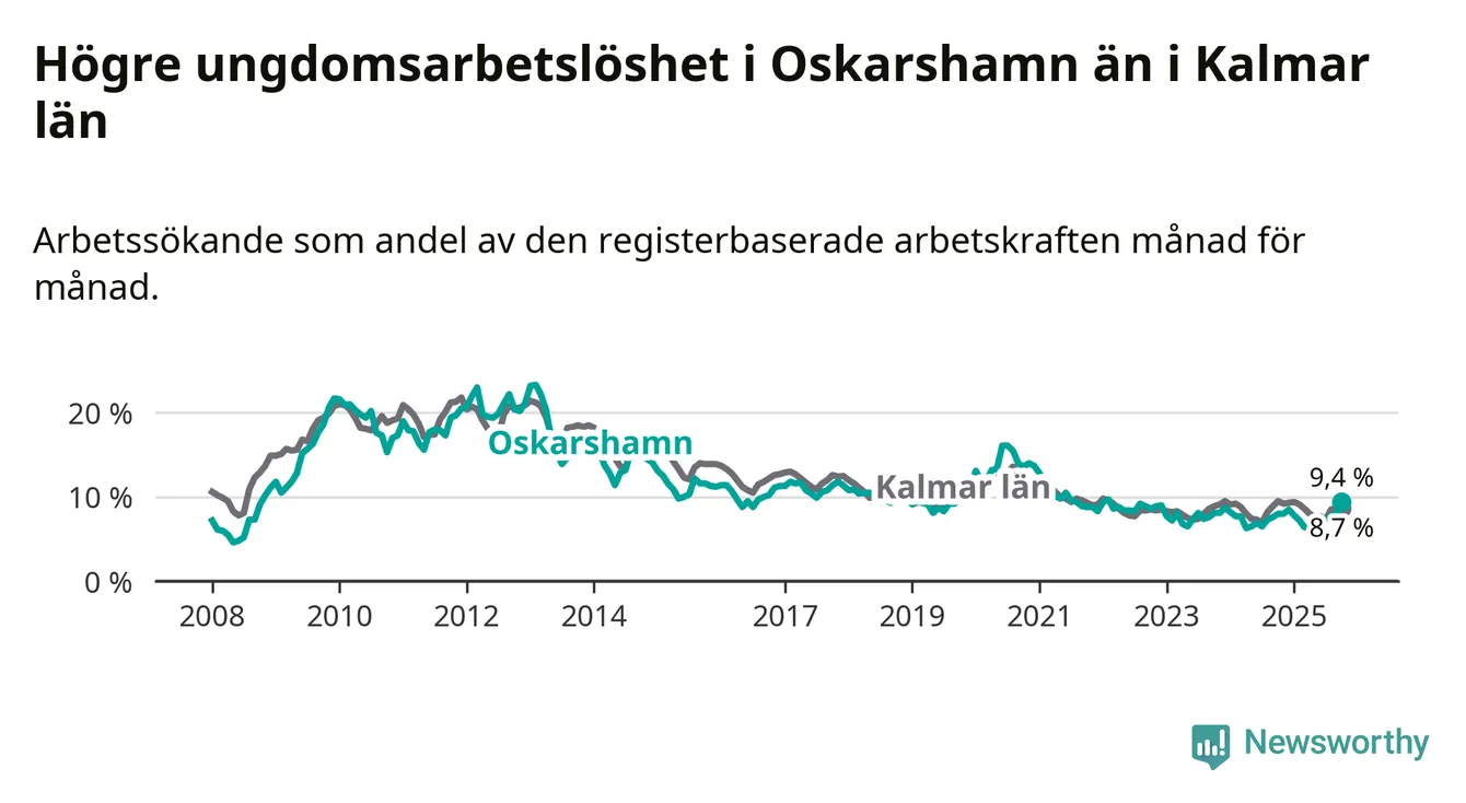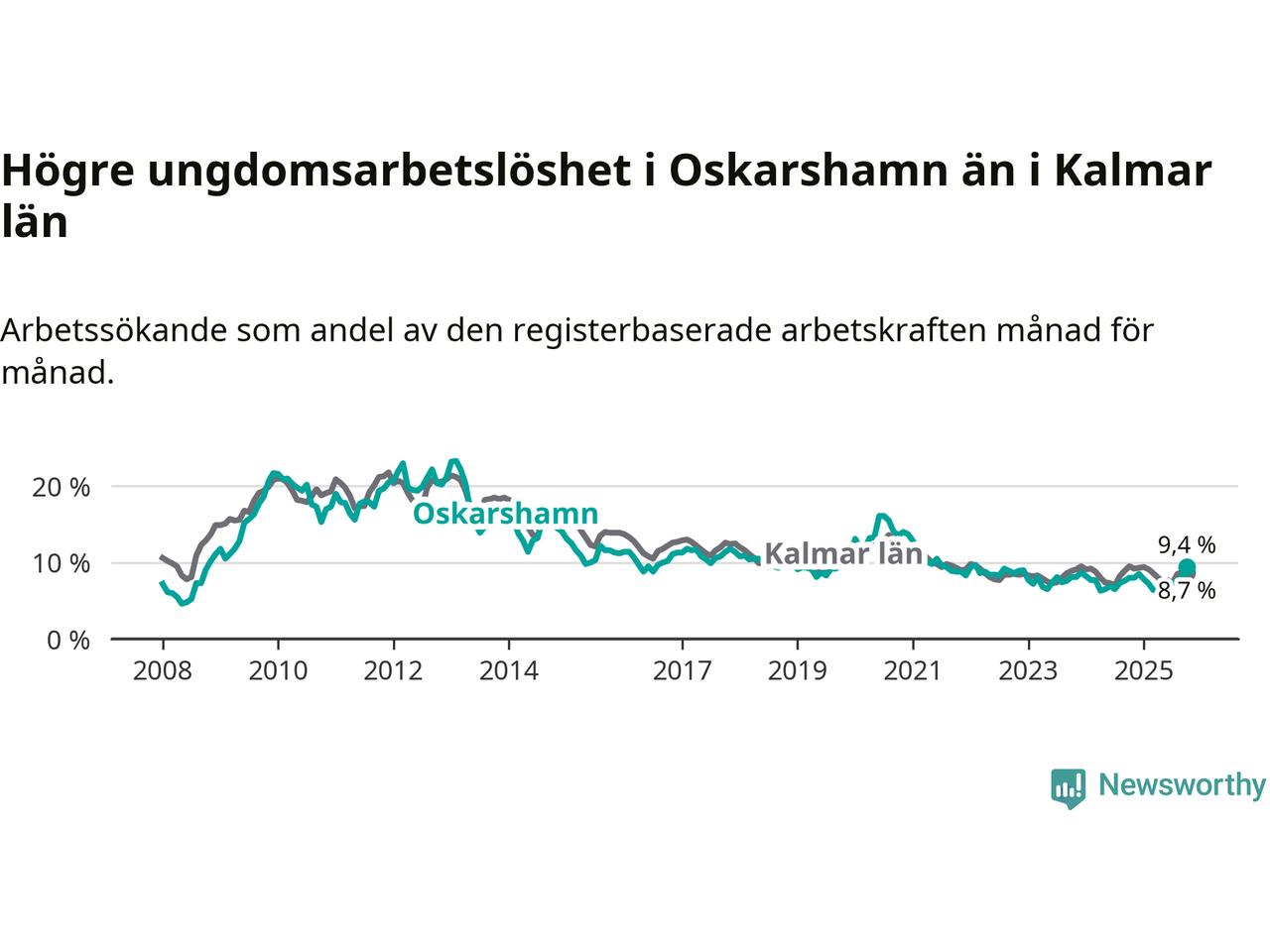 Medan Oskarshamn har lägre total arbetslöshet än Kalmar län, ligger ungdomsarbetslösheten 0,7 procentenheter högre i Oskarshamn.