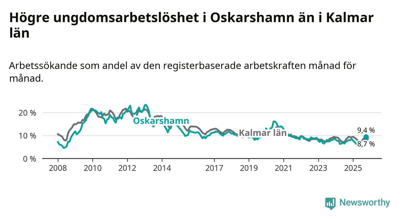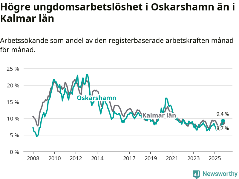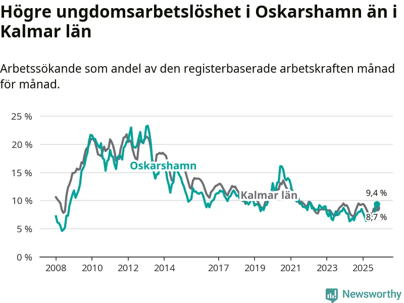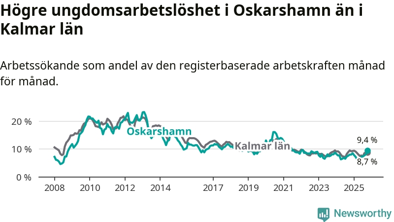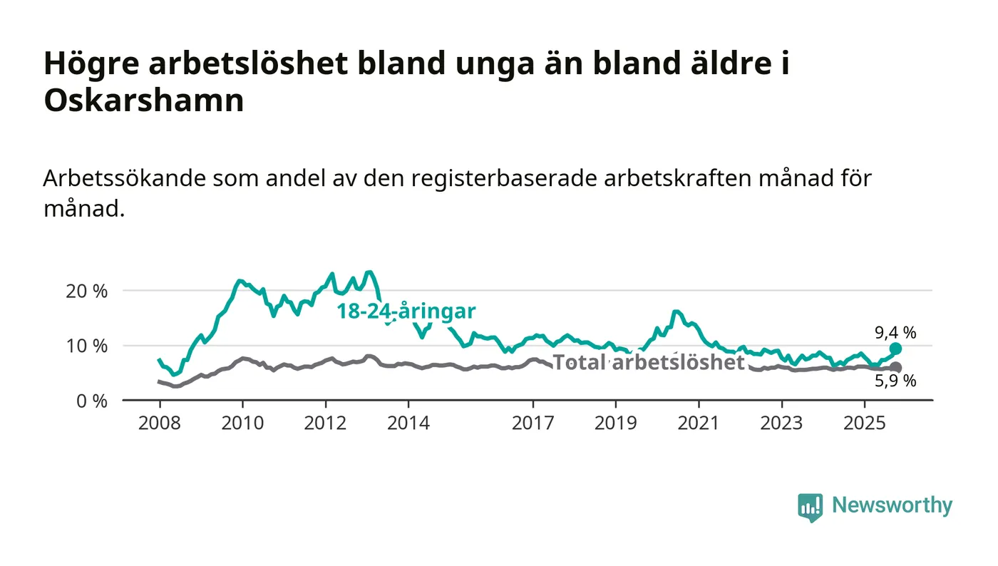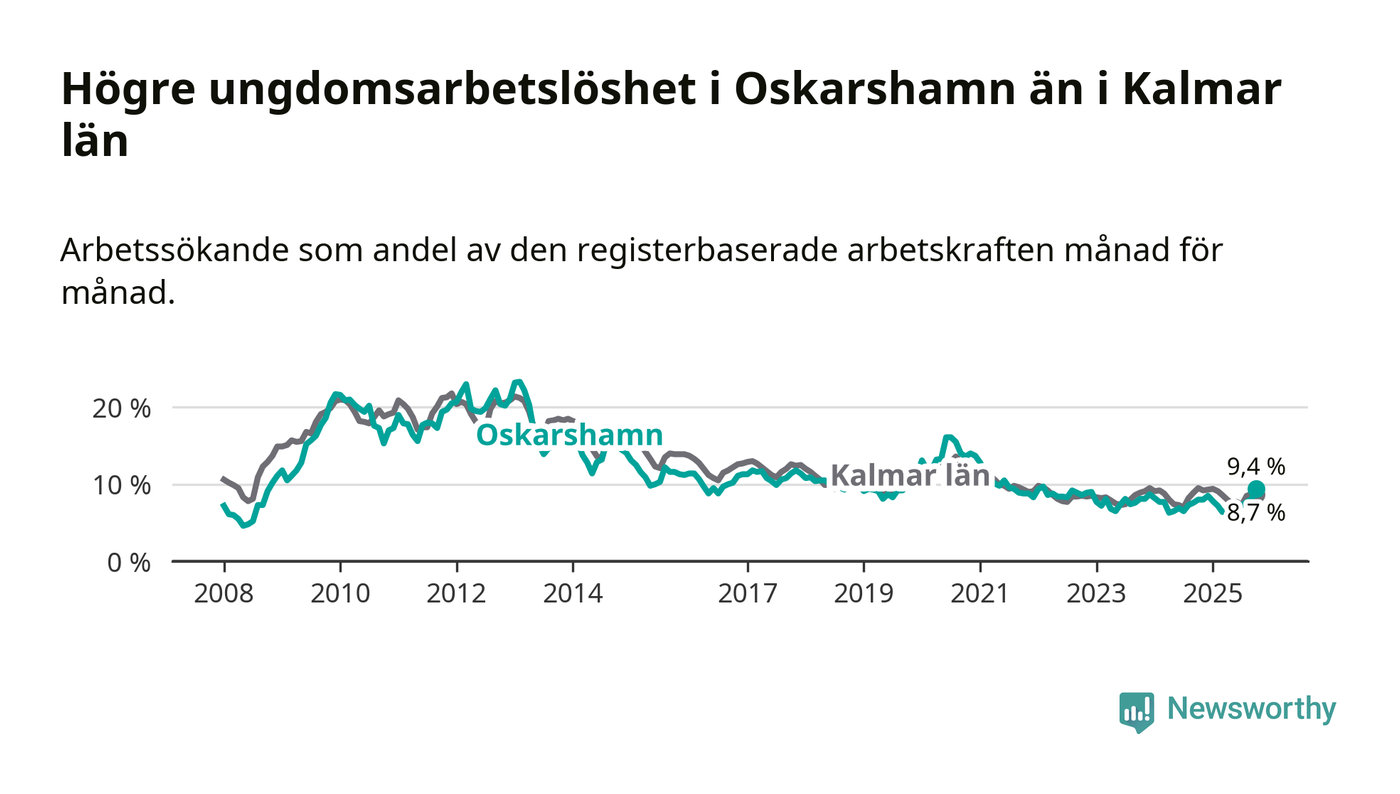 Medan Oskarshamn har lägre total arbetslöshet än Kalmar län, ligger ungdomsarbetslösheten 0,7 procentenheter högre i Oskarshamn.