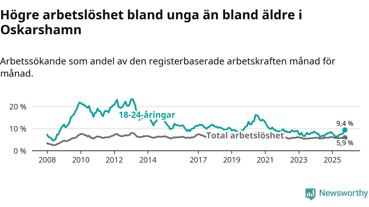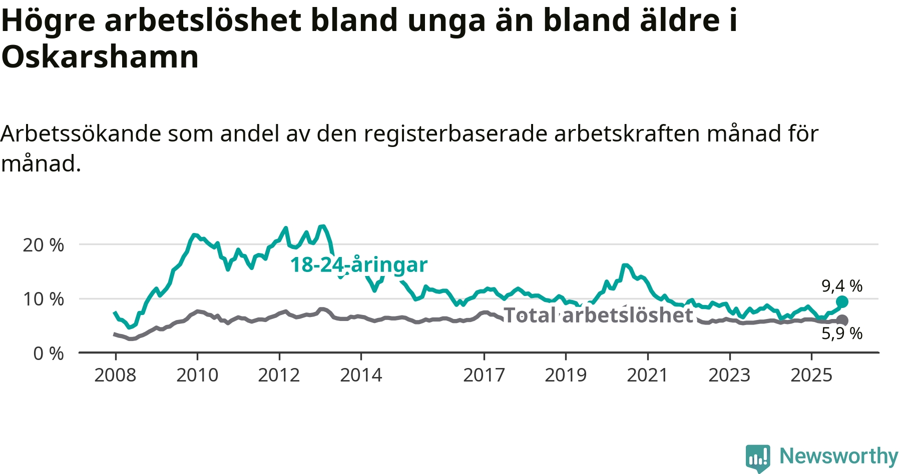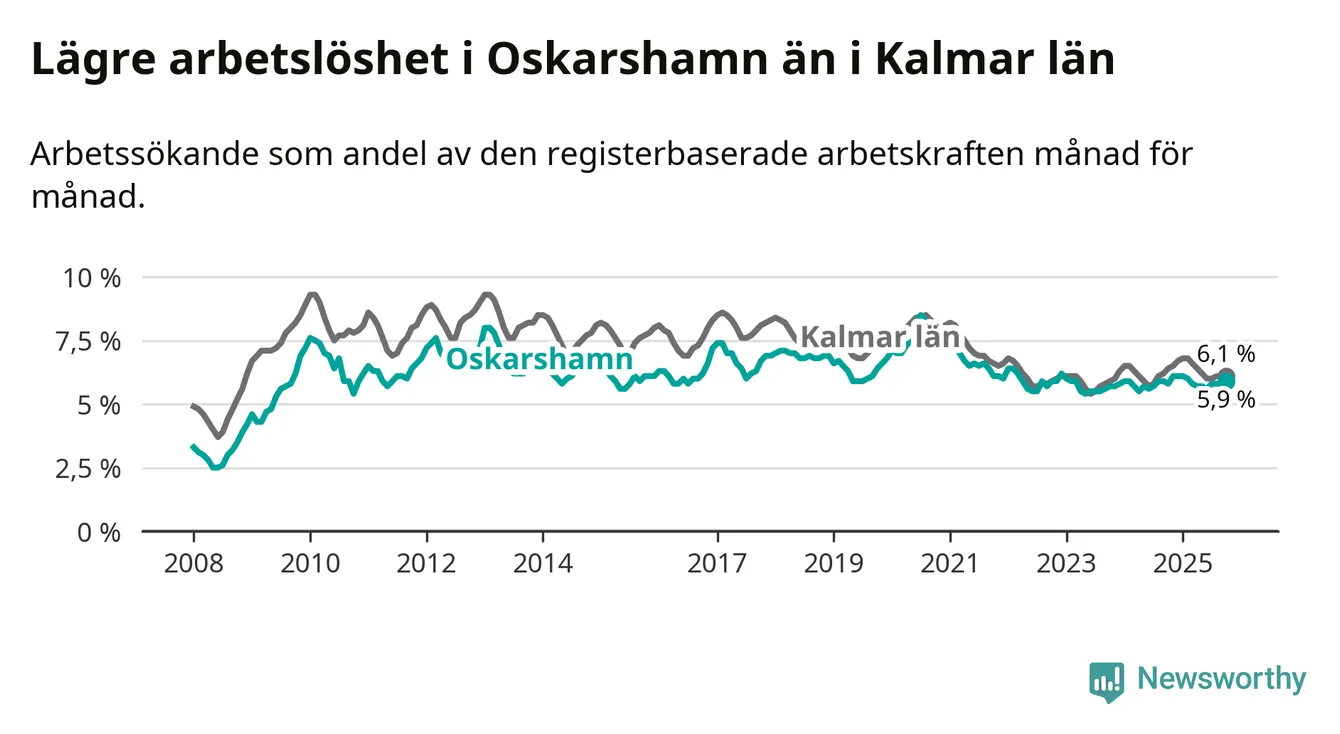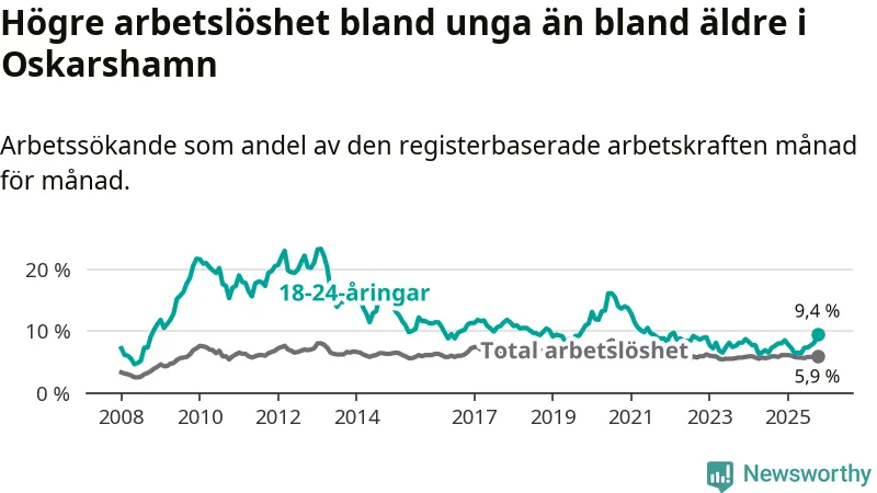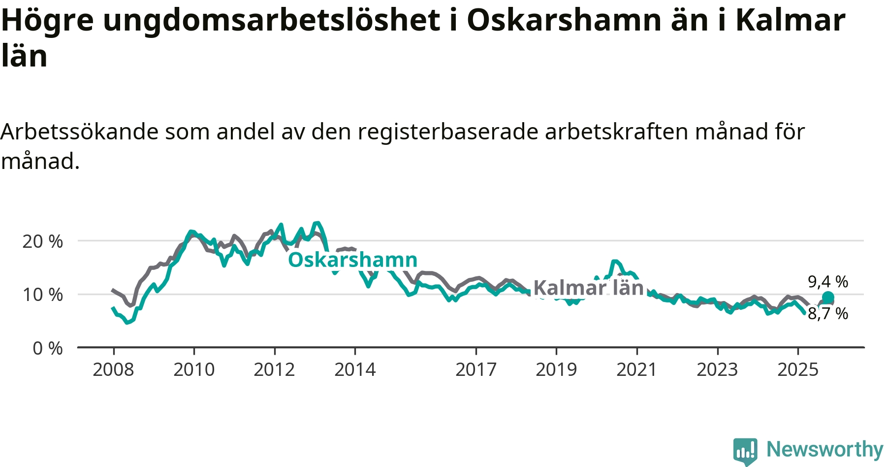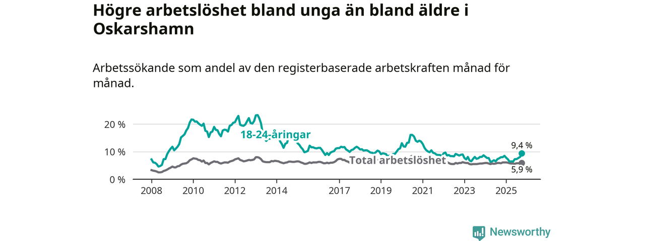 Medan Oskarshamn har lägre total arbetslöshet än Kalmar län, ligger ungdomsarbetslösheten 0,7 procentenheter högre i Oskarshamn.