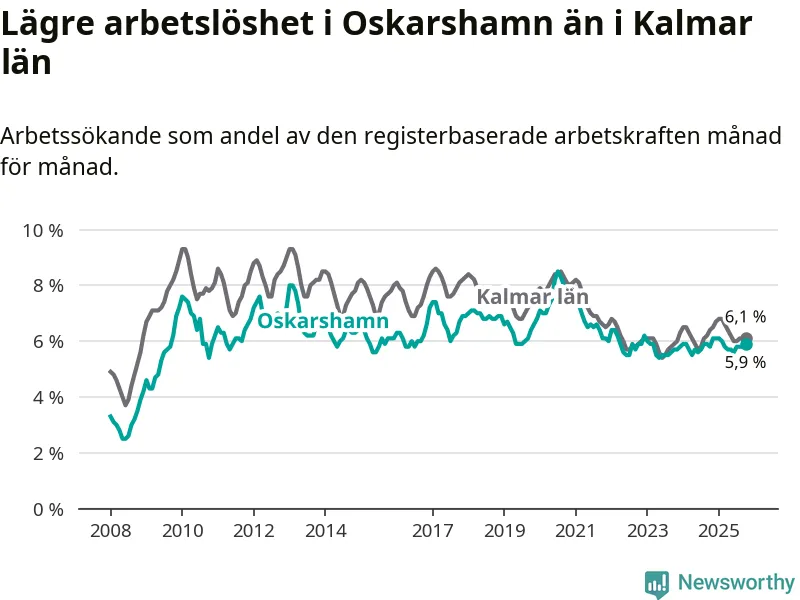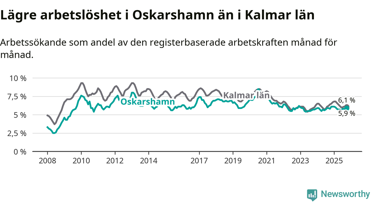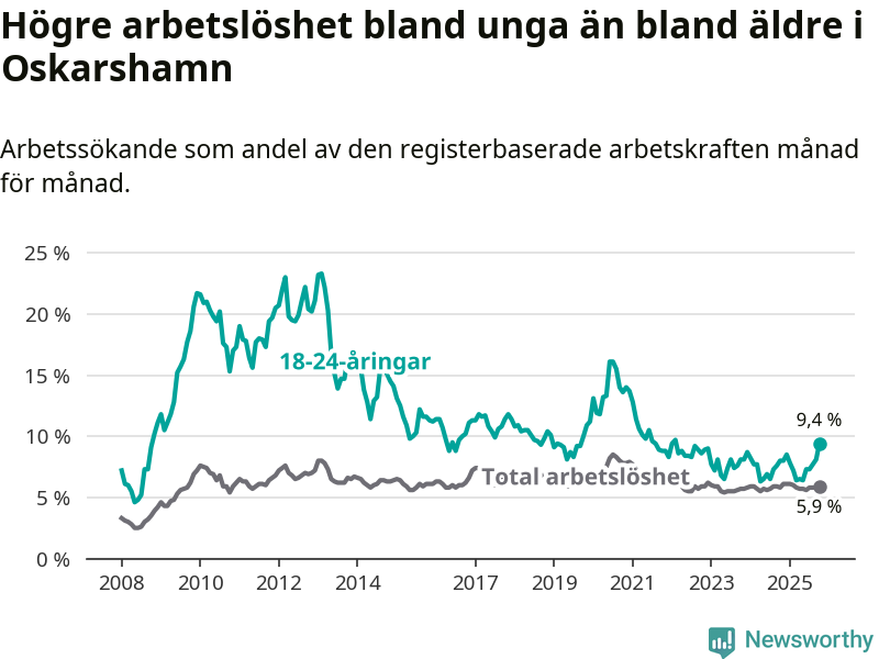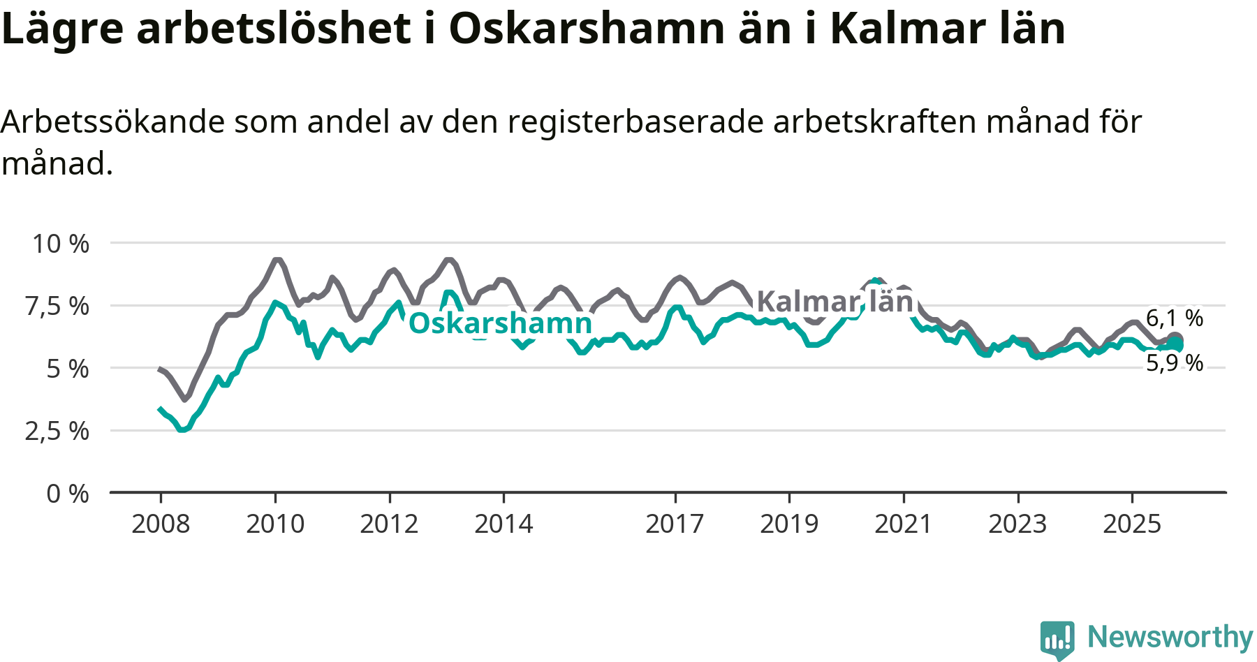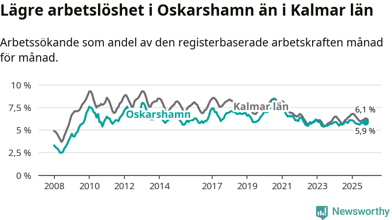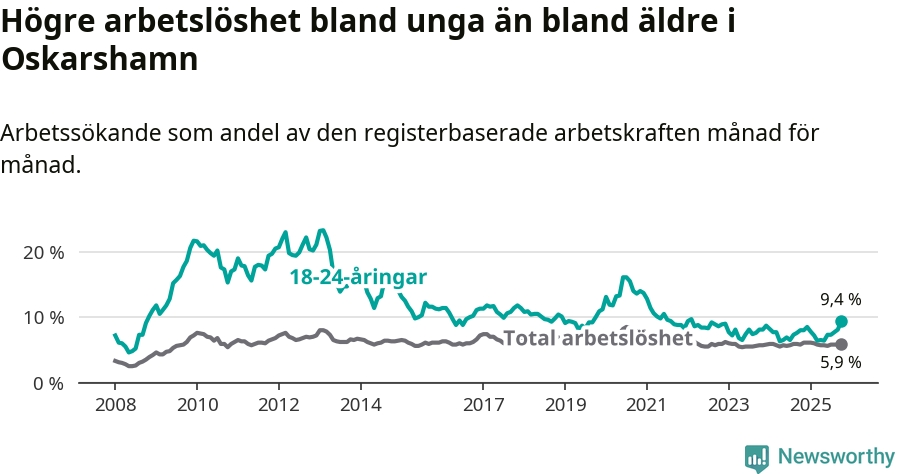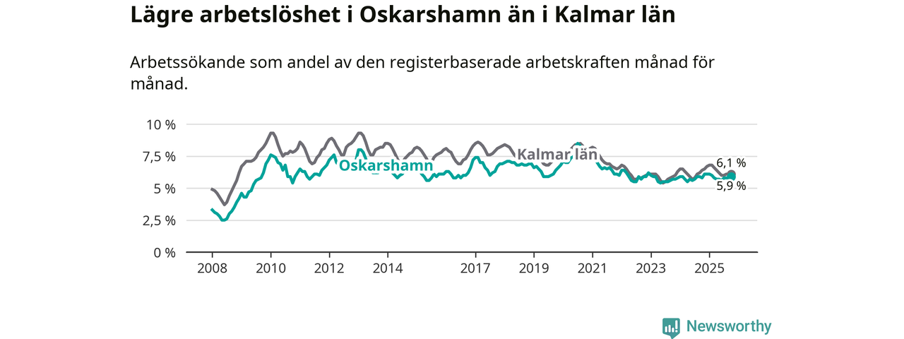 Medan Oskarshamn har lägre total arbetslöshet än Kalmar län, ligger ungdomsarbetslösheten 0,7 procentenheter högre i Oskarshamn.