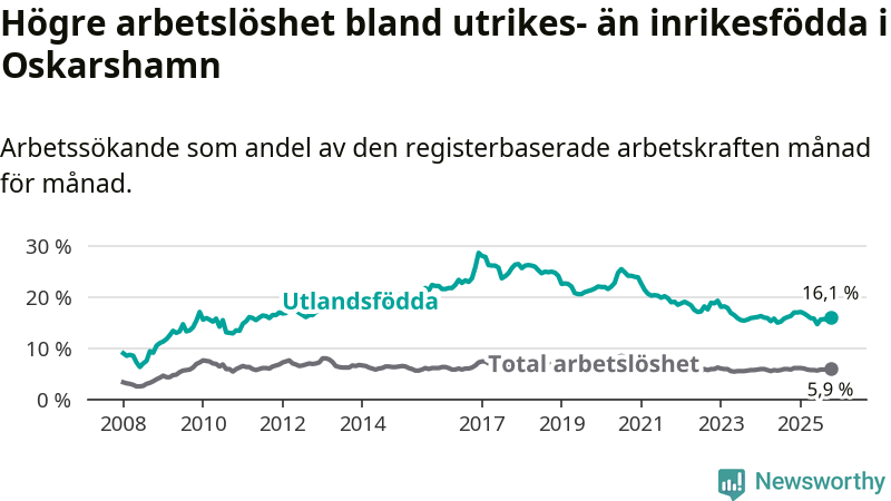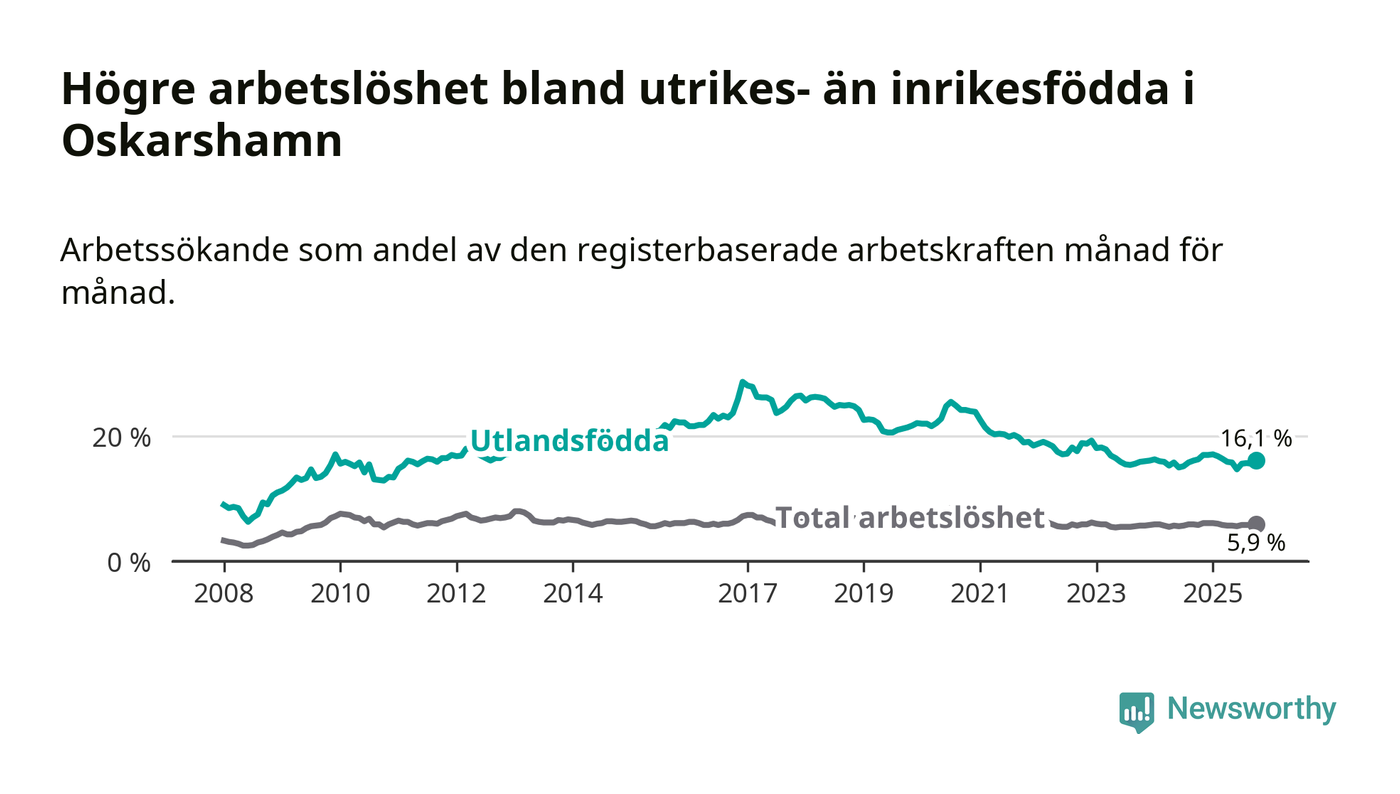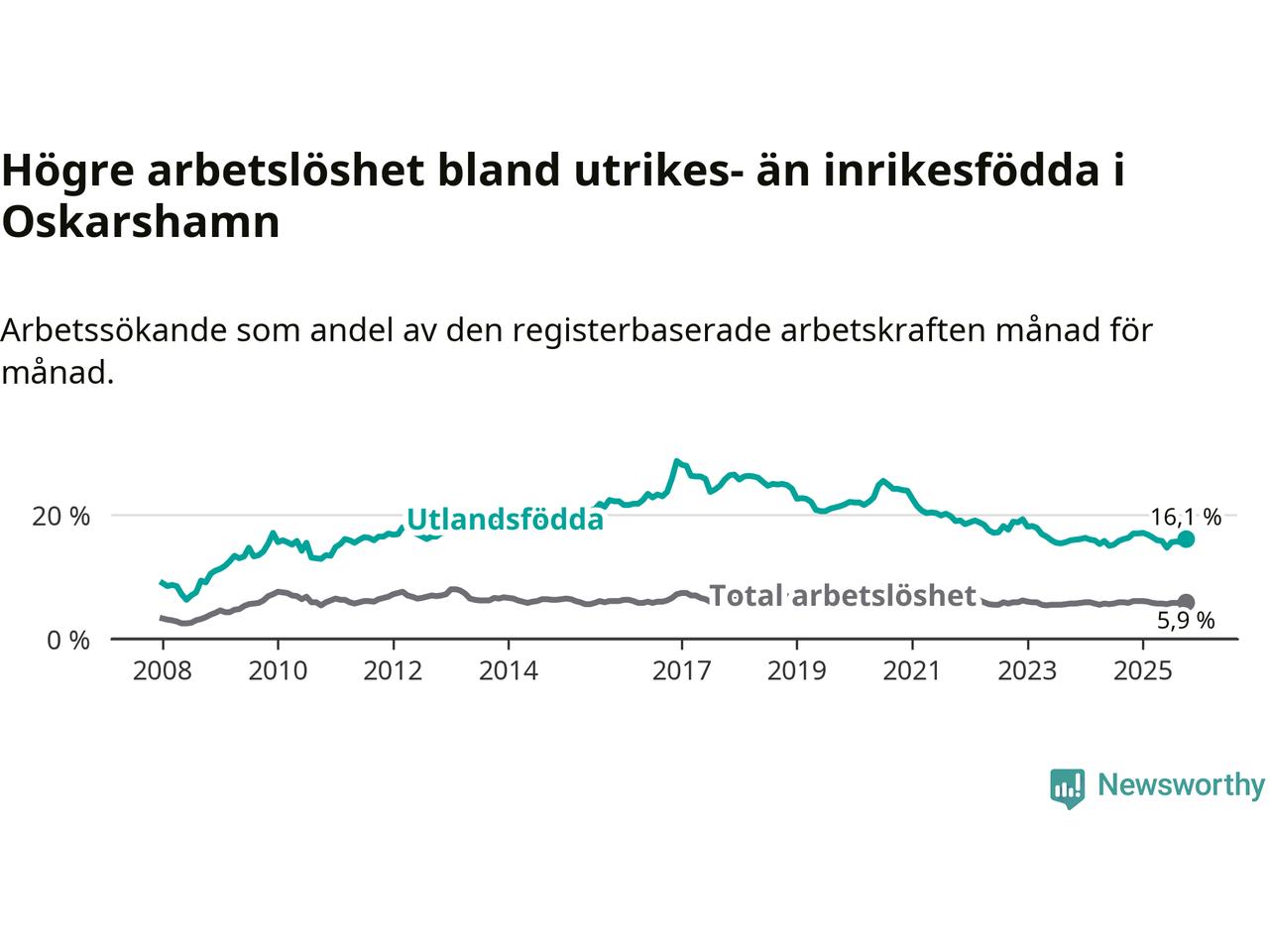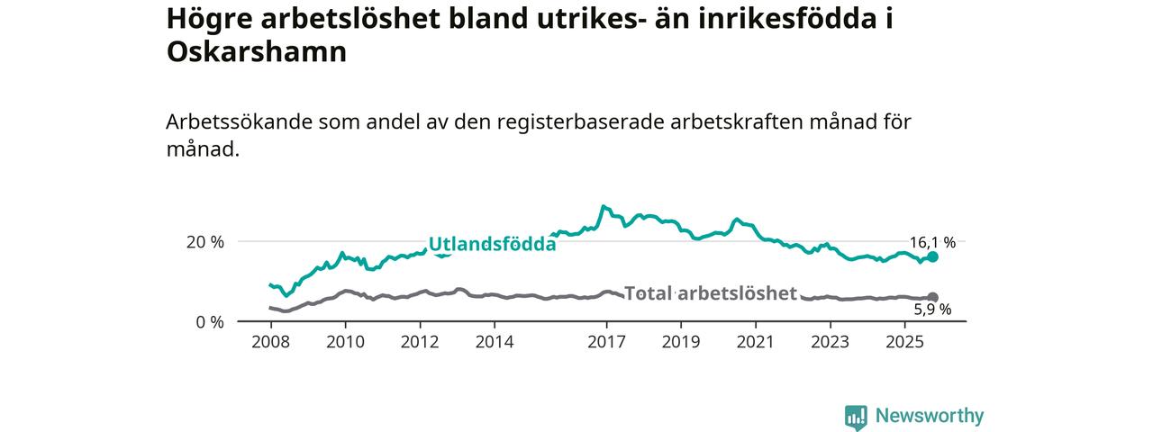 Arbetslösheten bland utlandsfödda var 16,1 procent i Oskarshamn under oktober månad, motsvarande 407 av 2 528 personer. Det är 0,2 procentenheter färre än vid samma tidpunkt i fjol (−7 om man räknar personer).