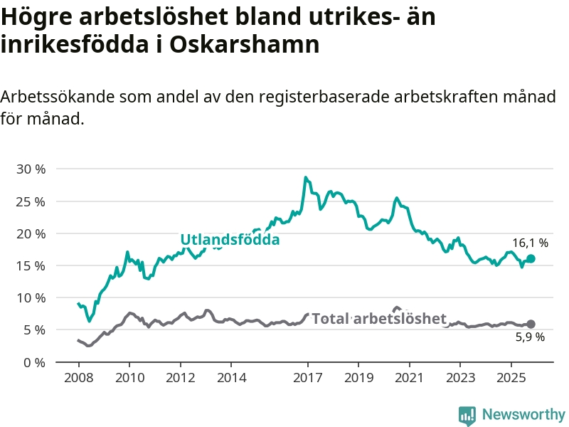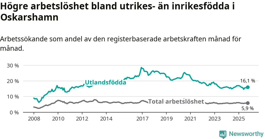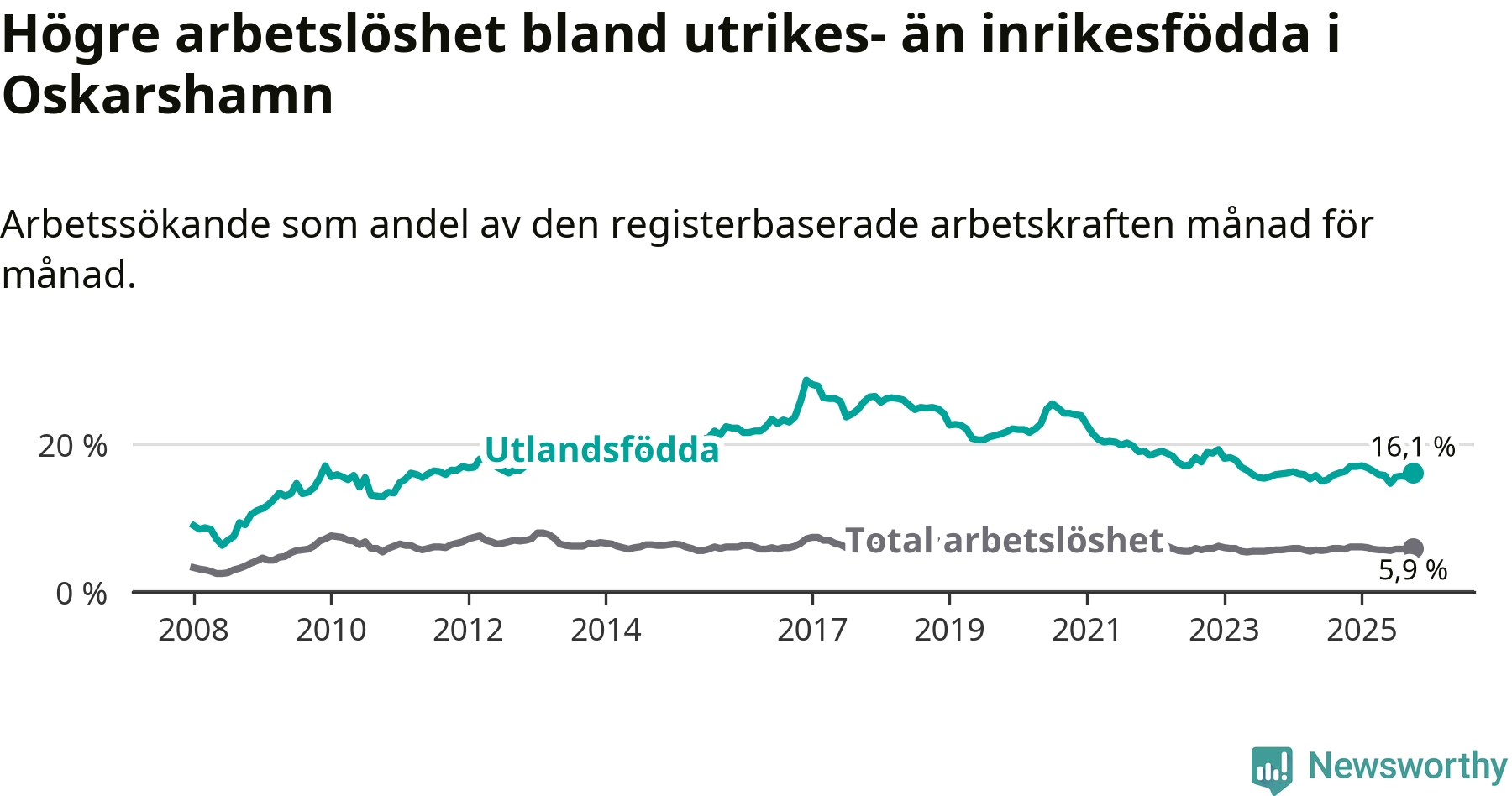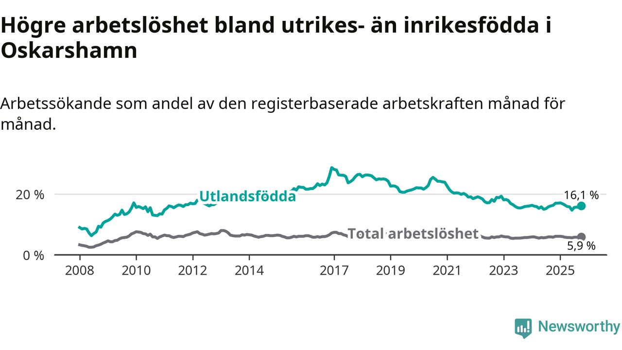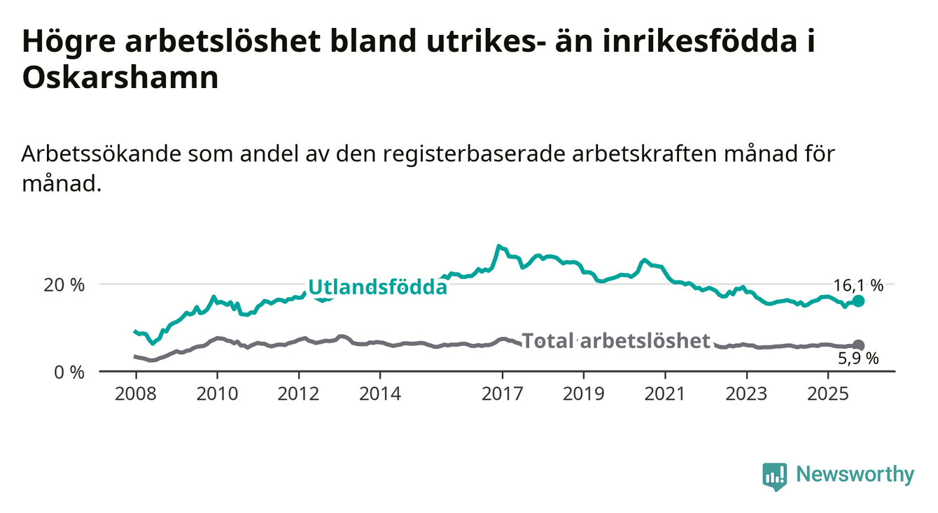 Arbetslösheten bland utlandsfödda var 16,1 procent i Oskarshamn under oktober månad, motsvarande 407 av 2 528 personer. Det är 0,2 procentenheter färre än vid samma tidpunkt i fjol (−7 om man räknar personer).